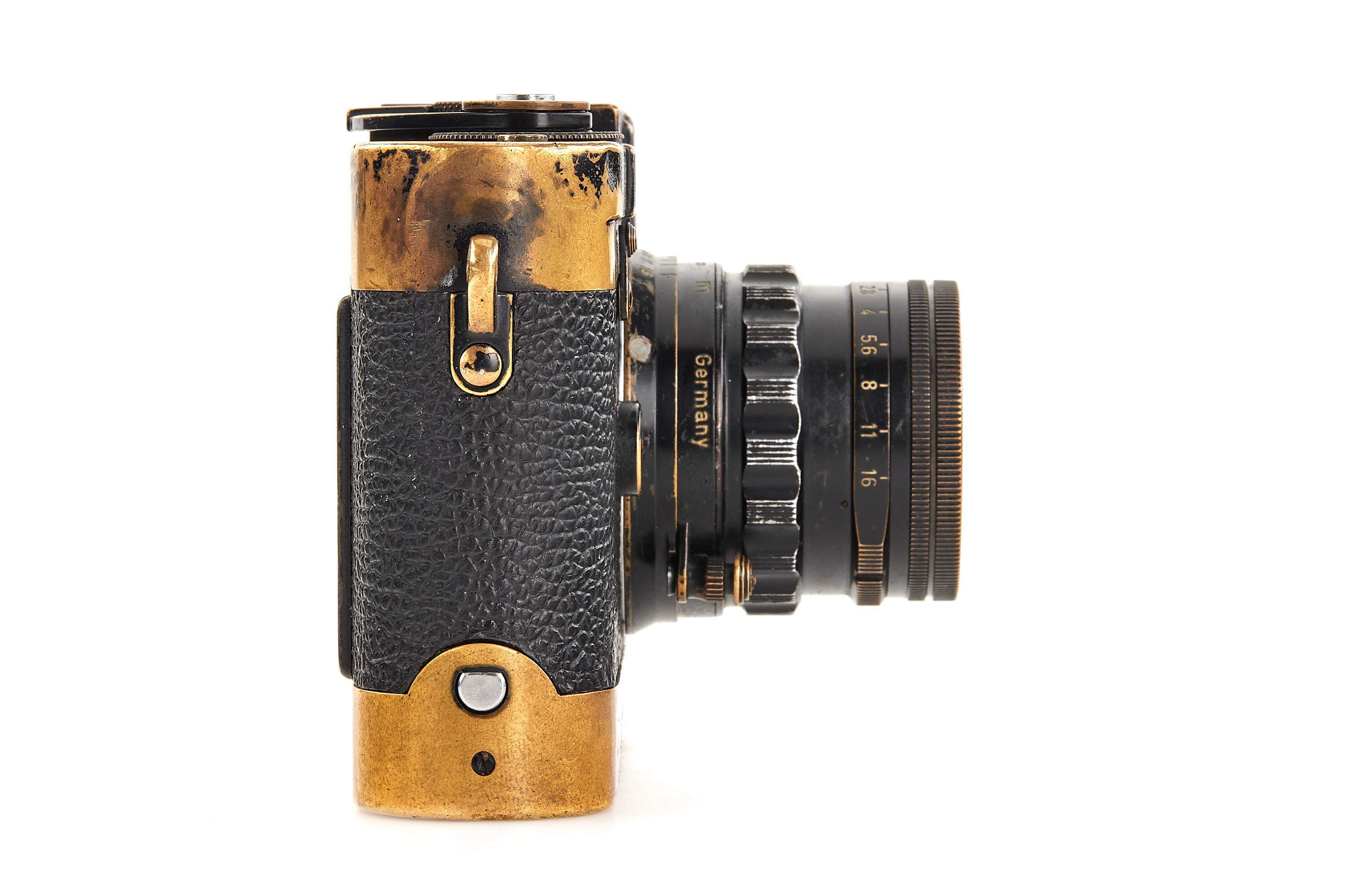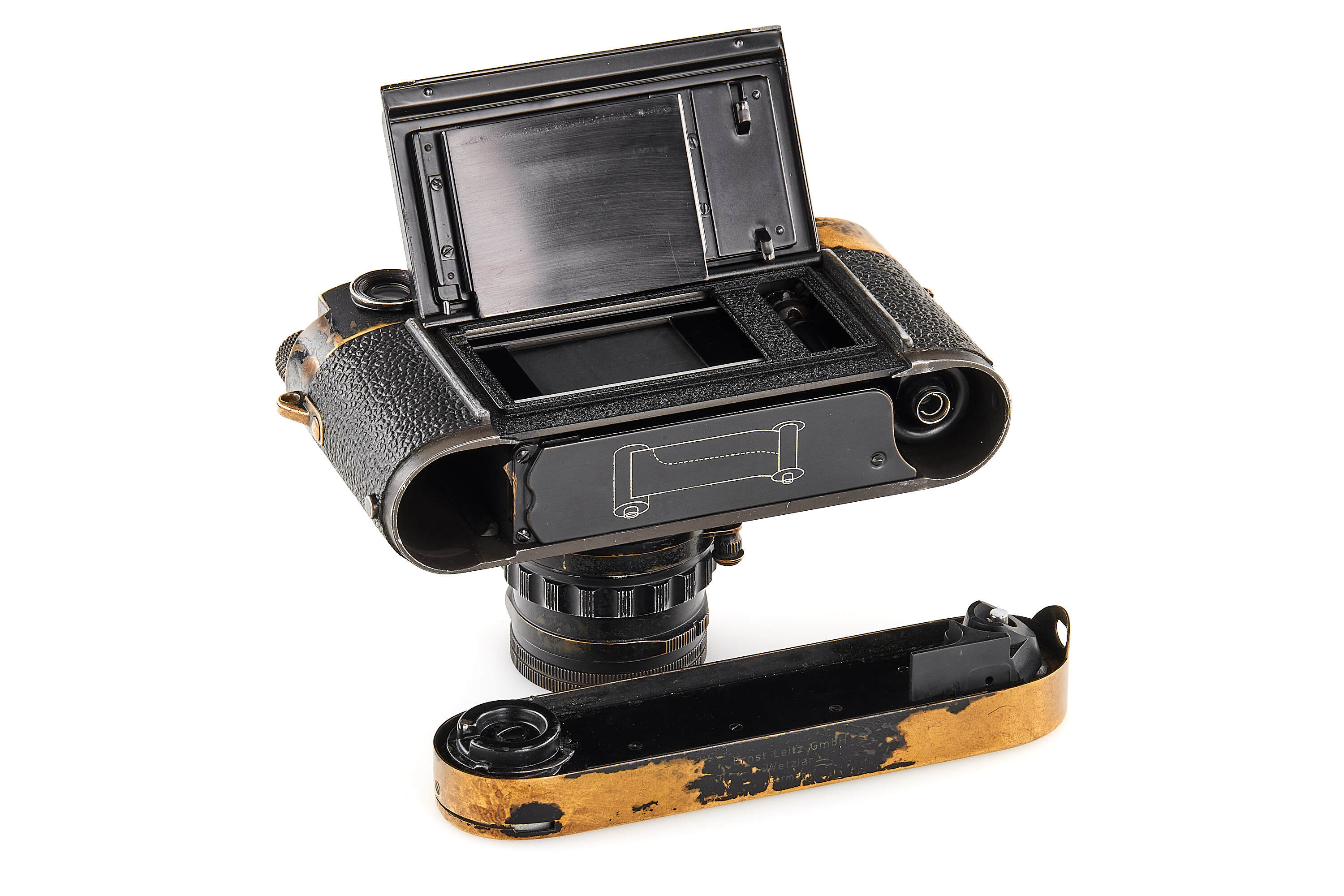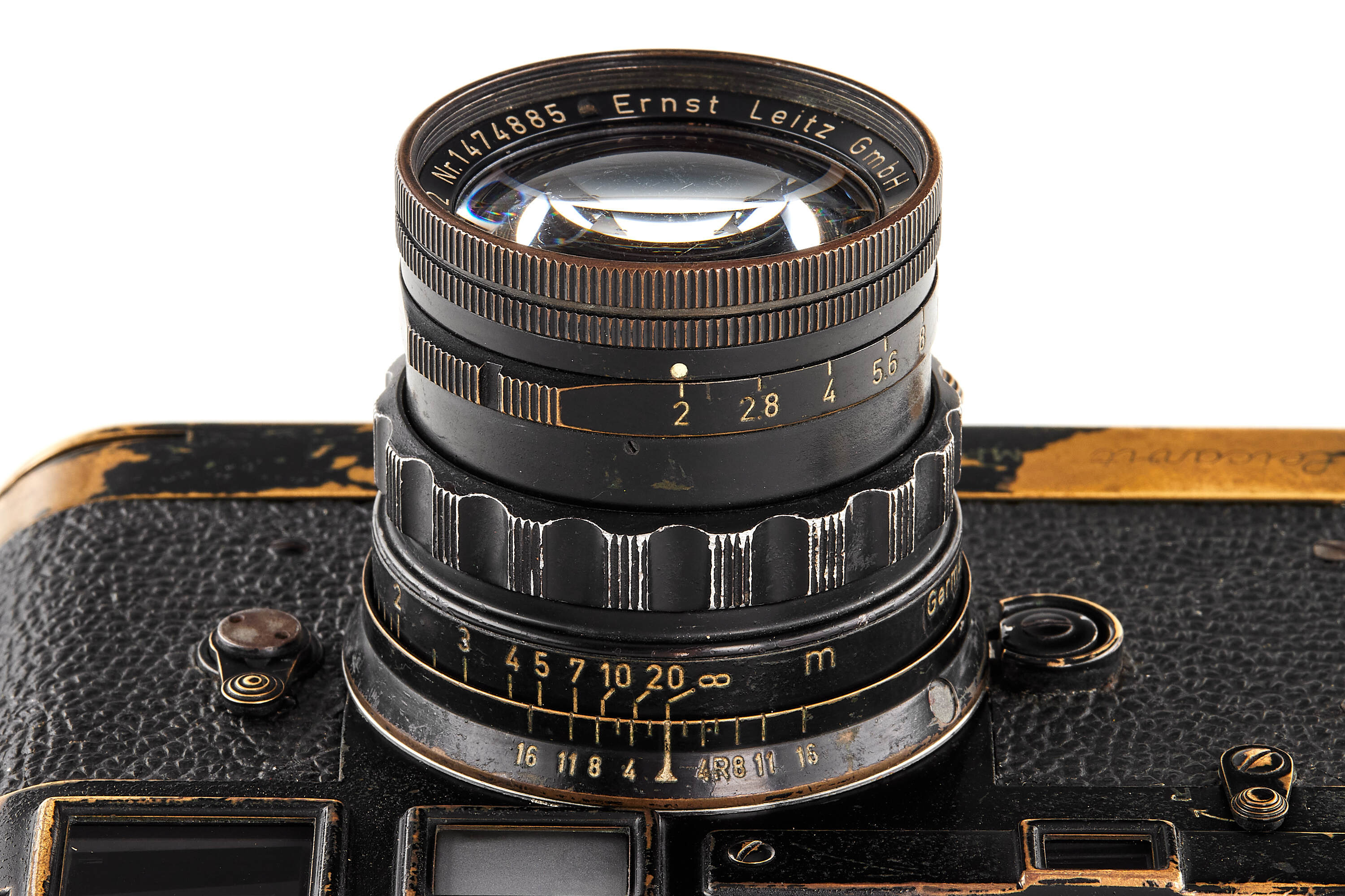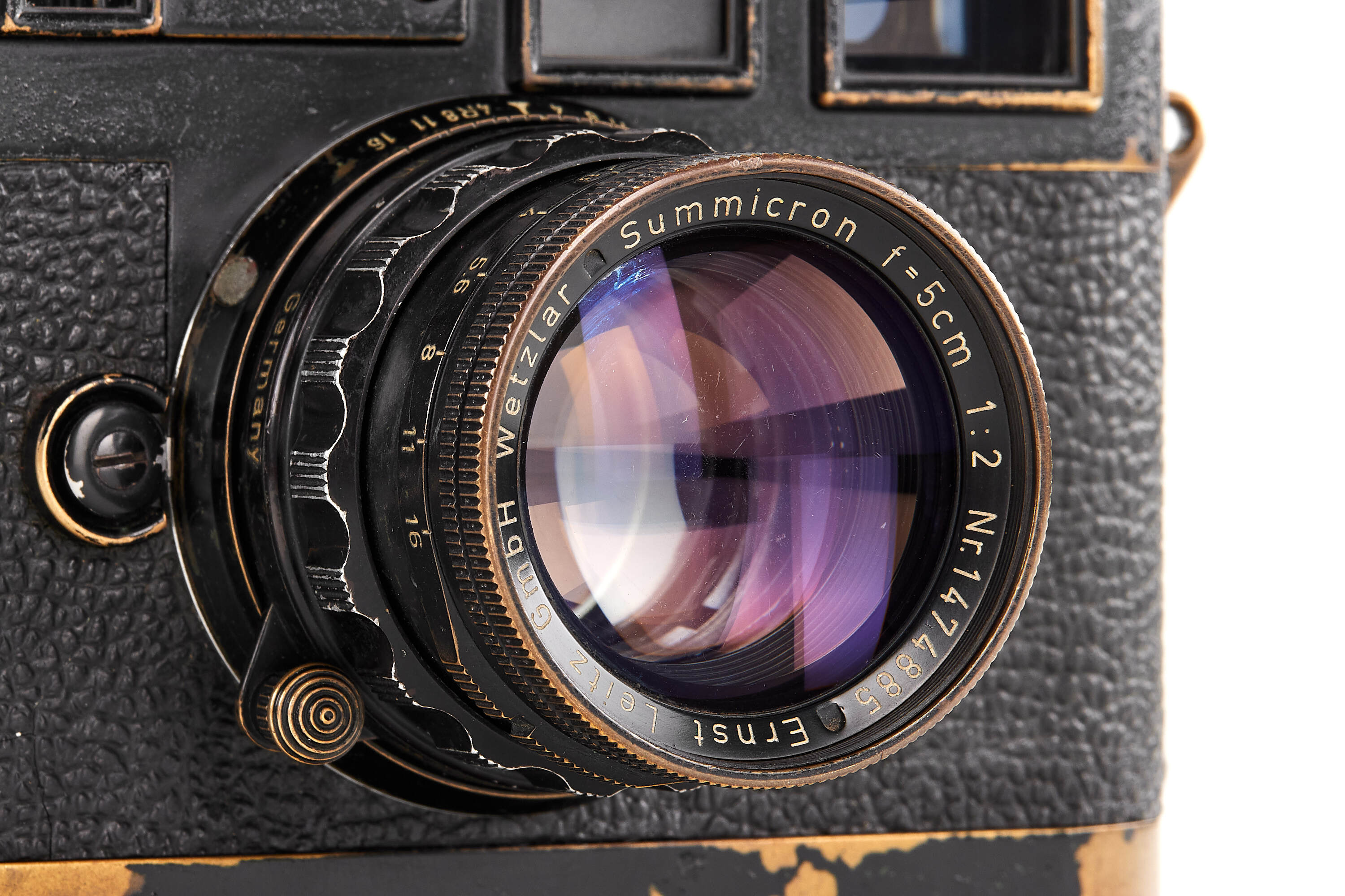 The example offered here, MP no. 33, is a highly desirable black paint version showing the distinctive patina and wear characteristic of years of professional use. Its beautifully aged surface, with subtle paint bubbling and brass highlights, enhances its authentic vintage appeal. The camera was originally delivered to Brandt, Sweden, on 29 July 1957, and is accompanied by a matching black paint Leicavit and a black paint / brass-mount Summicron 2/5cm lens no.1474885, which was delivered to the same dealer only one day later, on 30 July 1957.