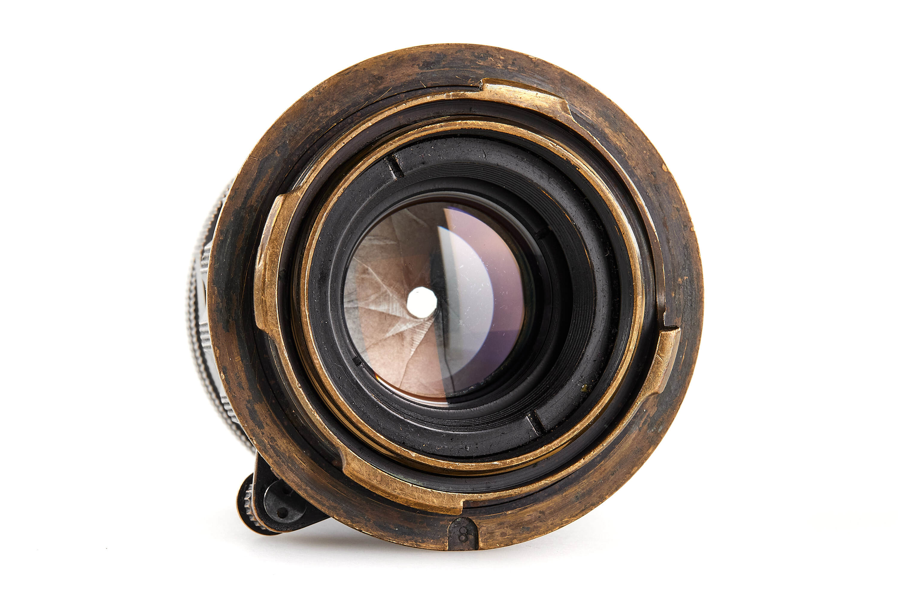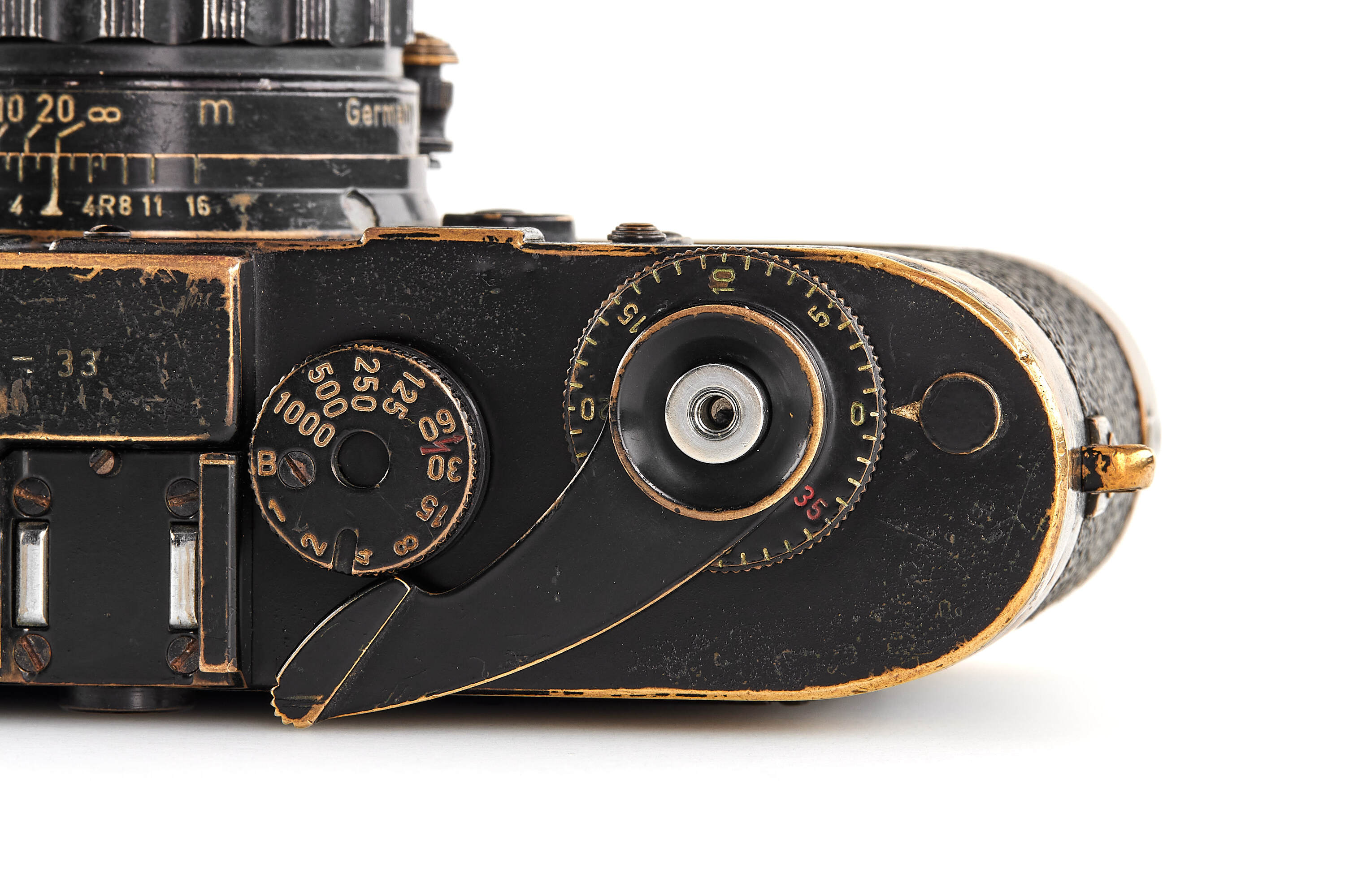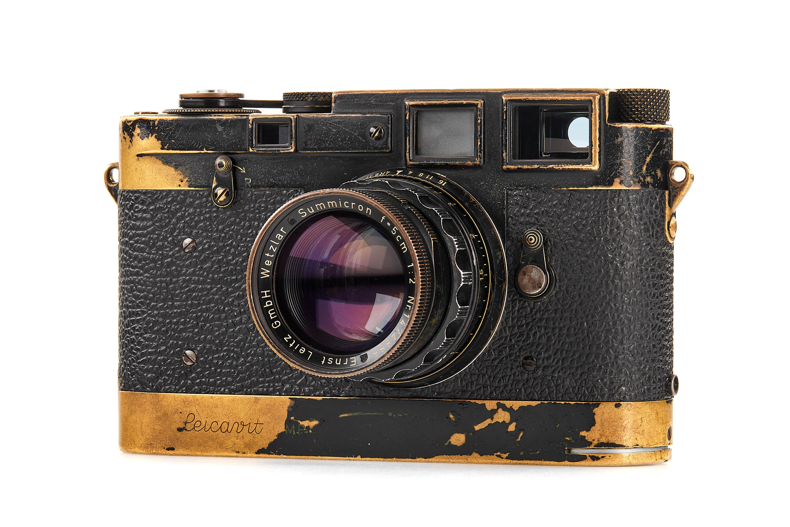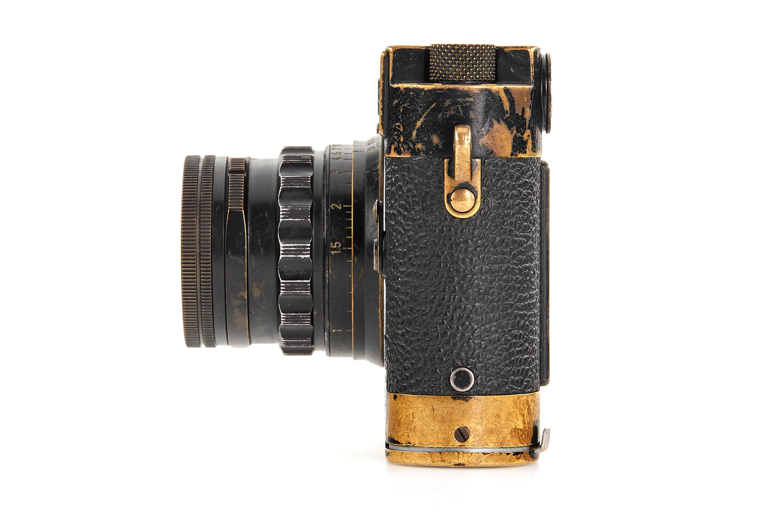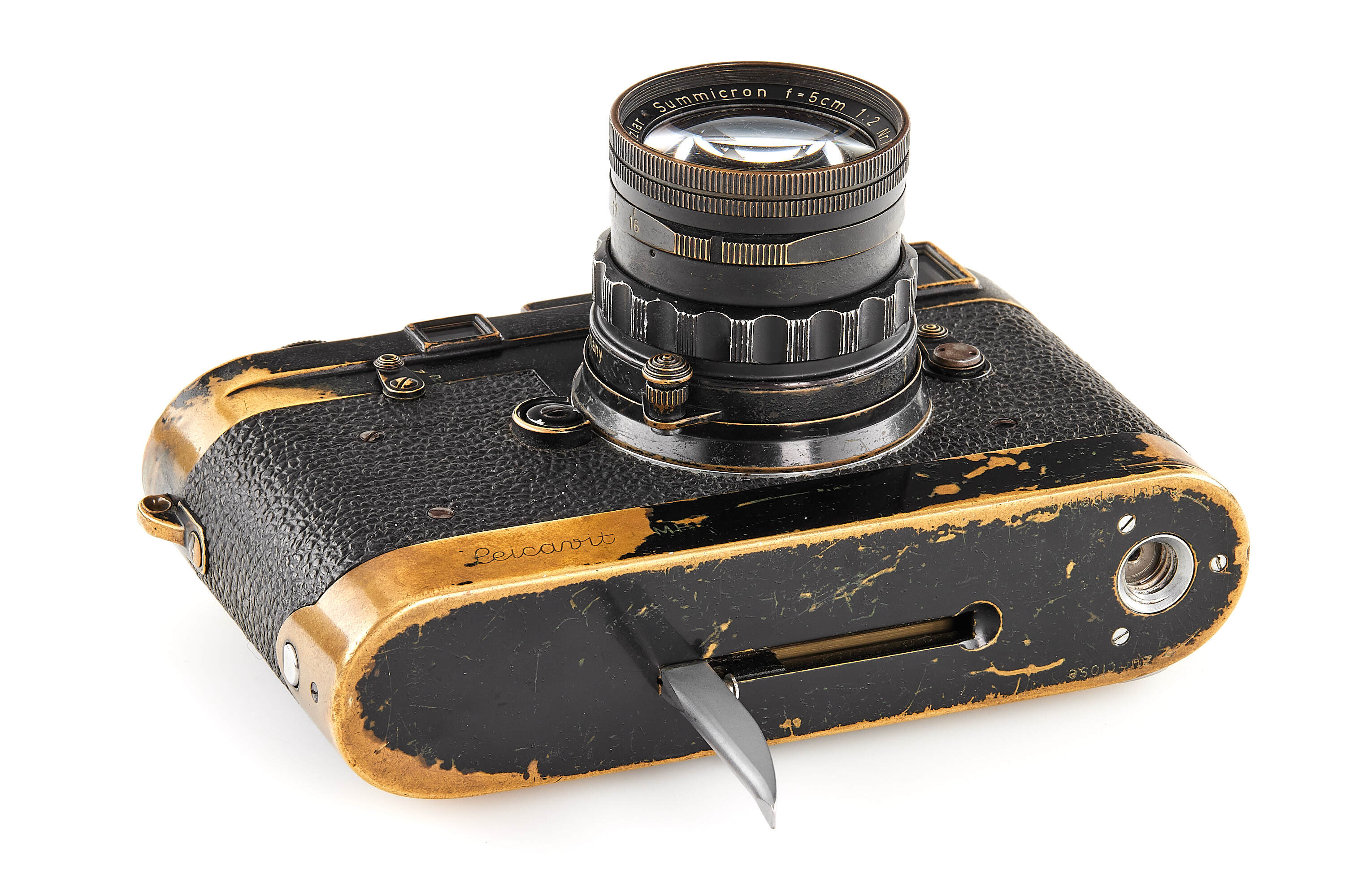 The example offered here, MP no. 33, is a highly desirable black paint version showing the distinctive patina and wear characteristic of years of professional use. Its beautifully aged surface, with subtle paint bubbling and brass highlights, enhances its authentic vintage appeal. The camera was originally delivered to Brandt, Sweden, on 29 July 1957, and is accompanied by a matching black paint Leicavit and a black paint / brass-mount Summicron 2/5cm lens no.1474885, which was delivered to the same dealer only one day later, on 30 July 1957.