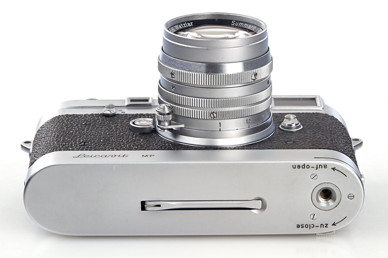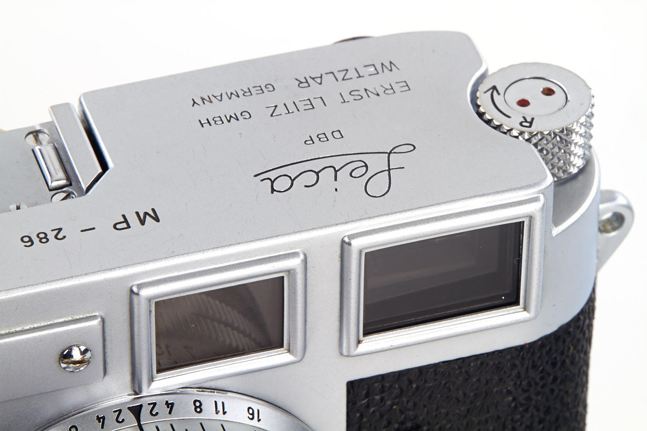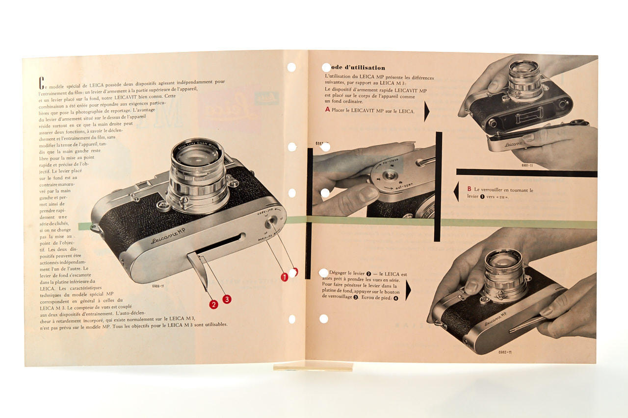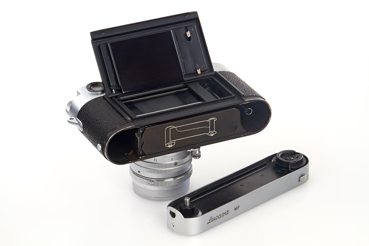the rare camera in beautiful and 100% original condition, clean finder and perfect shutter (CLA by Ottmar Michaely), matching number on chassis inside the camera, Leicavit MP in near mint condition, with the original Summarit 1.5/5cm no.1276063, with Leica MP brochure from 1957