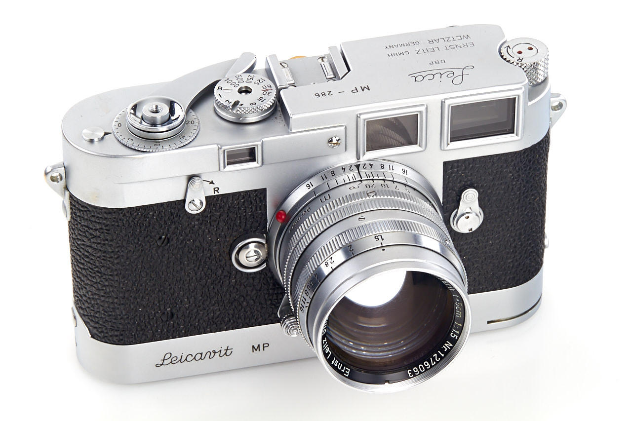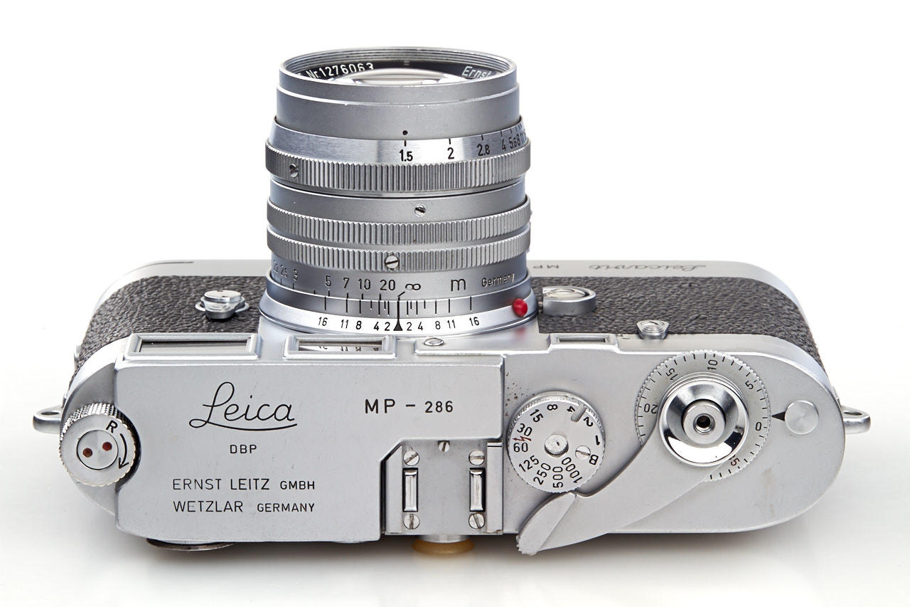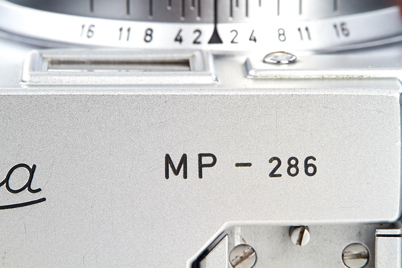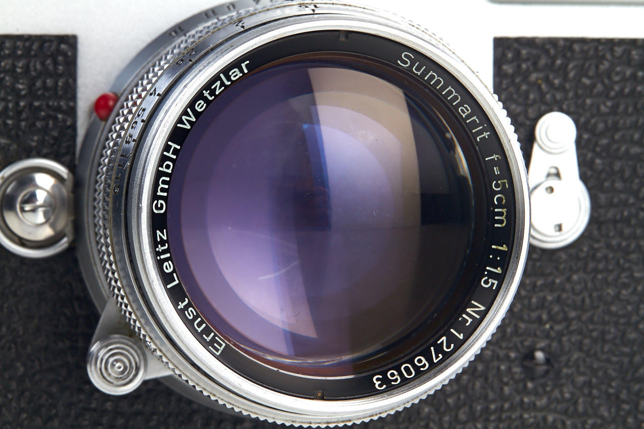 the rare camera in beautiful and 100% original condition, clean finder and perfect shutter (CLA by Ottmar Michaely), matching number on chassis inside the camera, Leicavit MP in near mint condition, with the original Summarit 1.5/5cm no.1276063, with Leica MP brochure from 1957
