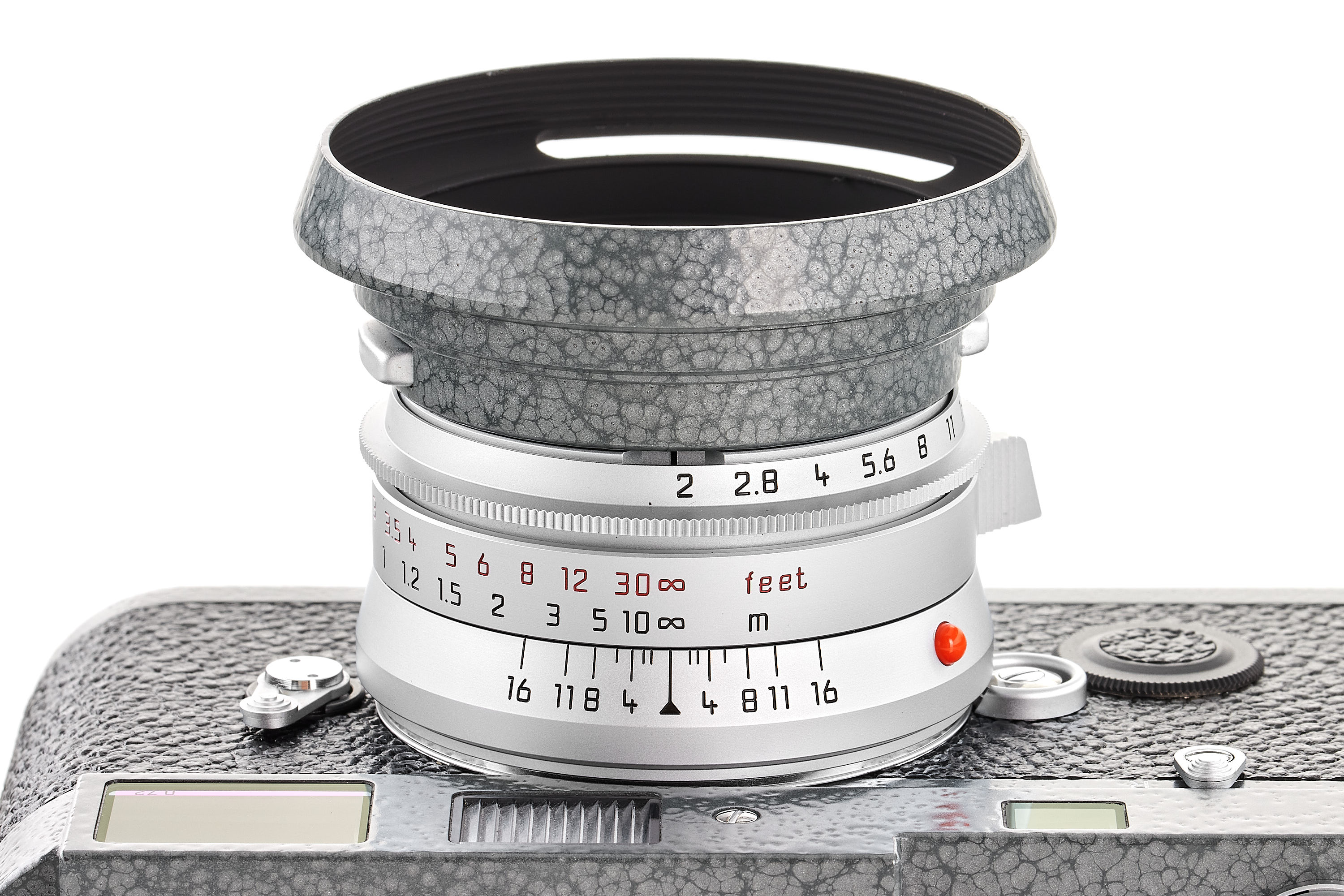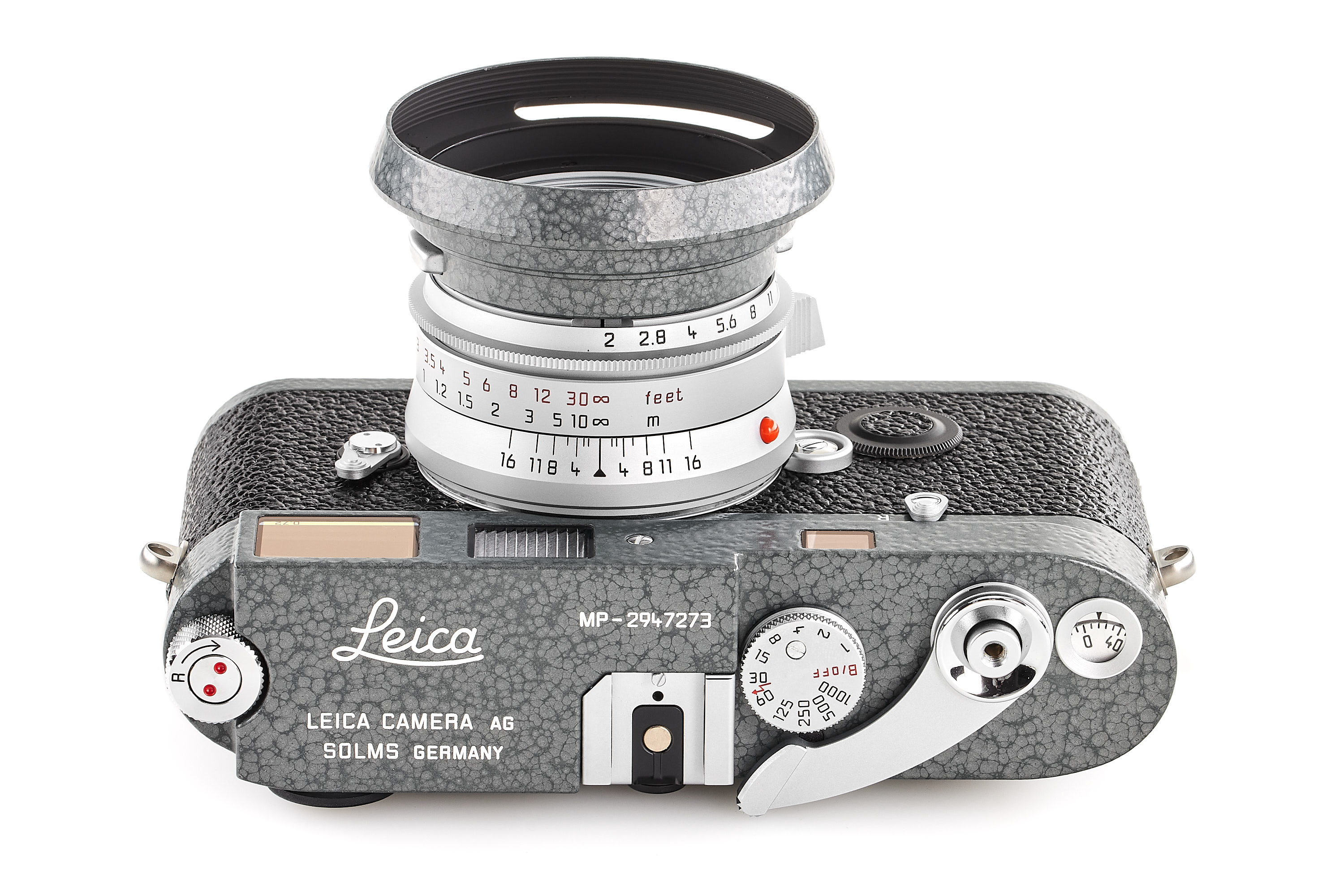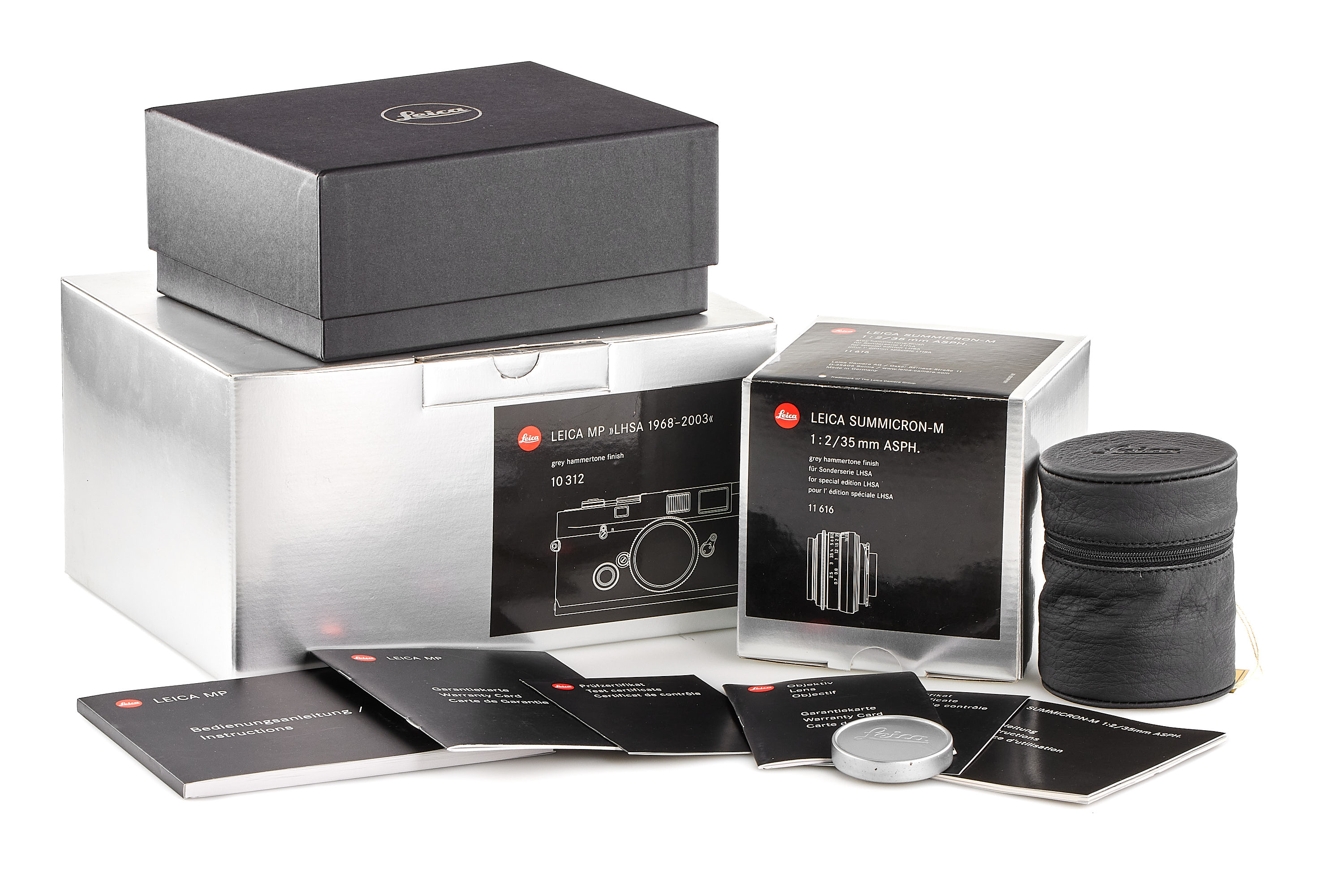 A special edition set issued to commemorate 35 years of LHSA (now LSI). Including a Leica MP no.2947273 in special hammertone finish, including a matching Summicron-M 2/35mm ASPH. no.3945437 (both caps, hood and leather keeper), everything in mint, unused condition, with boxes and papers.