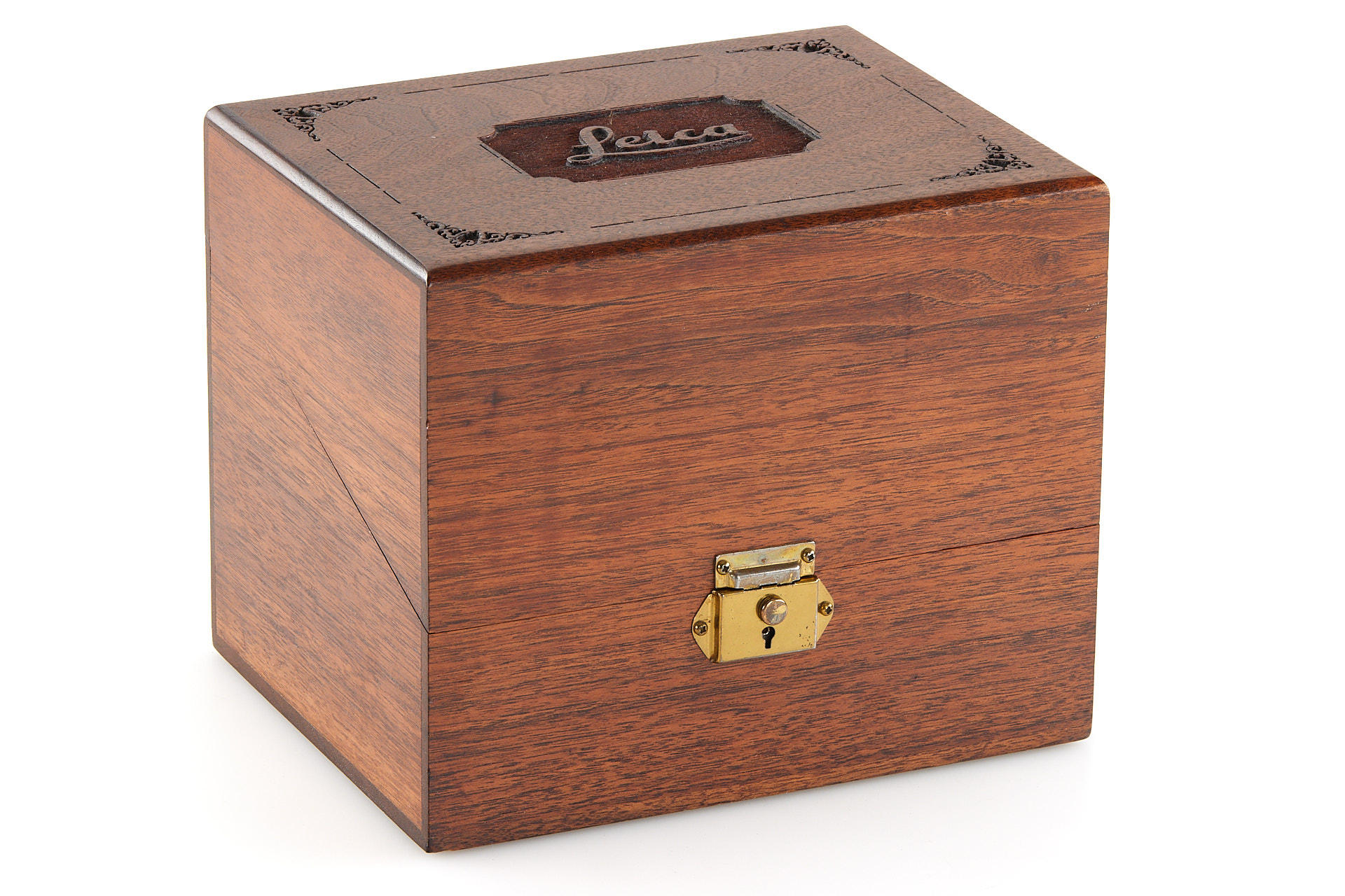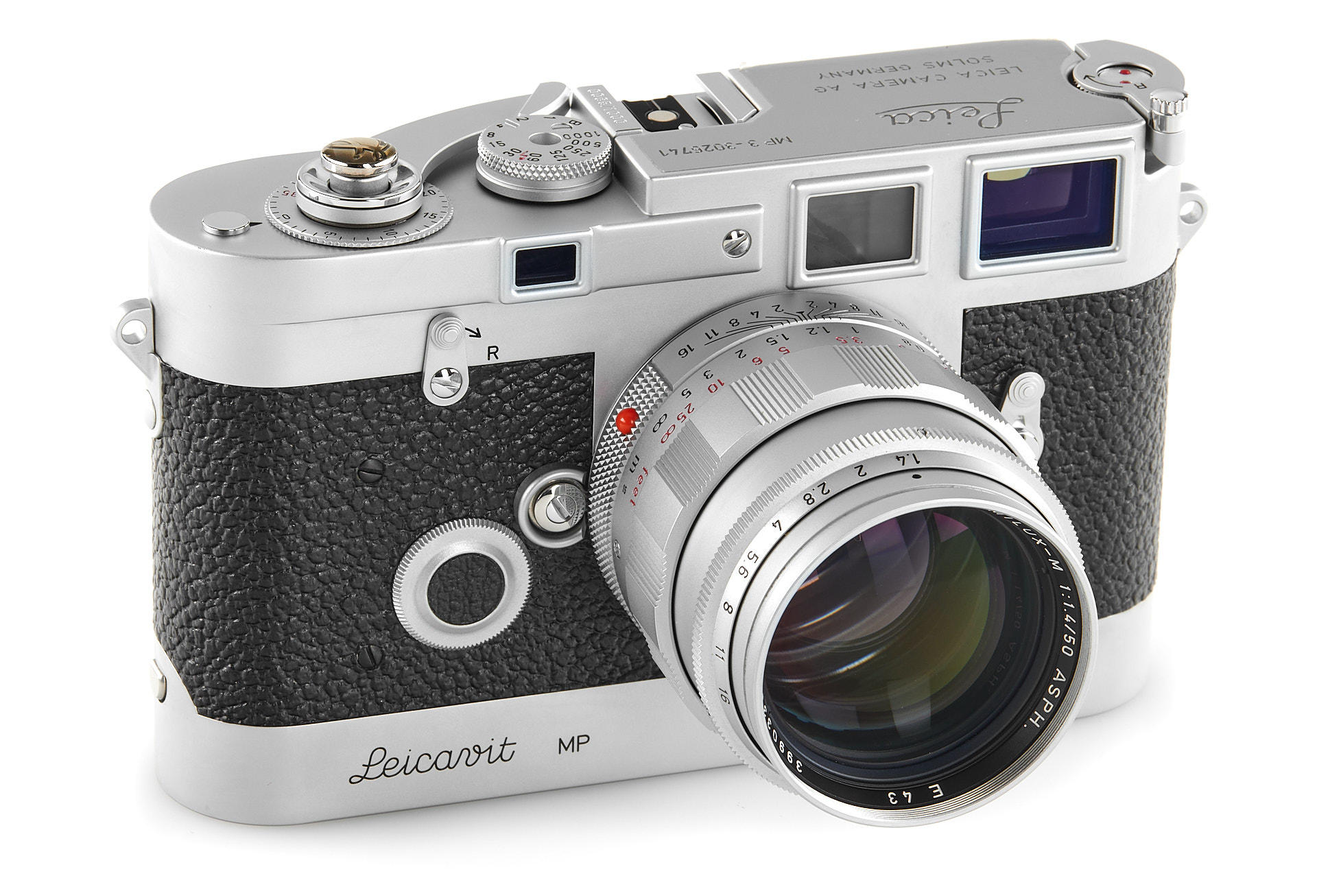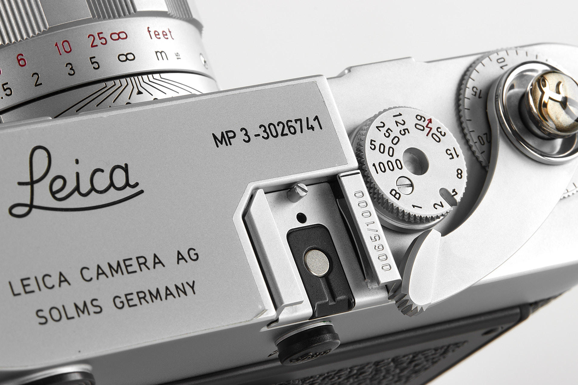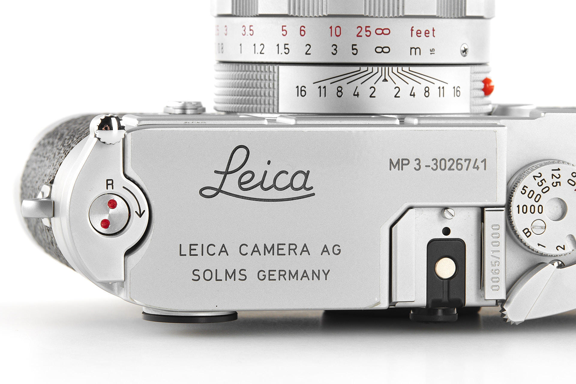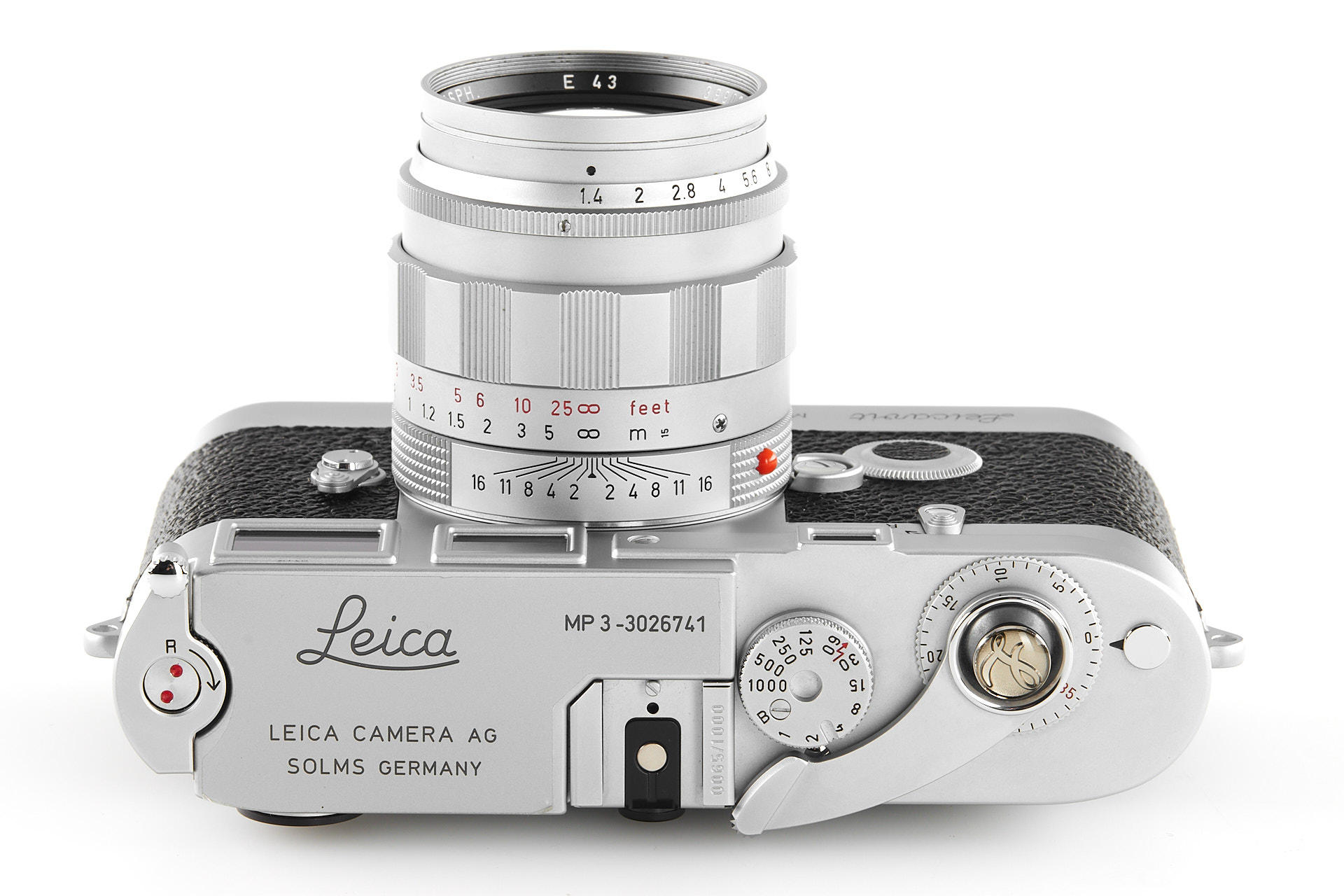 The Leica MP3 is a close reproduction of the original Leica MP from the 1950s and 1960s. Only the front battery cover and the back adjusting dial for film speed indicate that the MP3 body is based upon the M6. The MP3 has the raised viewfinder window frame, extended strap lugs, and an external frame counter. The offered example is in beautiful, unused condition, with body no.3026741, Leicavit MP no.00154, Summilux-M 1.4/50mm ASPH. no.3990330, hood, two caps, normal base plate, UV filter, special wooden presentation box