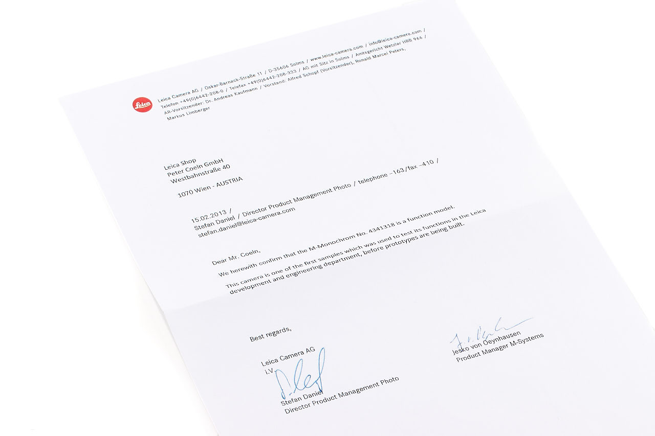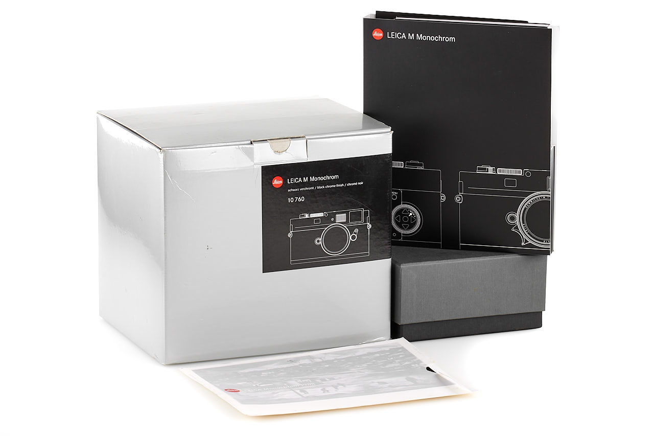 Extremely rare functional sample of the Leica Monochrome 10760, produced before the actual prototypes were built, in very good condition and working order, showing some signs of use, with body cap, leather strap, warranty card, papers, letter of confirmation from Leica Camera AG, charger, battery and original maker's box, note the sample no.4341316 which is pictured in the official brochure of the camera.