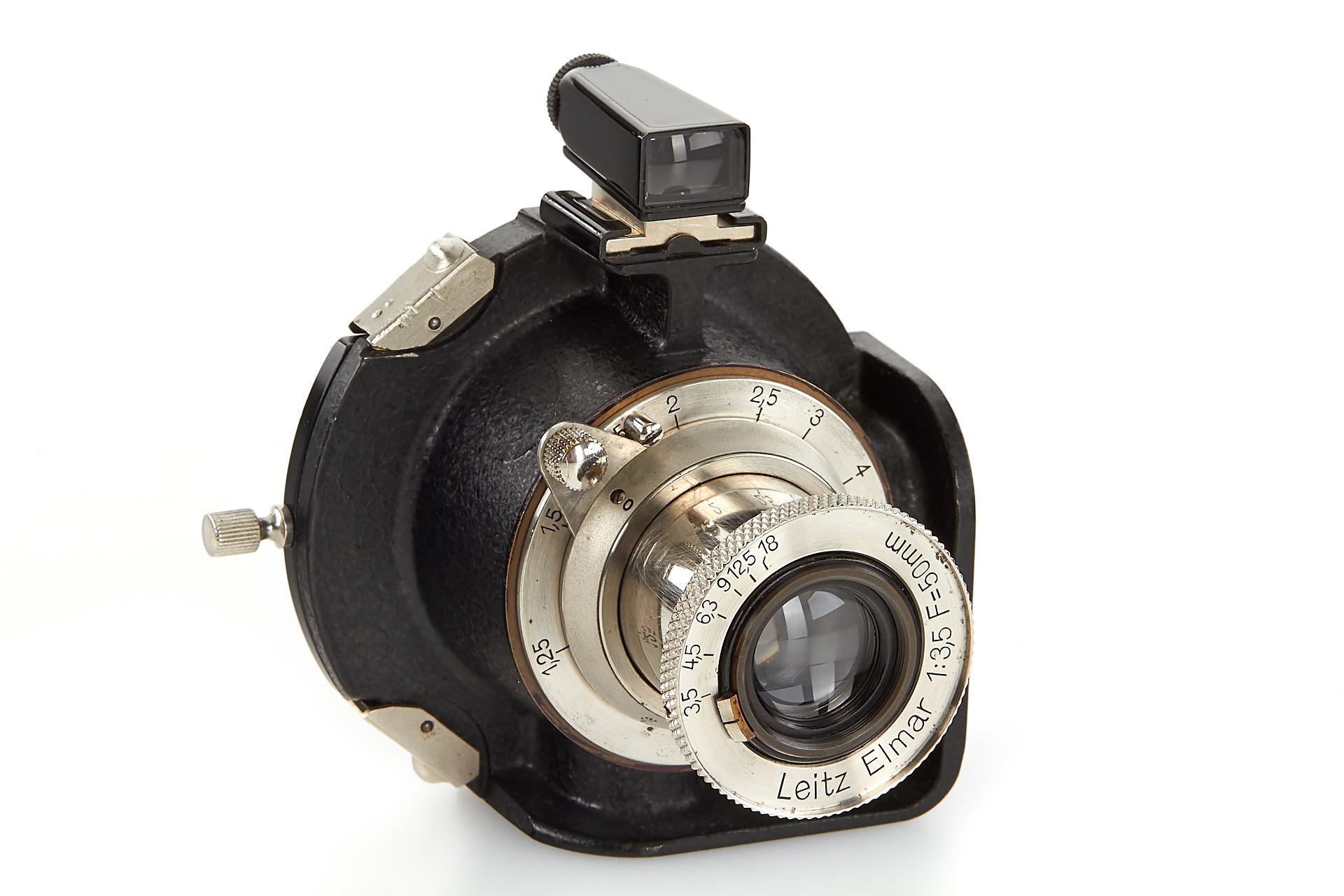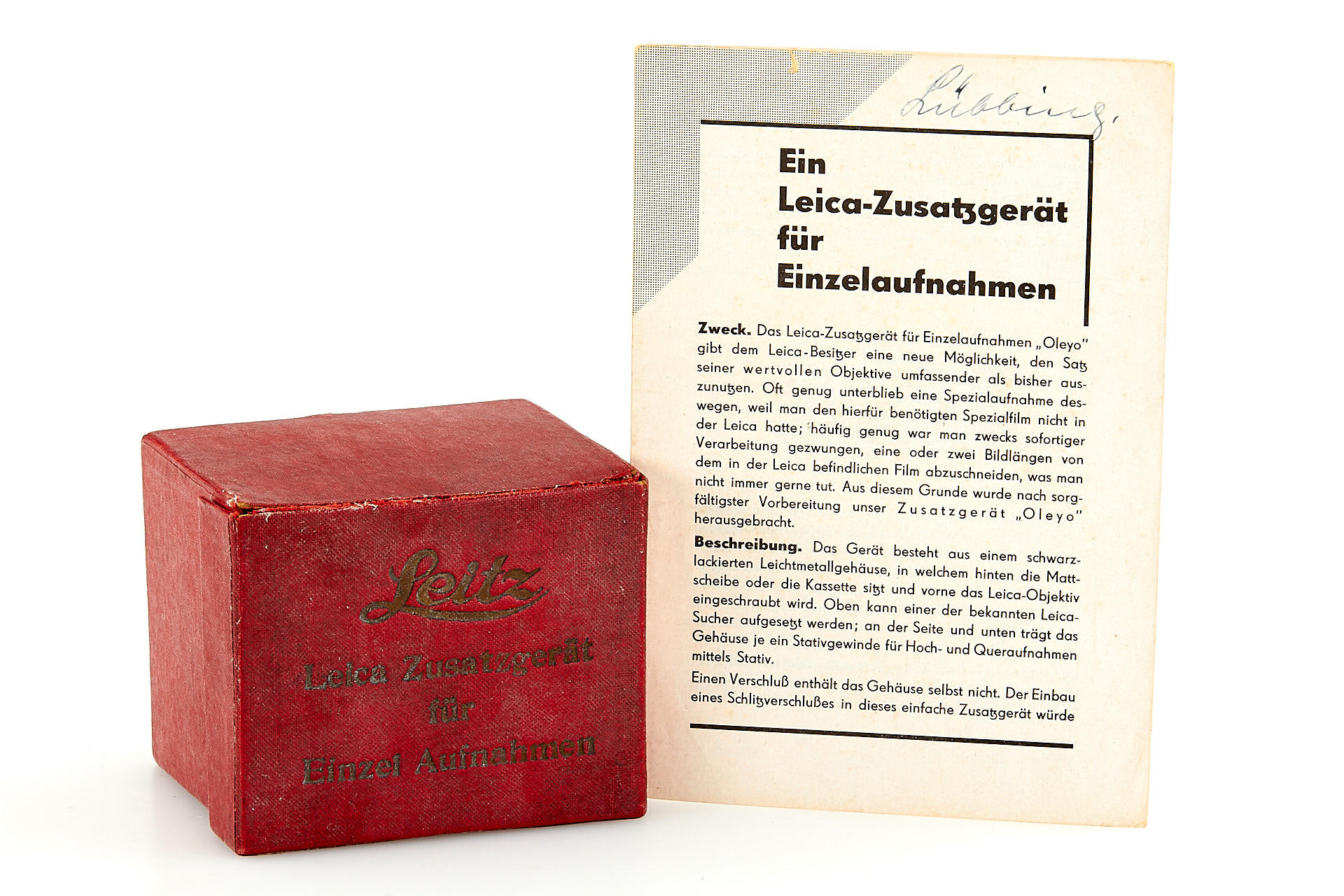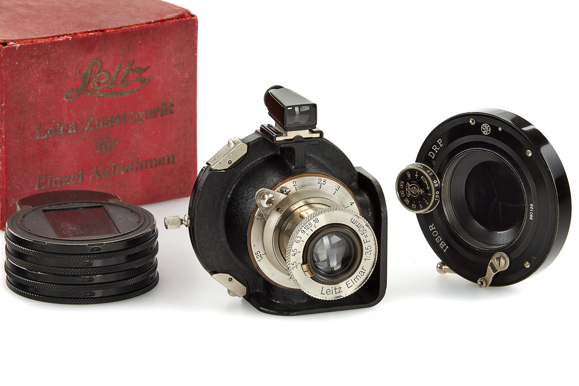 in excellent original condition with unnumbered nickel Elmar 3.5/3.5cm, rare black/nickel SUWOO 5cm finder, IBSOR shutter, five film holders, focusing screen, red maker's box for the single exposure housing (worn), very rare original brochure from 1934, a very attractive assembly