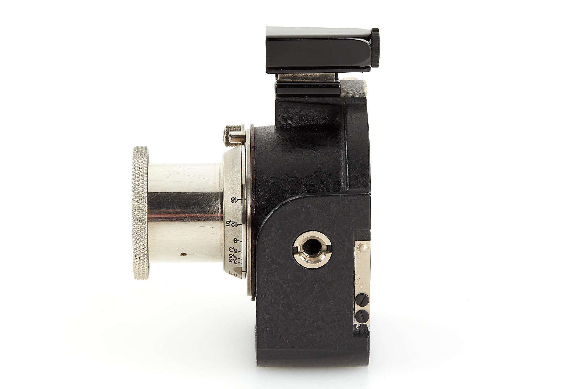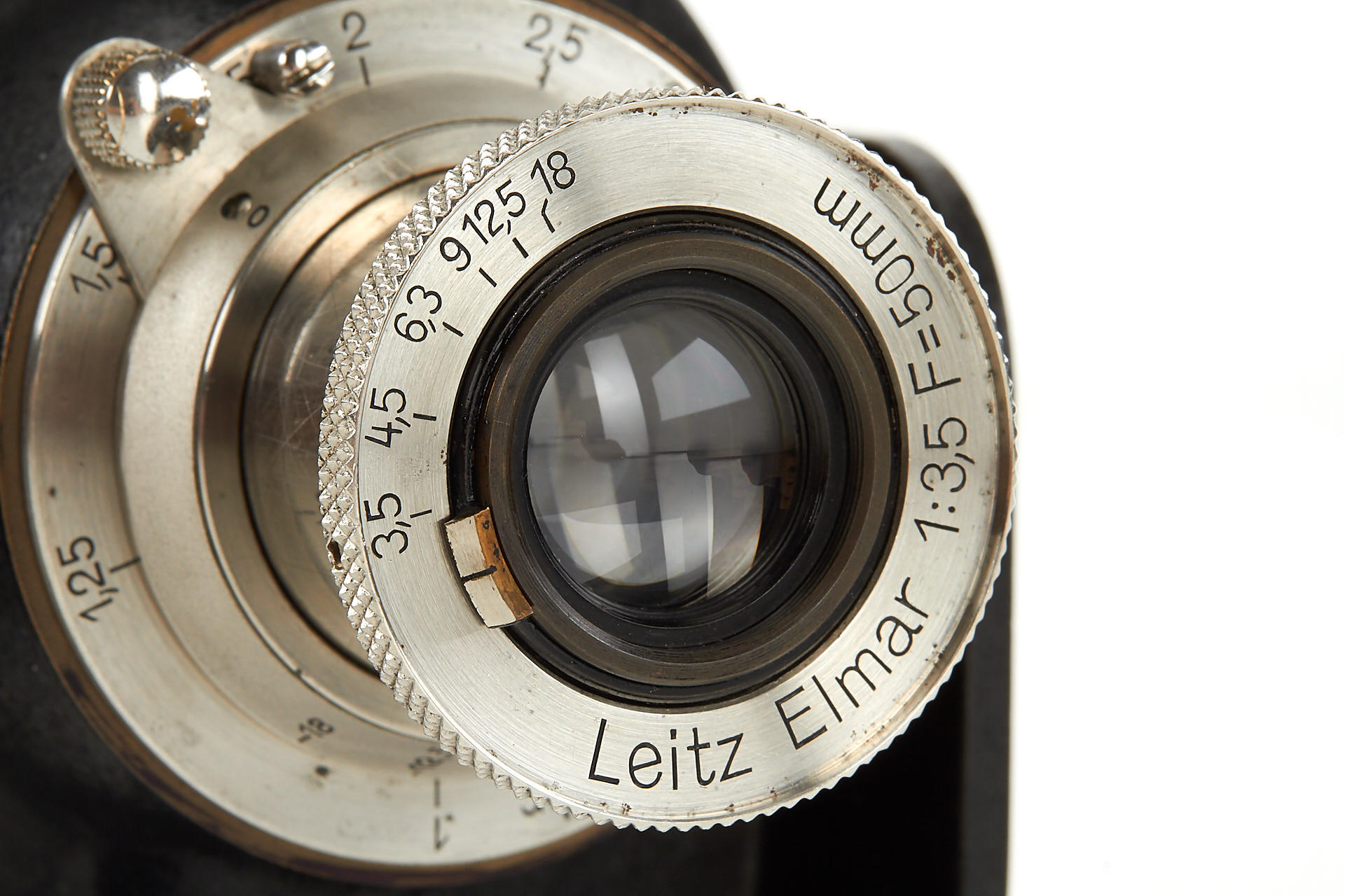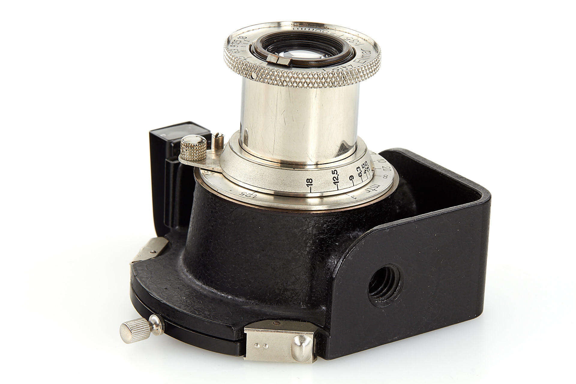 in excellent original condition with unnumbered nickel Elmar 3.5/3.5cm, rare black/nickel SUWOO 5cm finder, IBSOR shutter, five film holders, focusing screen, red maker's box for the single exposure housing (worn), very rare original brochure from 1934, a very attractive assembly