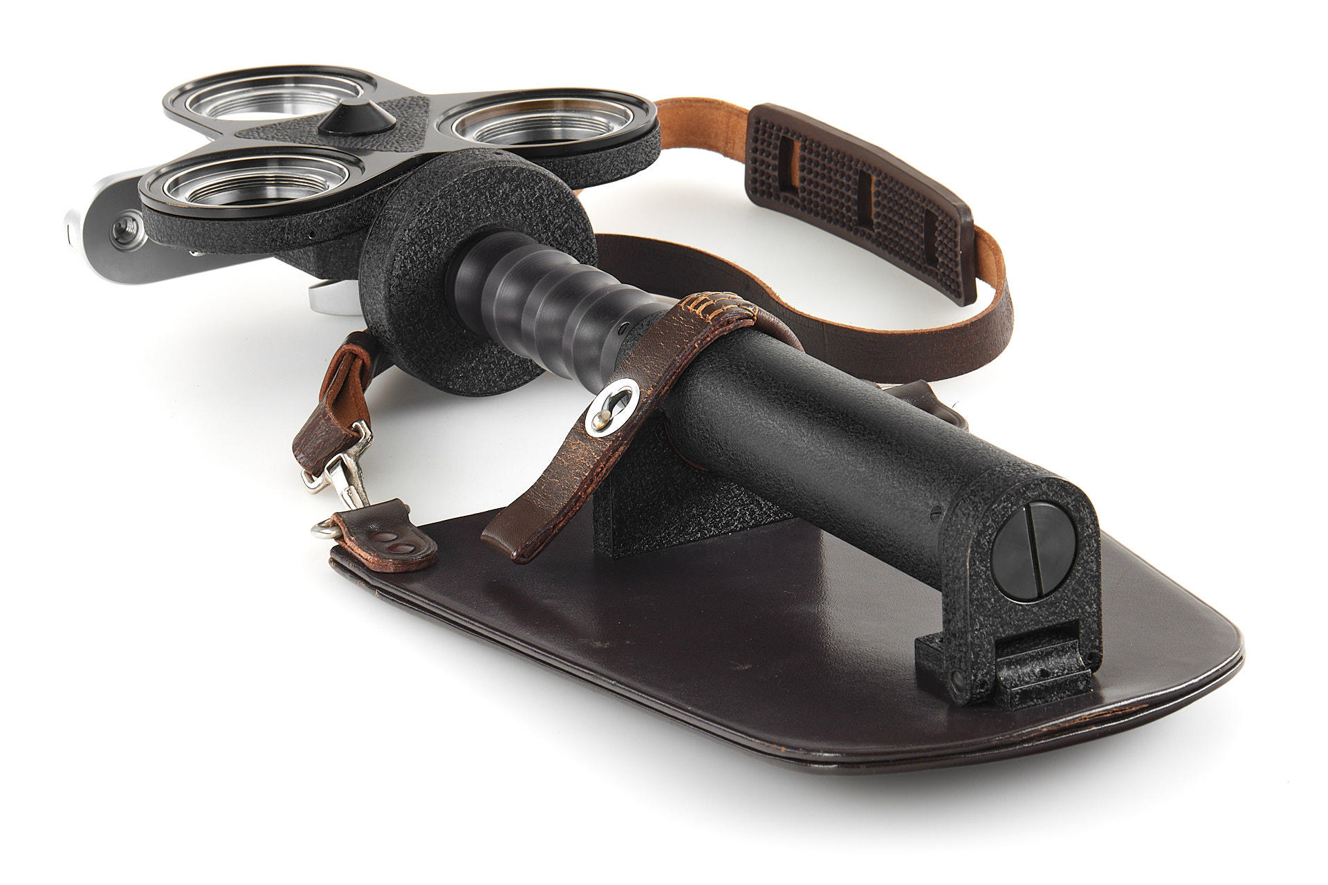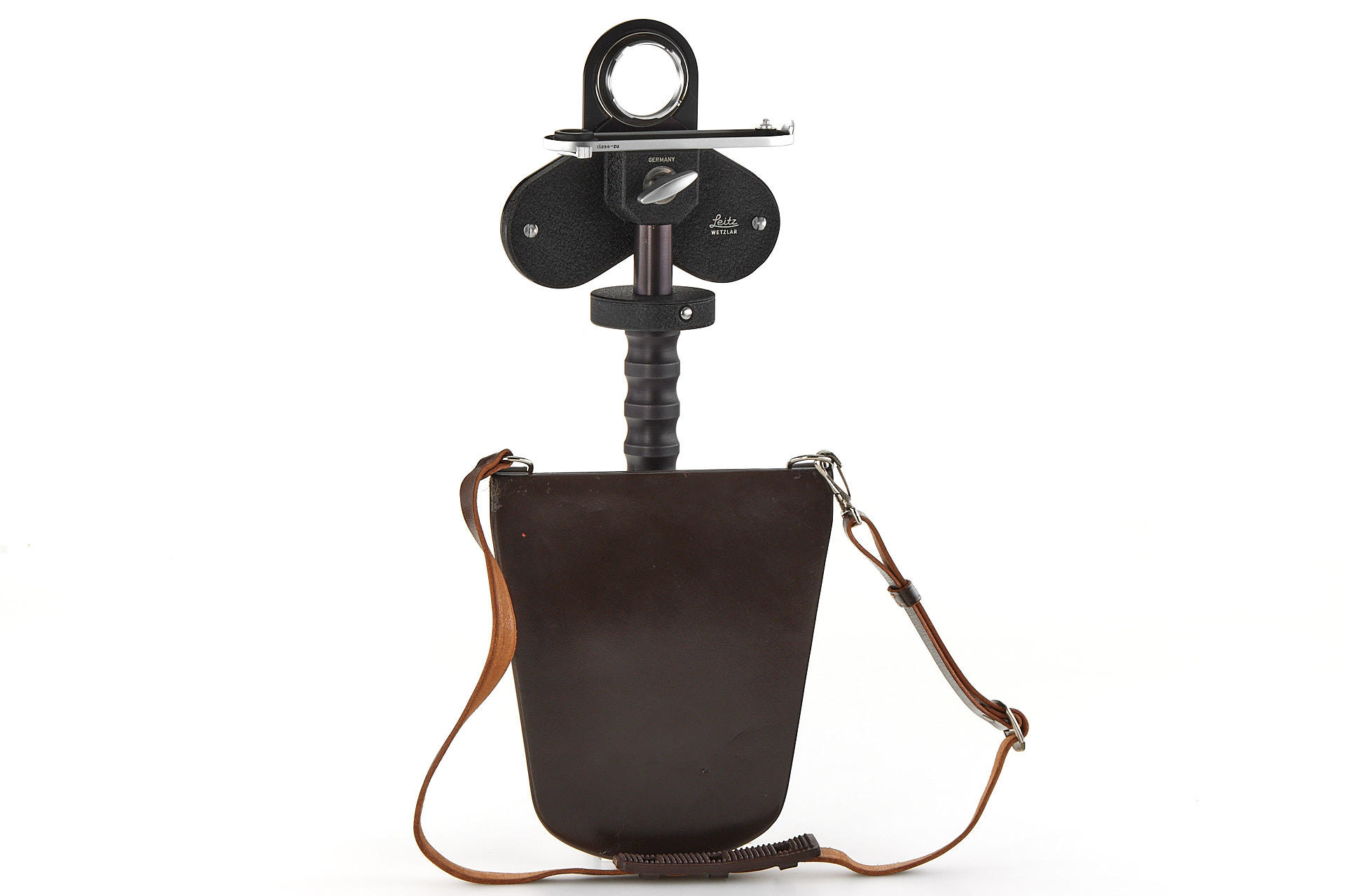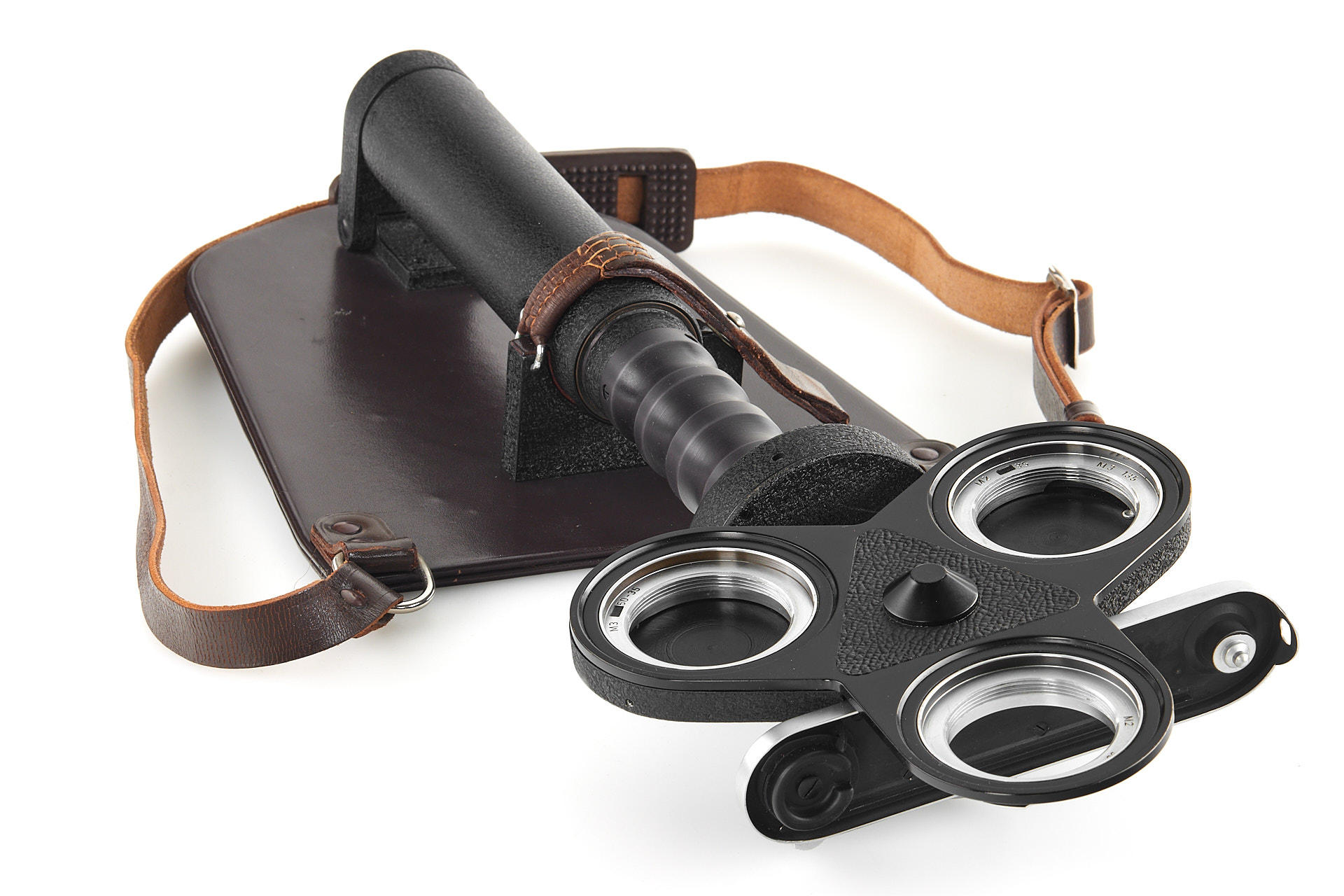 Rare lens turret OROLF for M2 with 3 lenses (total production only approx. 200 units) in near mint condition, with very rare chest tripod, extendable height, tilting rail, mounted on leather board with neck strap