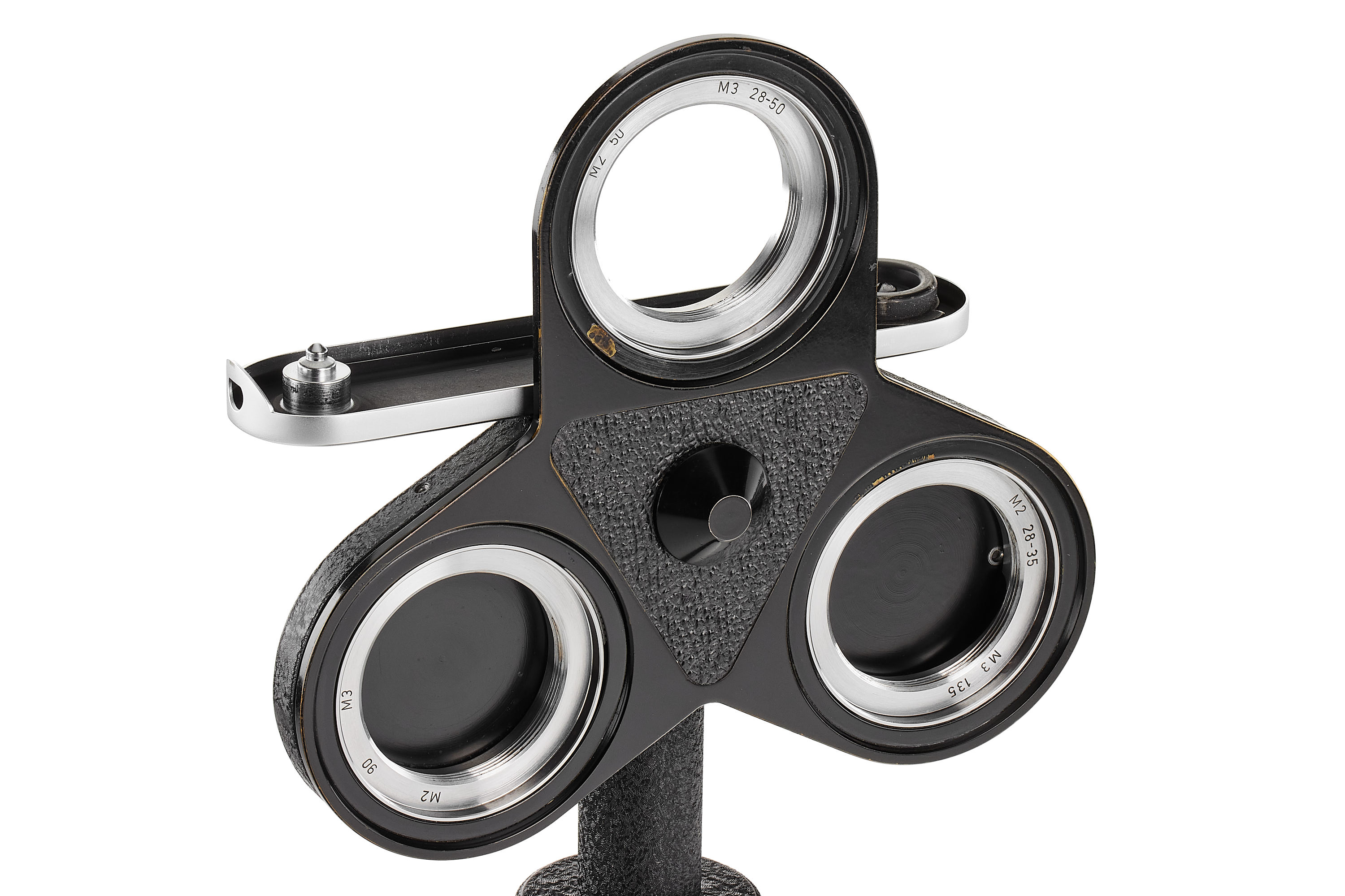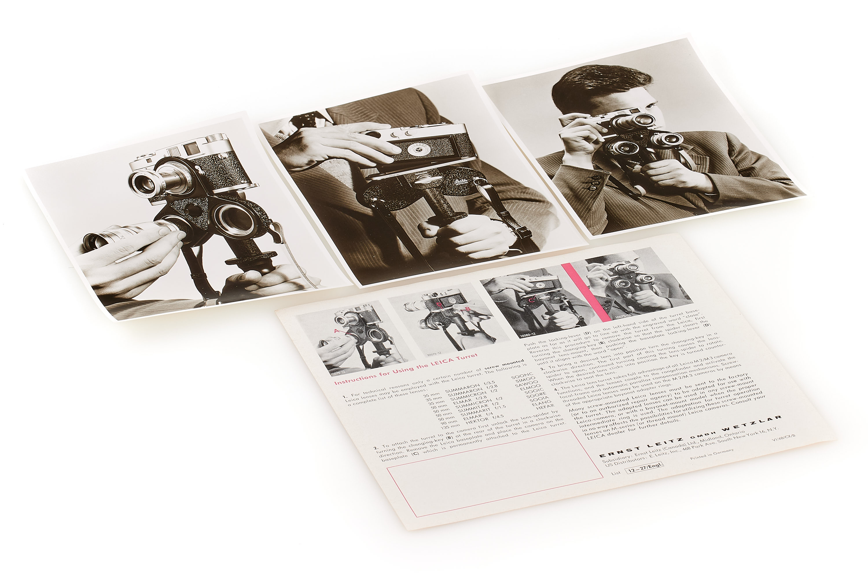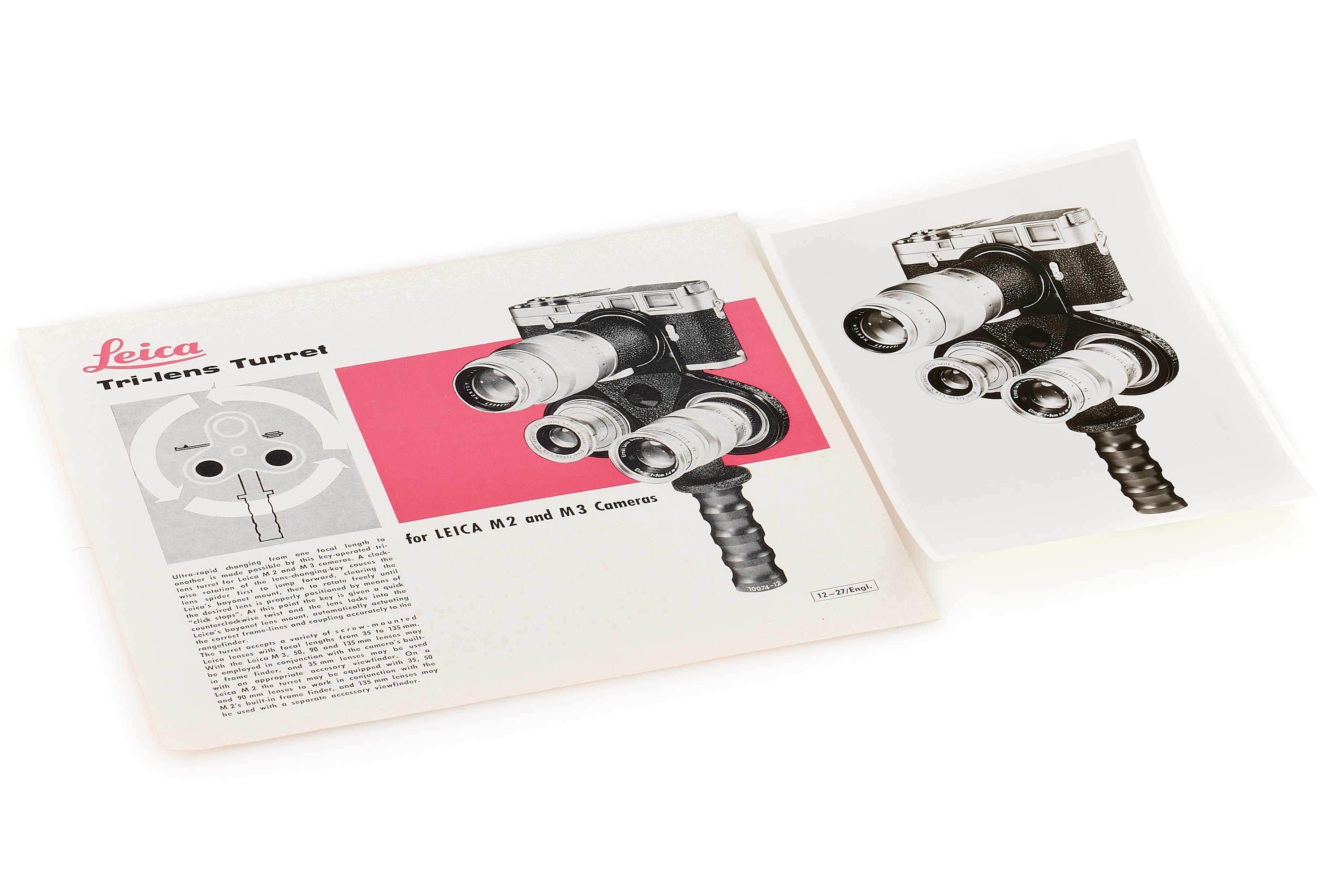 Very rare lens turret OROLF for 3 screw mount lenses with M3 and M2, only around 250 produced, in almost mint condition, together with original leaflet and rare interesting 4 original Leitz press photographs used in the brochure.