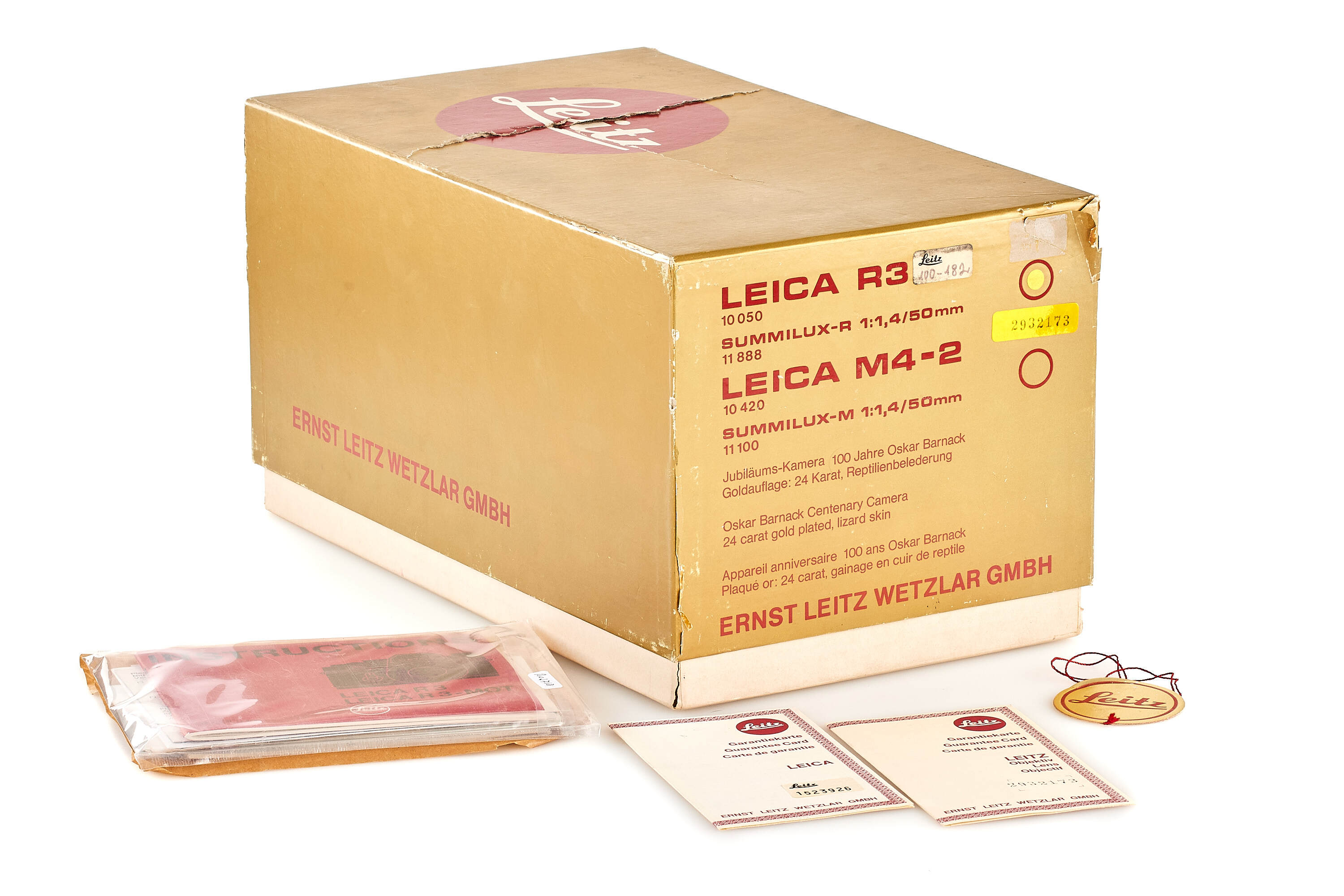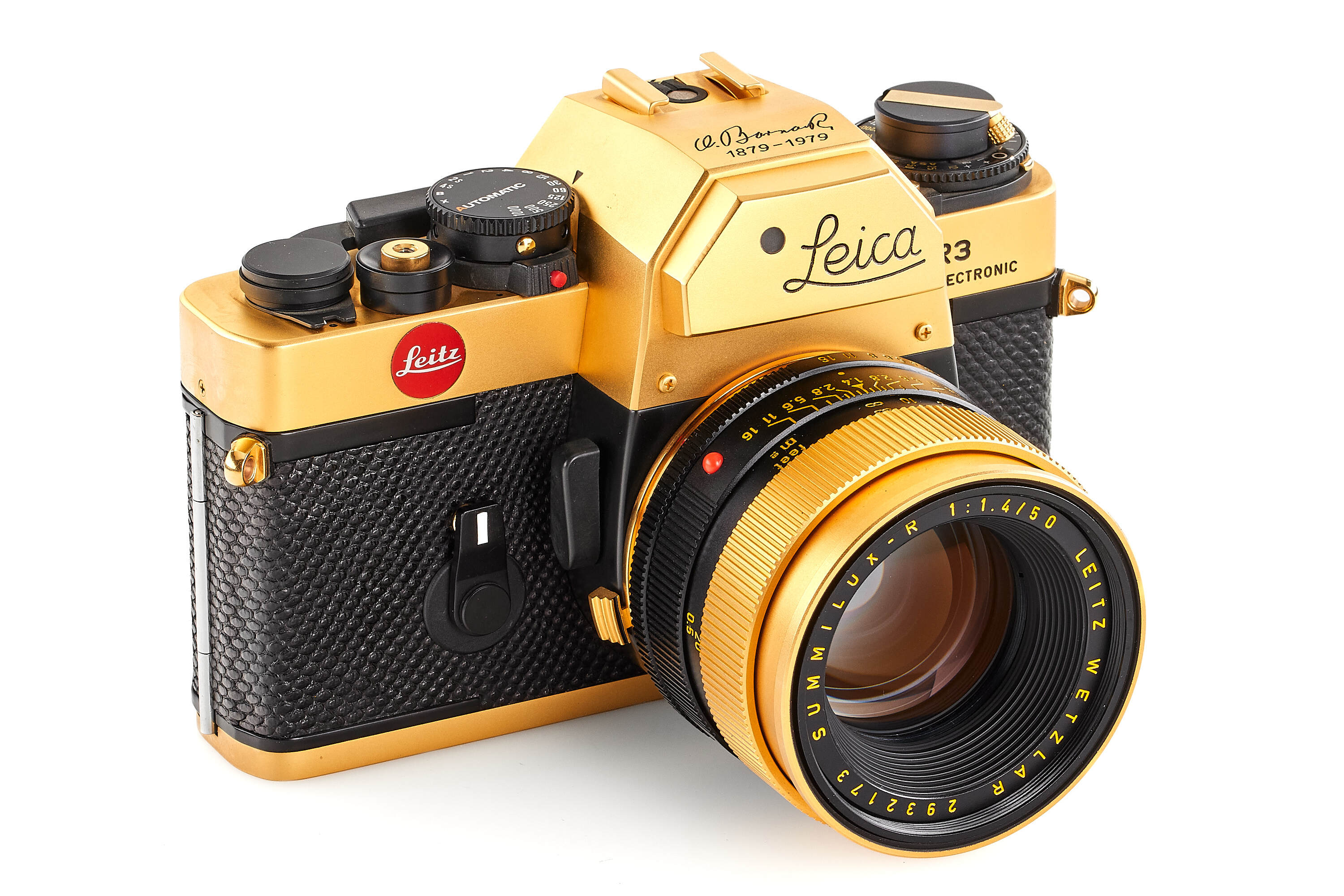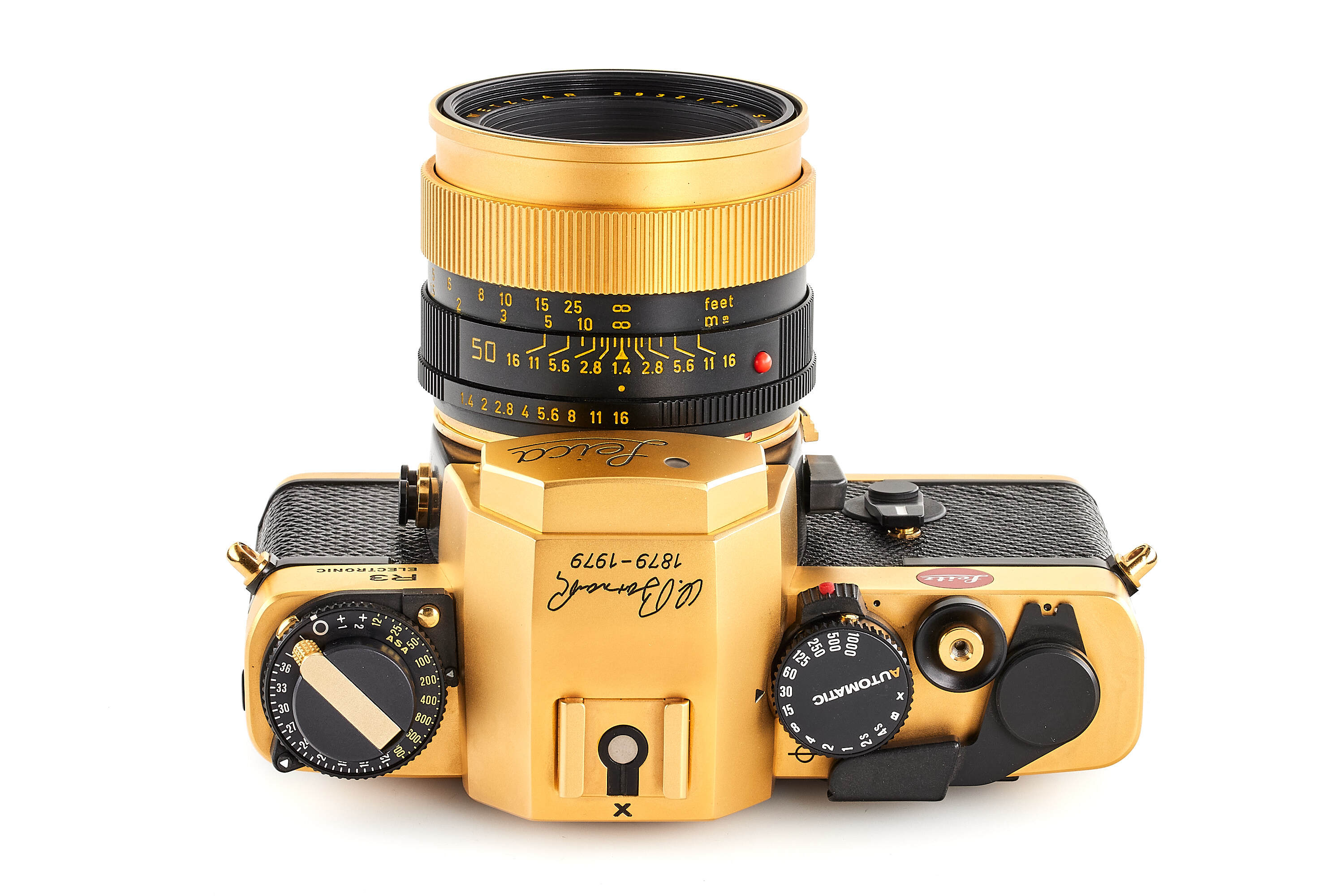 Beautiful 24 carats gold-plated R3, 1000 pieces produced for the 100th anniversary of the birth of the inventor of the Leica, Oskar Barnack, body no.1523926 with special number 100-182 engraved next to the eyepiece, in unused condition, together with gold-plated Summilux-R 1.4/50mm no.2932173, with all caps, strap, papers and instructions, wooden presentation box and matching maker's box (cond. B+).