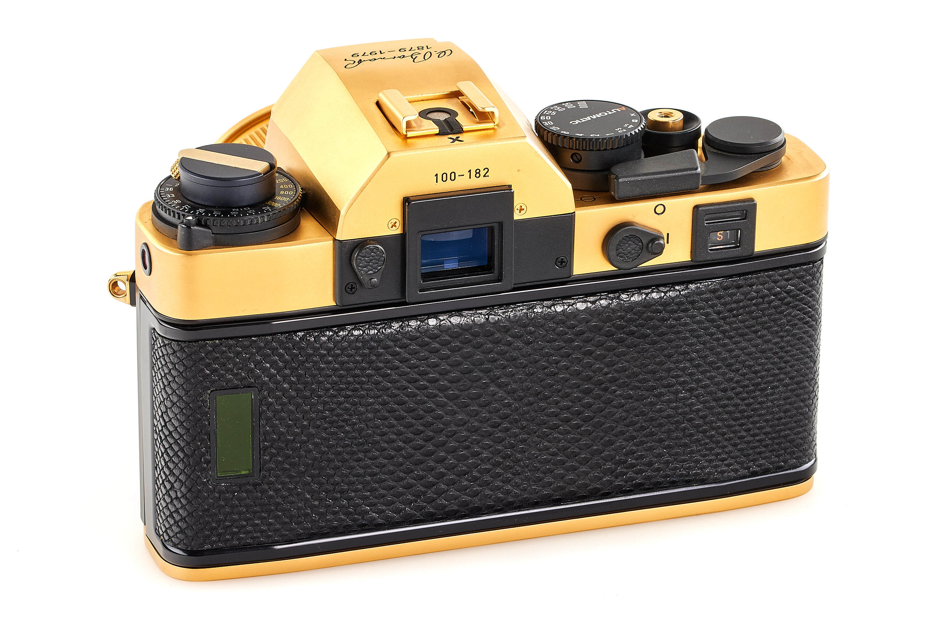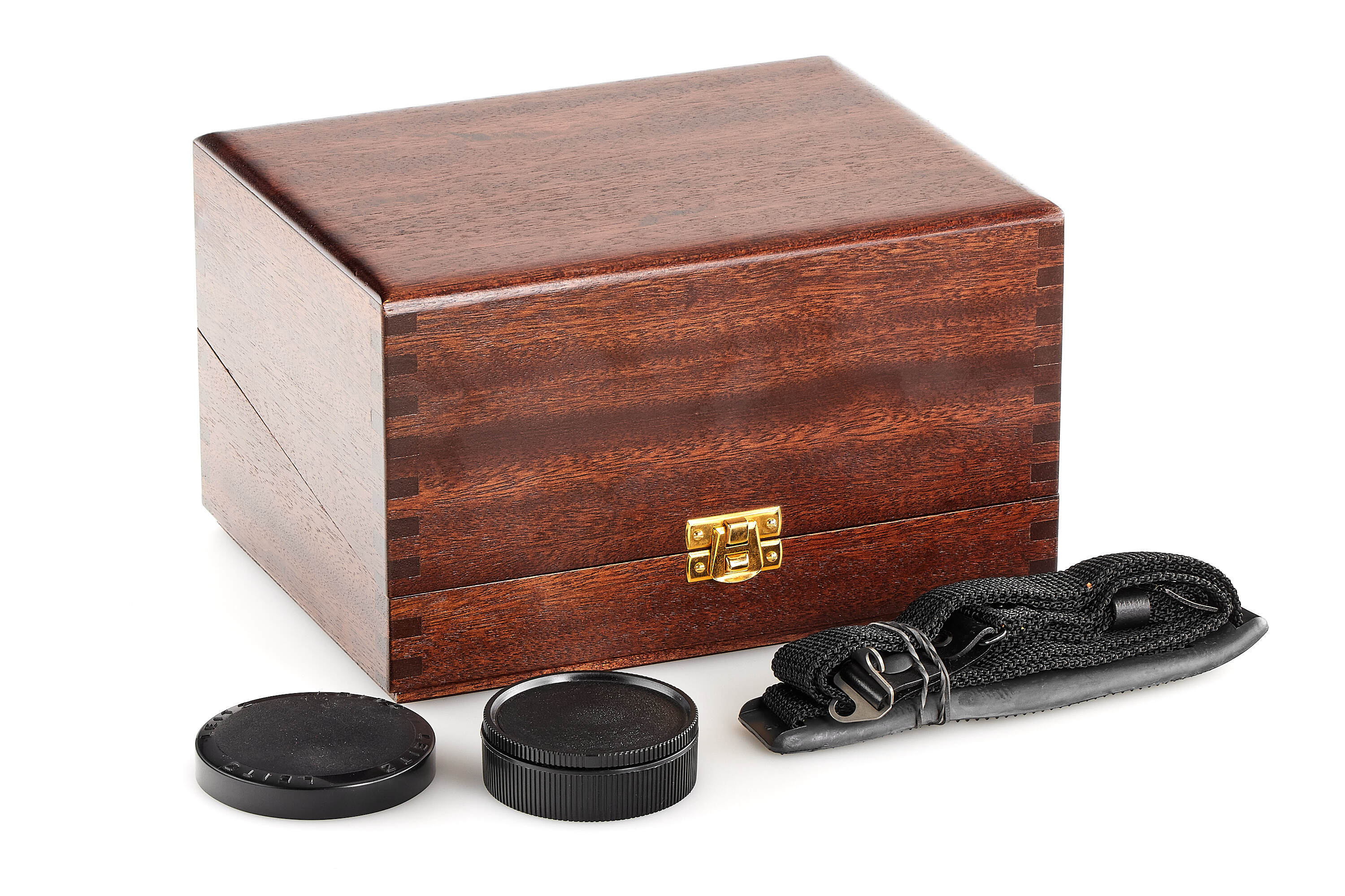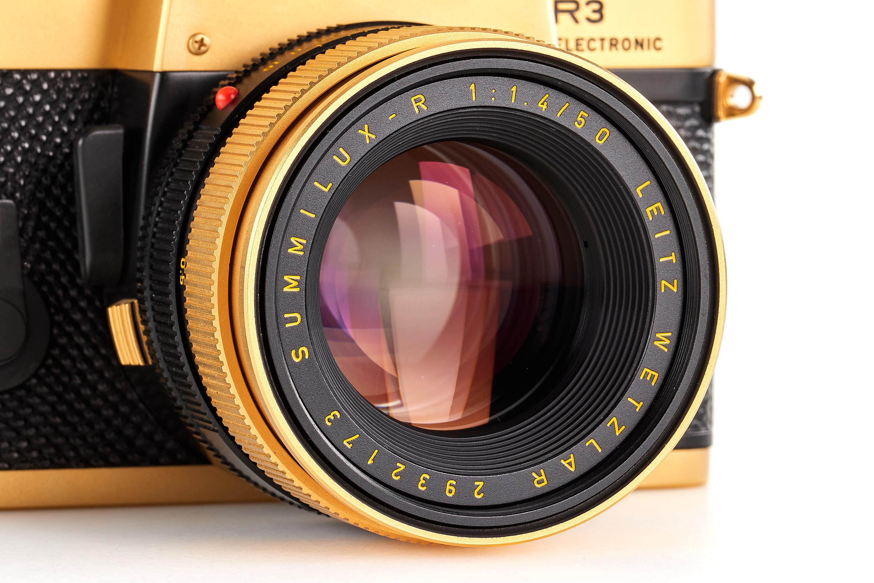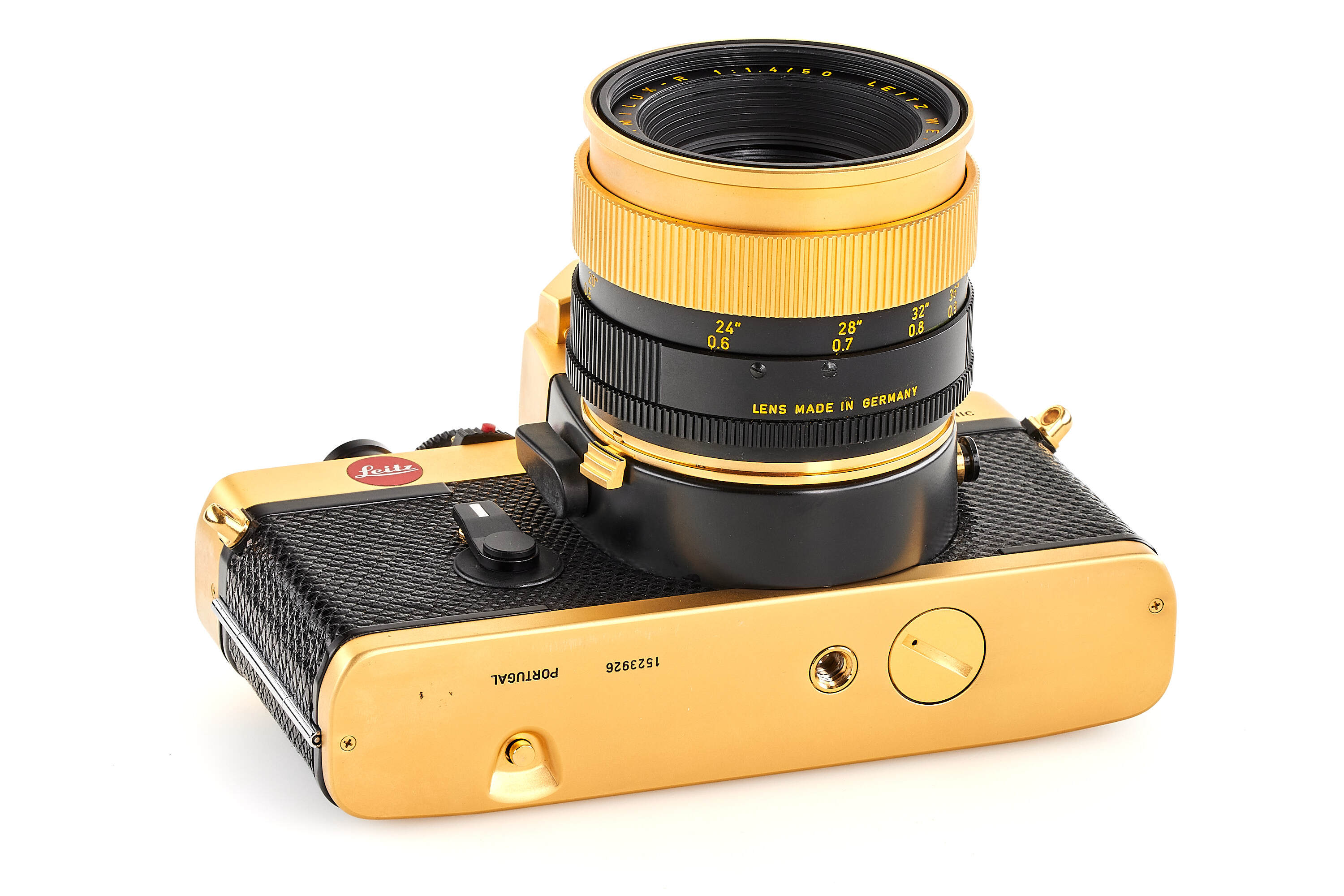 Beautiful 24 carats gold-plated R3, 1000 pieces produced for the 100th anniversary of the birth of the inventor of the Leica, Oskar Barnack, body no.1523926 with special number 100-182 engraved next to the eyepiece, in unused condition, together with gold-plated Summilux-R 1.4/50mm no.2932173, with all caps, strap, papers and instructions, wooden presentation box and matching maker's box (cond. B+).