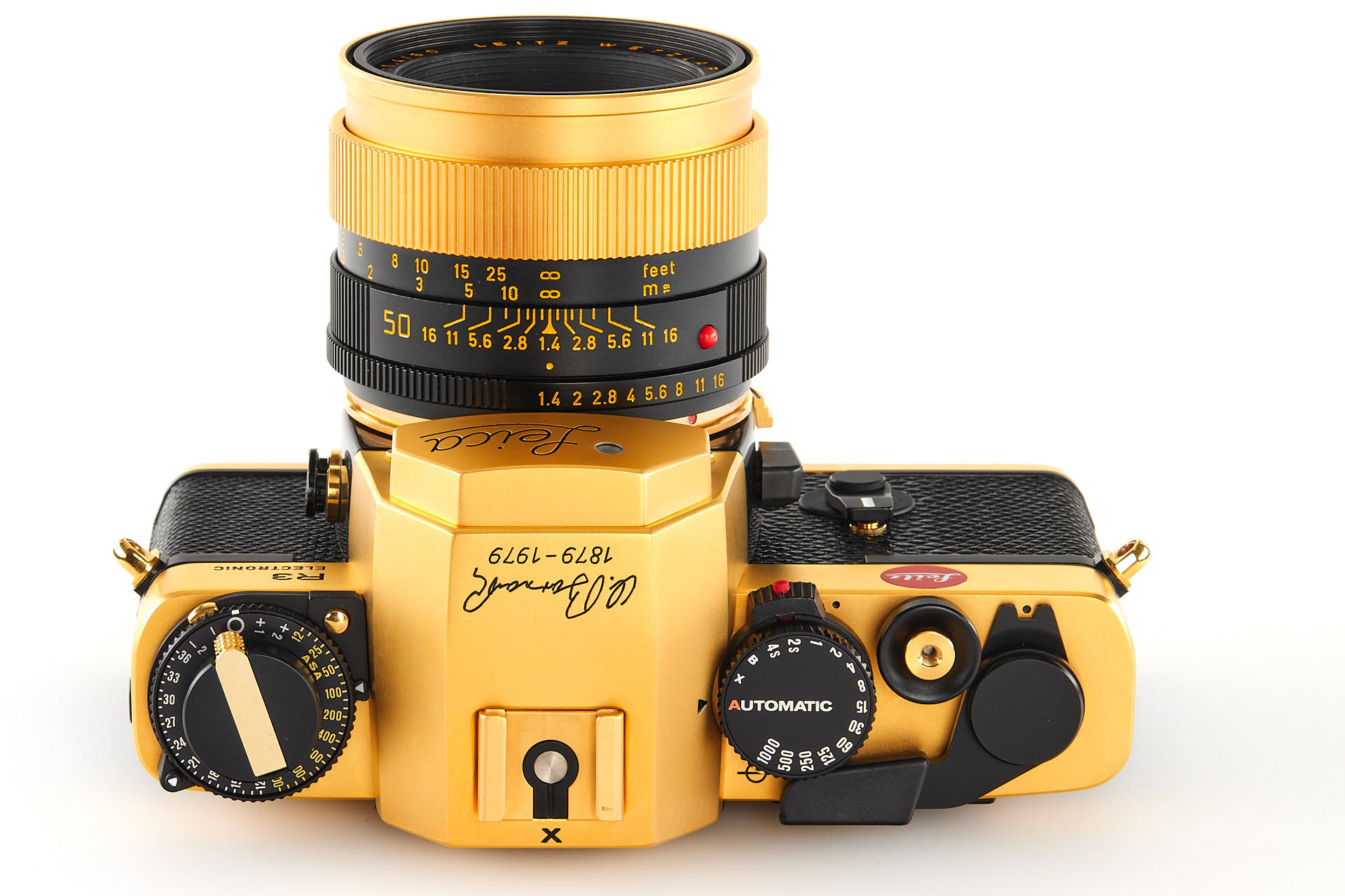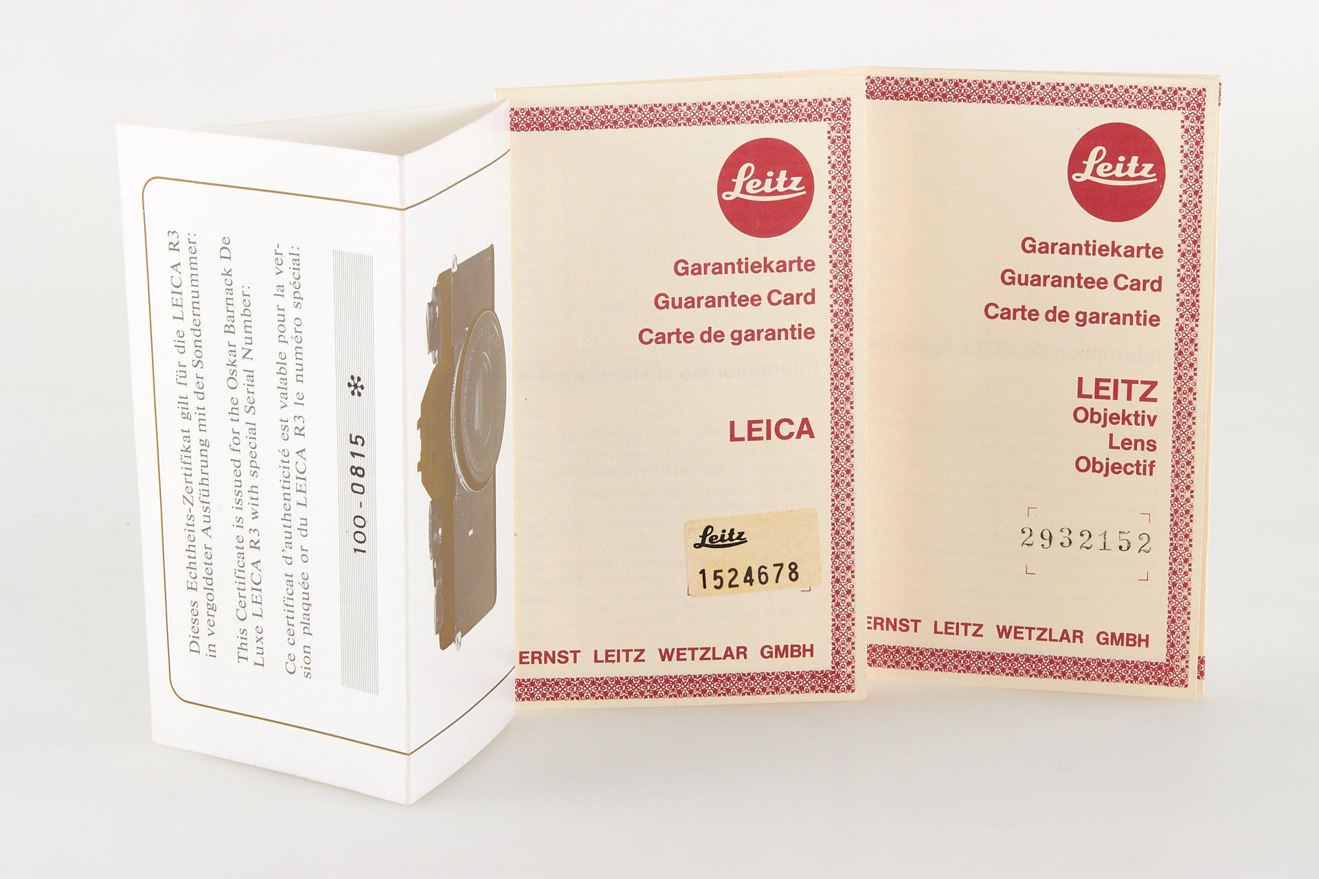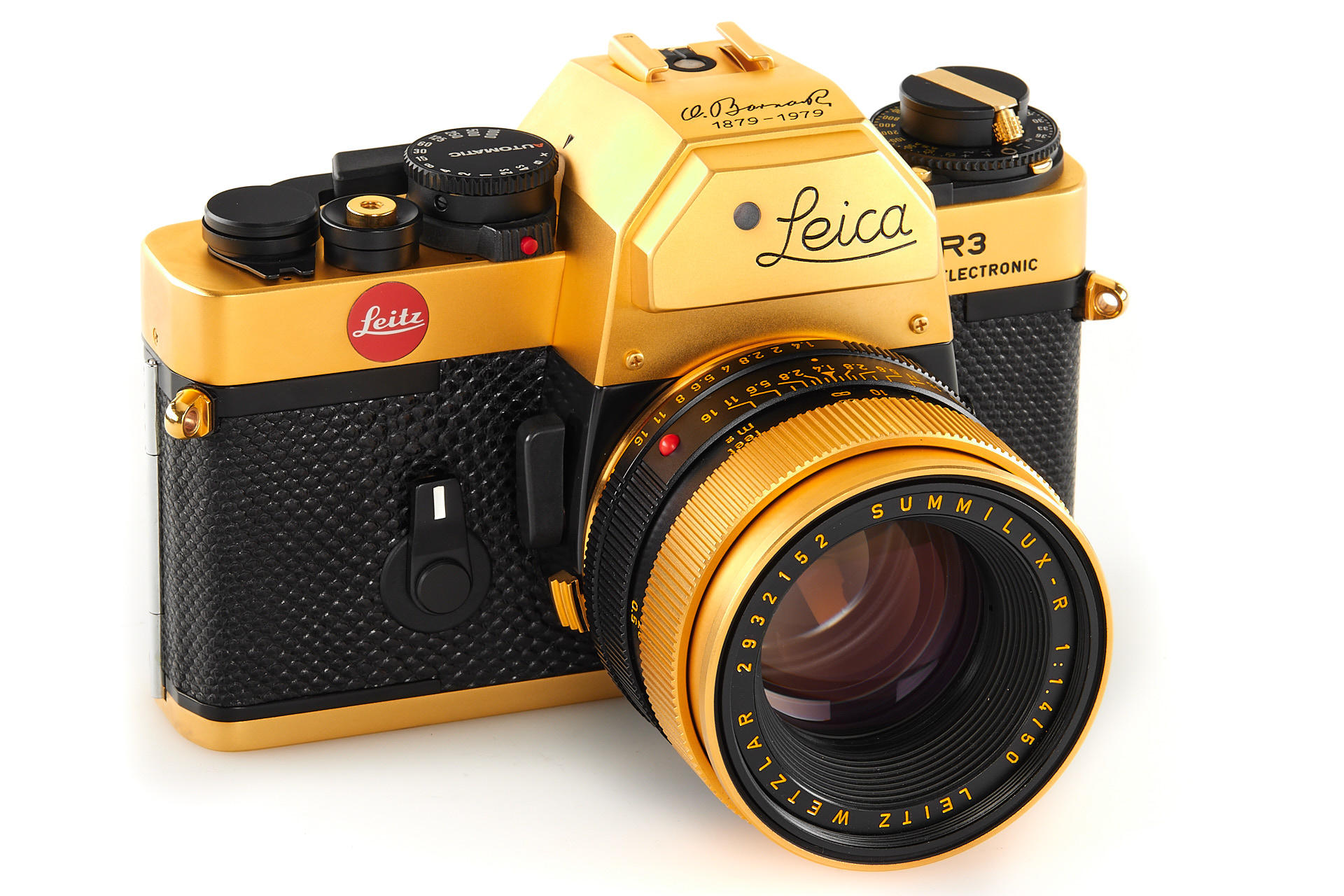 near mint 24 carats gold-plated R3, issued for the 100th anniversary of the birth of the inventor of the Leica, Oskar Barnack, body no.1524678, gold-plated Summilux-R 1.4/50mm no.2932152, with all papers and accessories, wooden presentation box, matching maker's box