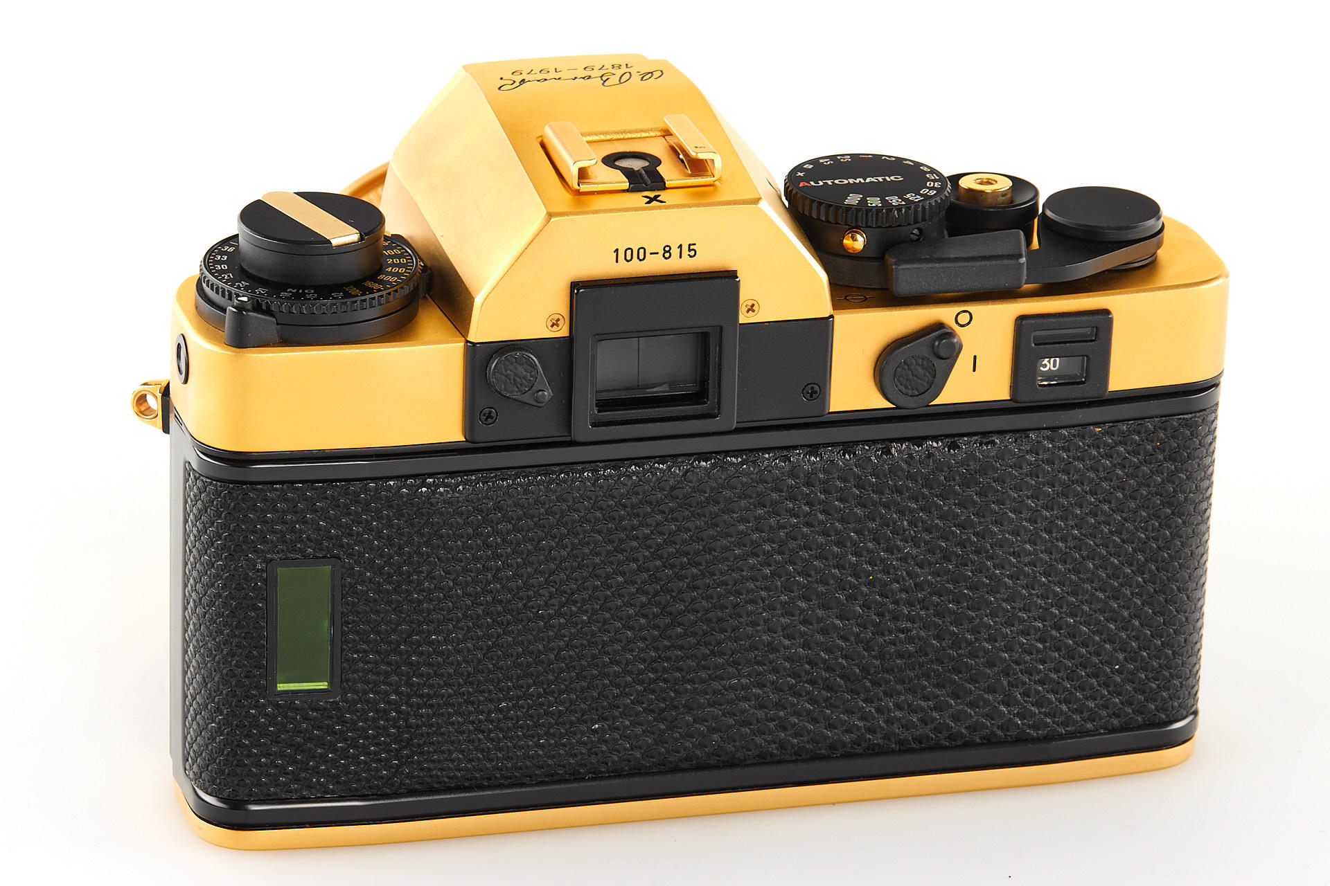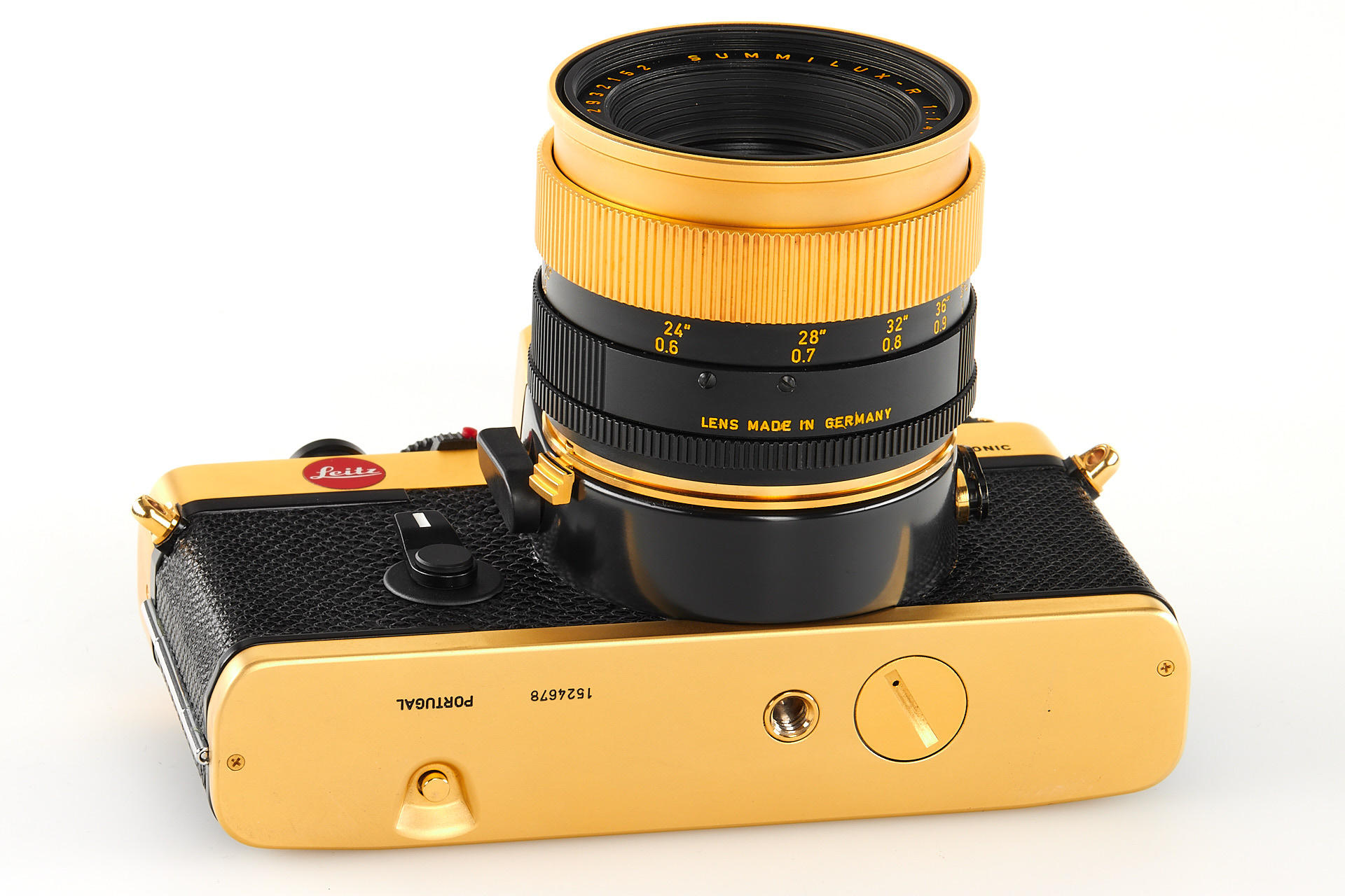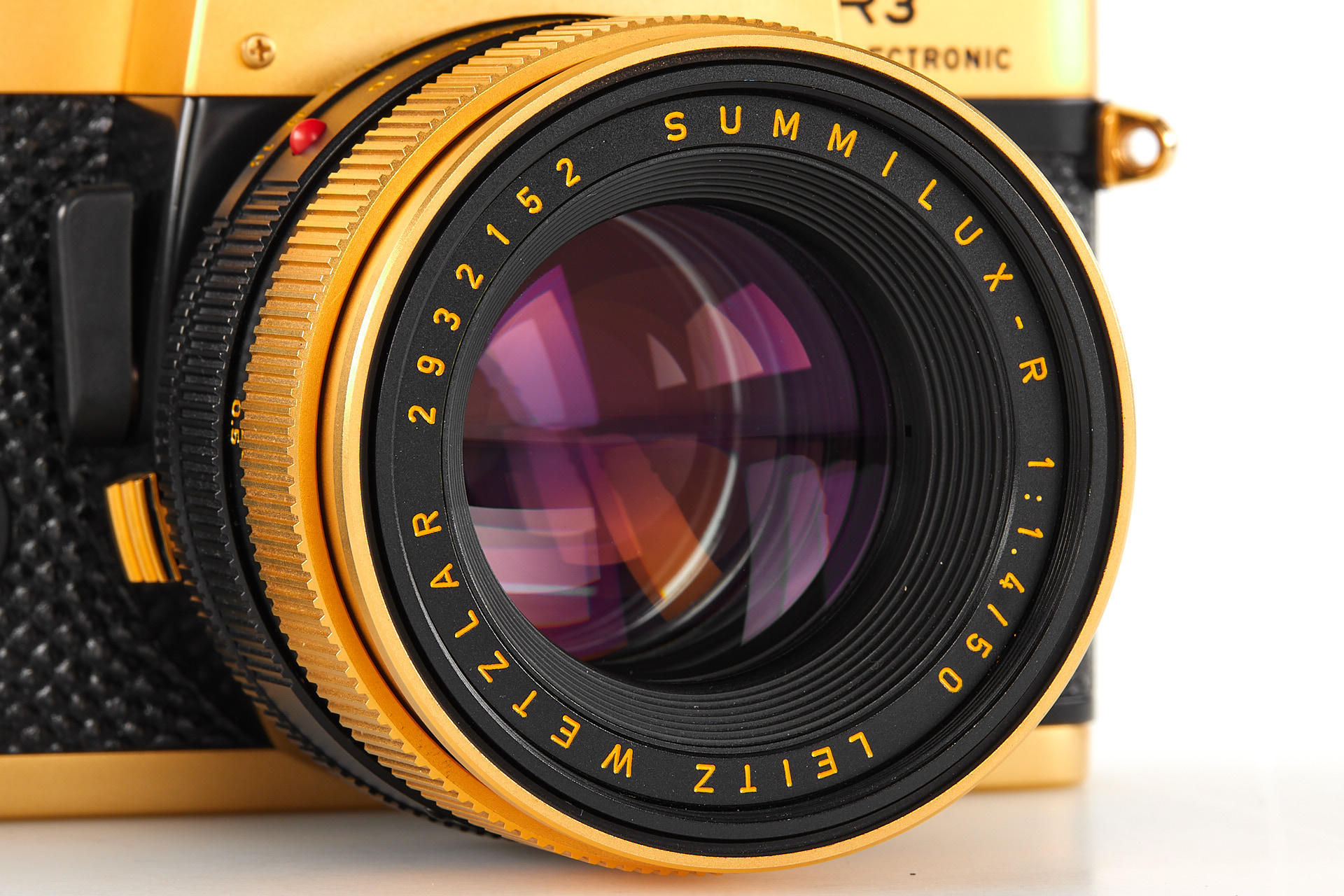 near mint 24 carats gold-plated R3, issued for the 100th anniversary of the birth of the inventor of the Leica, Oskar Barnack, body no.1524678, gold-plated Summilux-R 1.4/50mm no.2932152, with all papers and accessories, wooden presentation box, matching maker's box