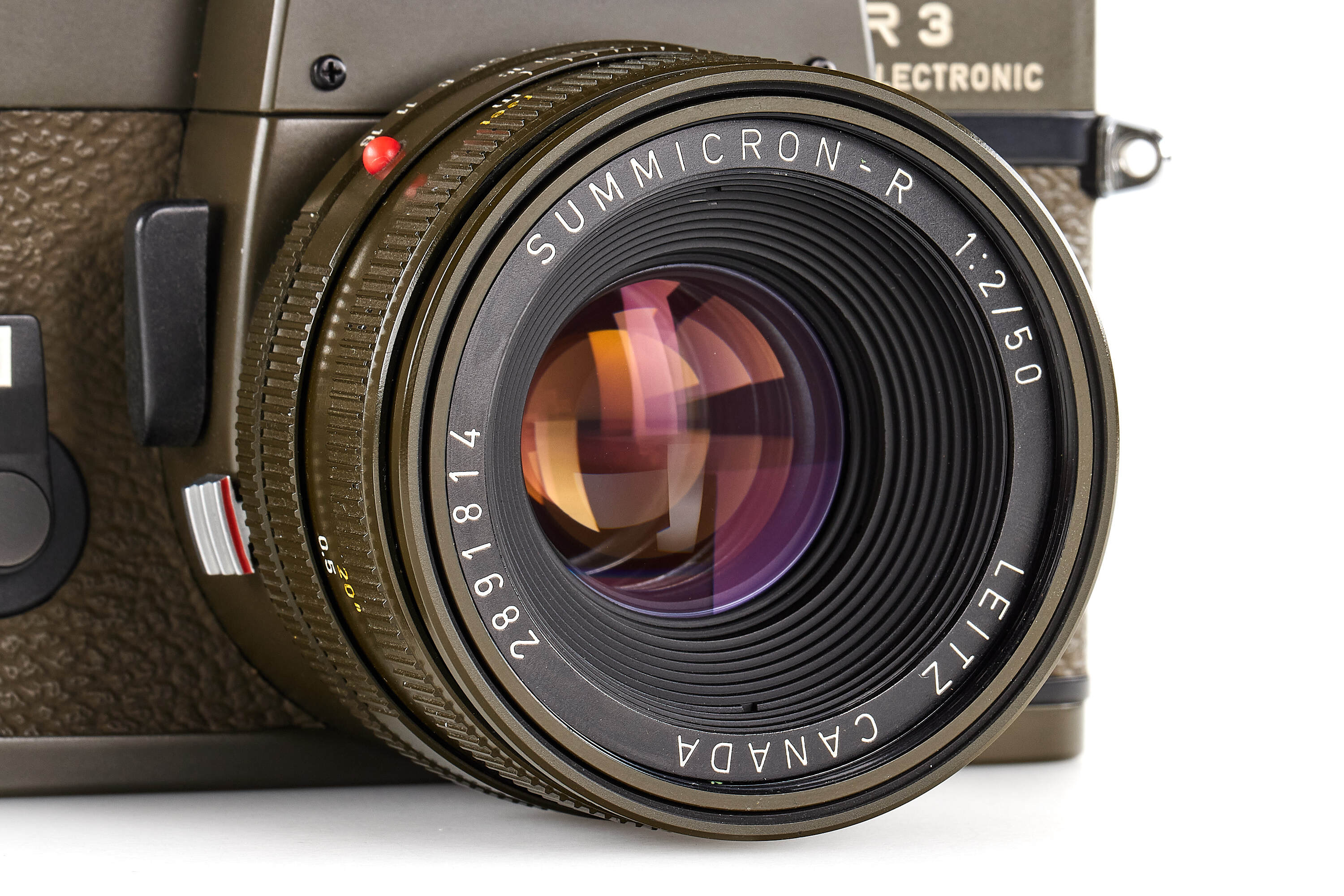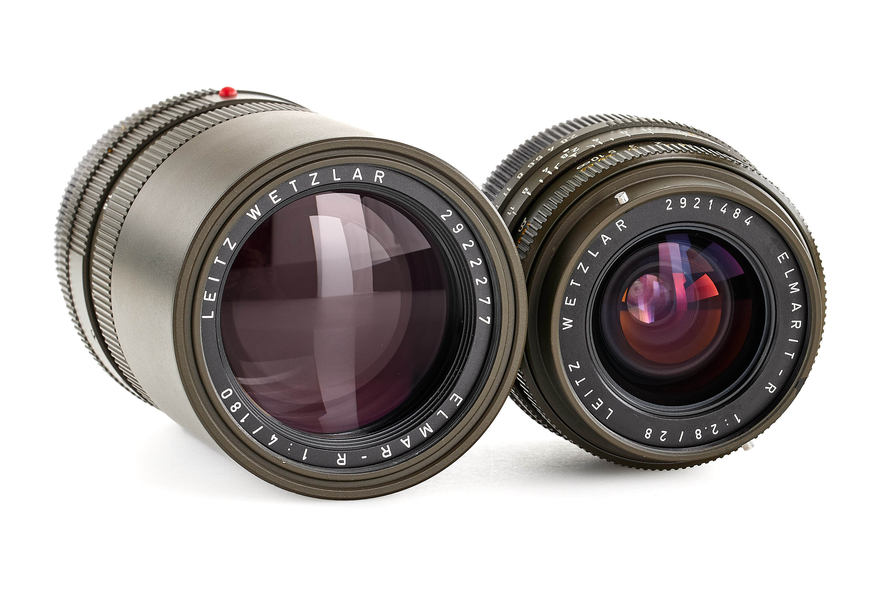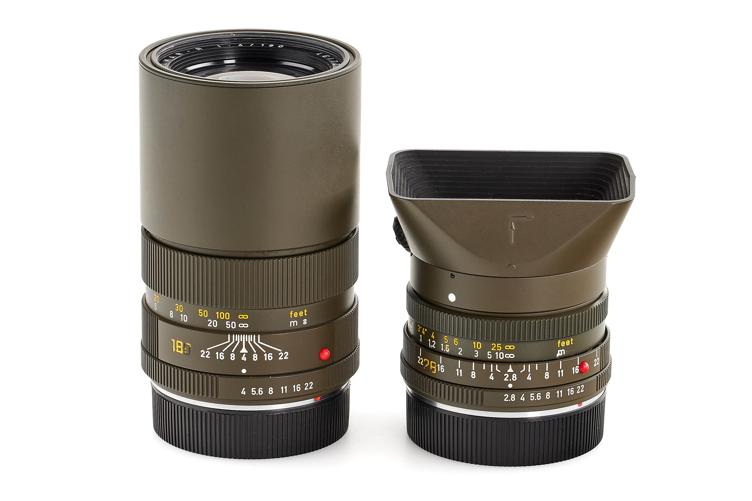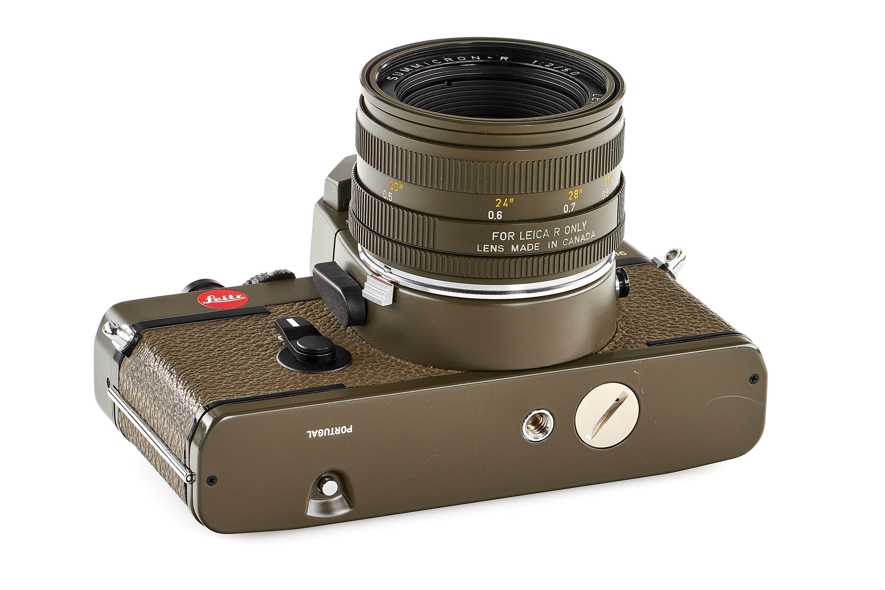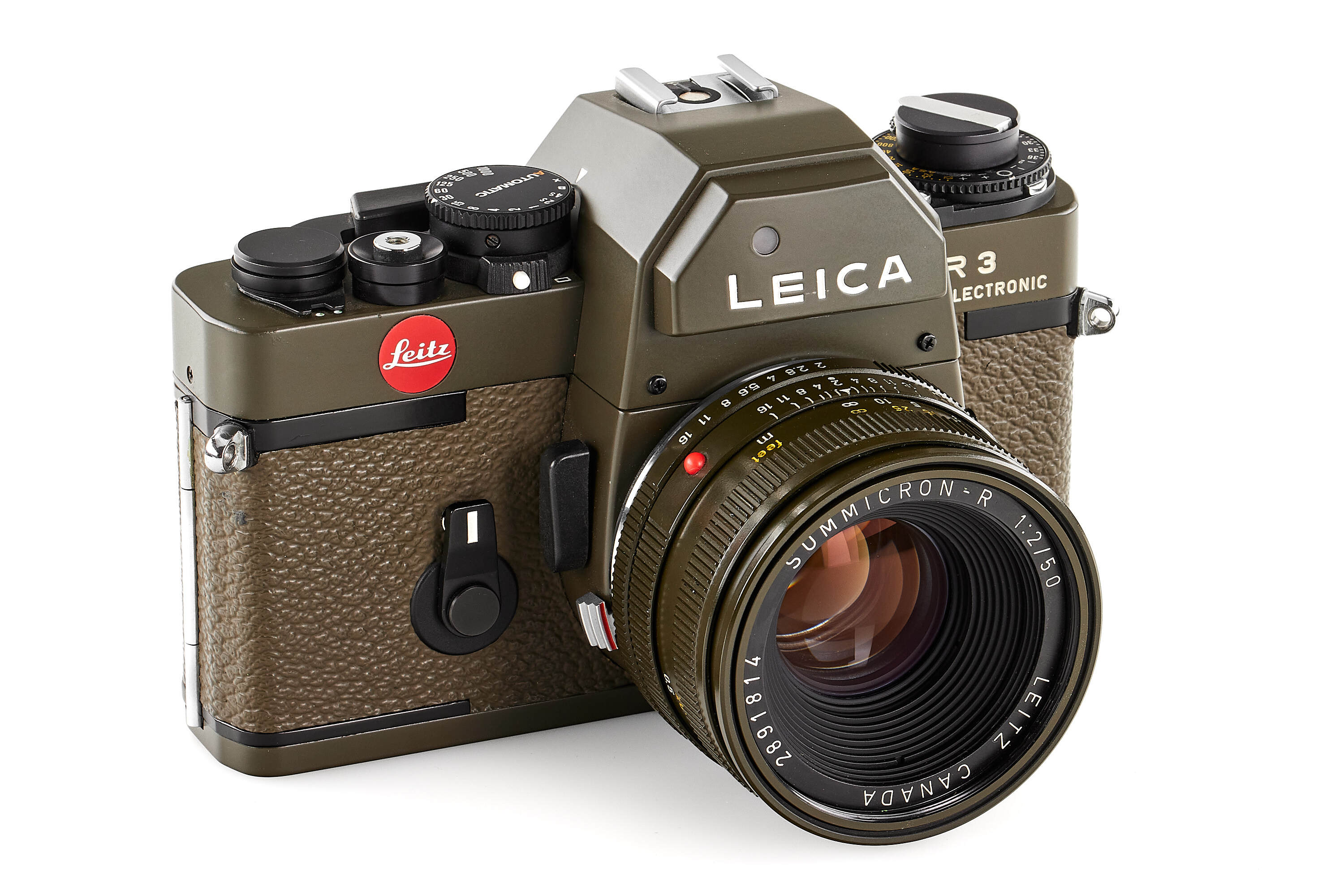 Limited edition Leica R3 outfit finished in olive green, comprising a camera body no.1483062 (edition no. C662), Elmarit-R 2.8/28mm no.2921484 with matching olive 12509 hood, Summicron-R 2/50mm no.2891814, and Elmar-R 4/180mm no.2922277. Only about 5,000 examples of the Leica R3 Olive were produced. This set is complemented by a matching olive-green Leica canvas bag.