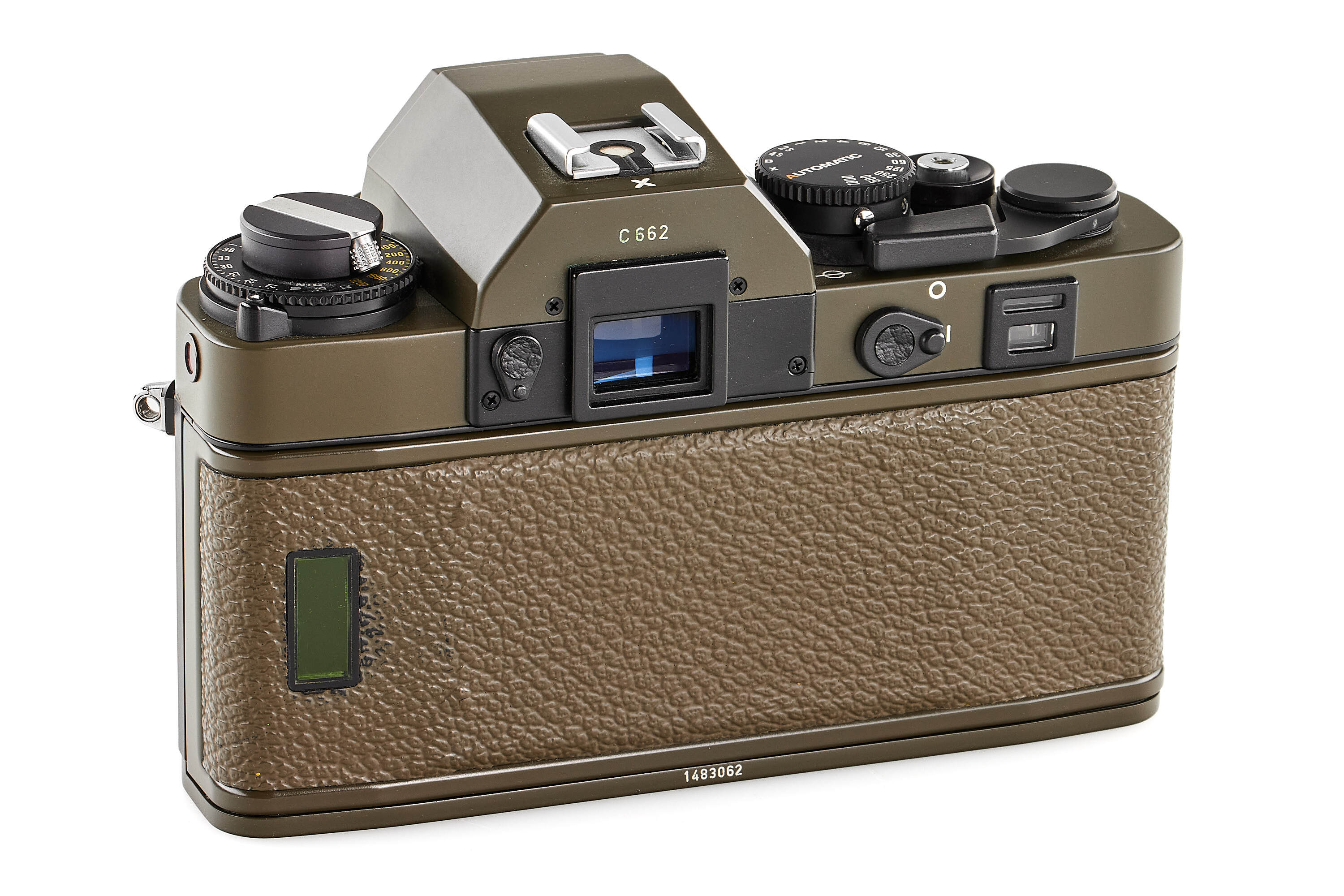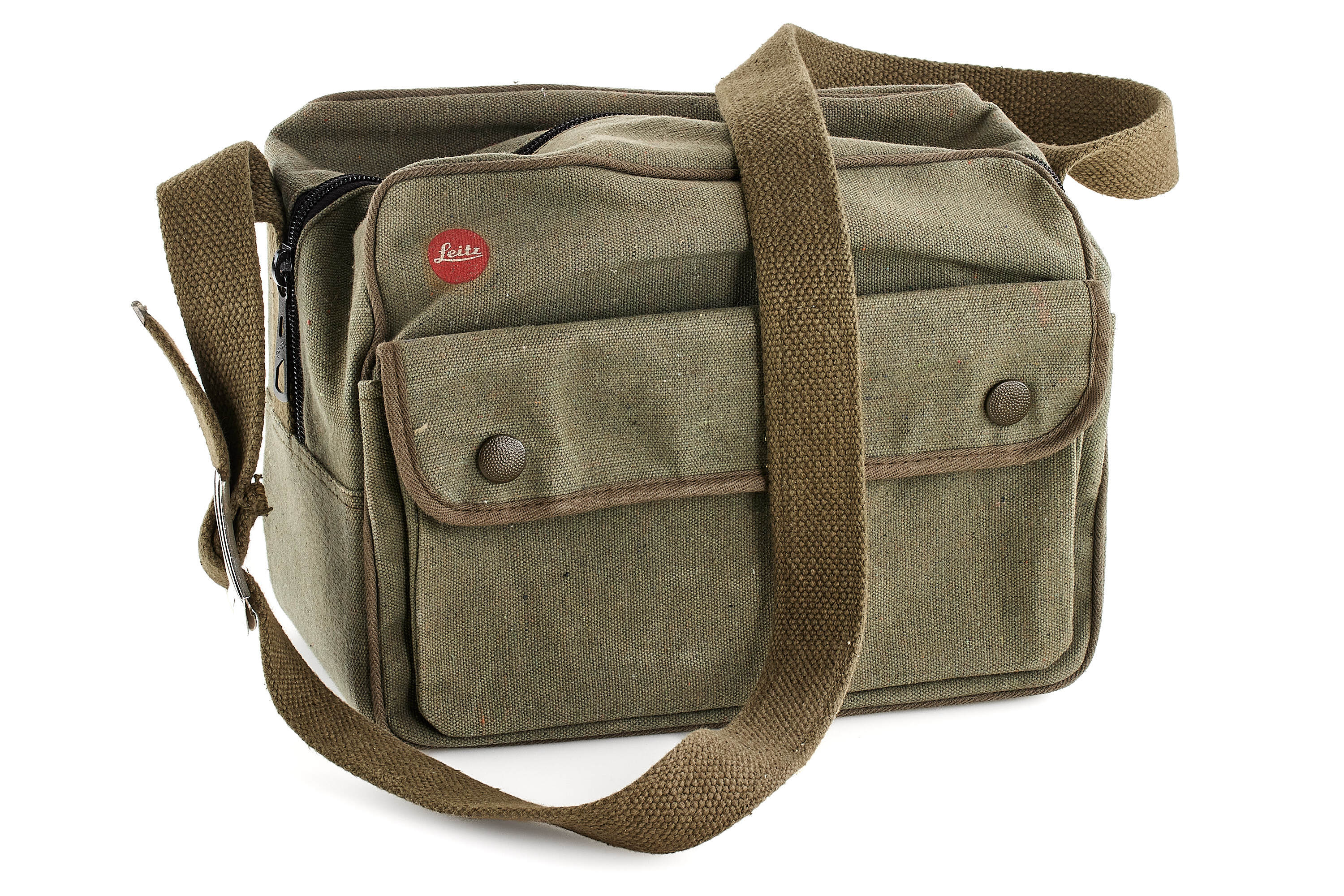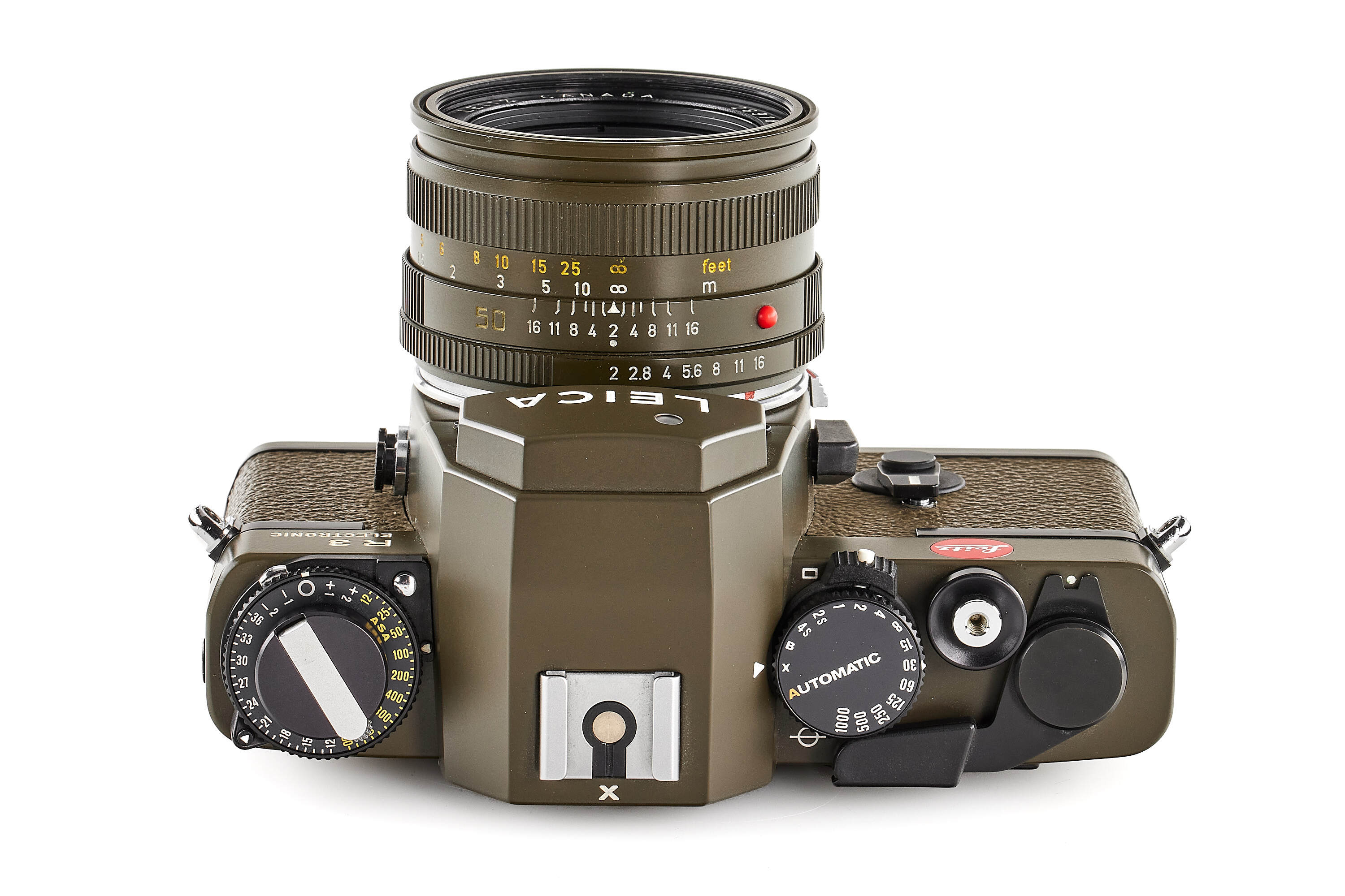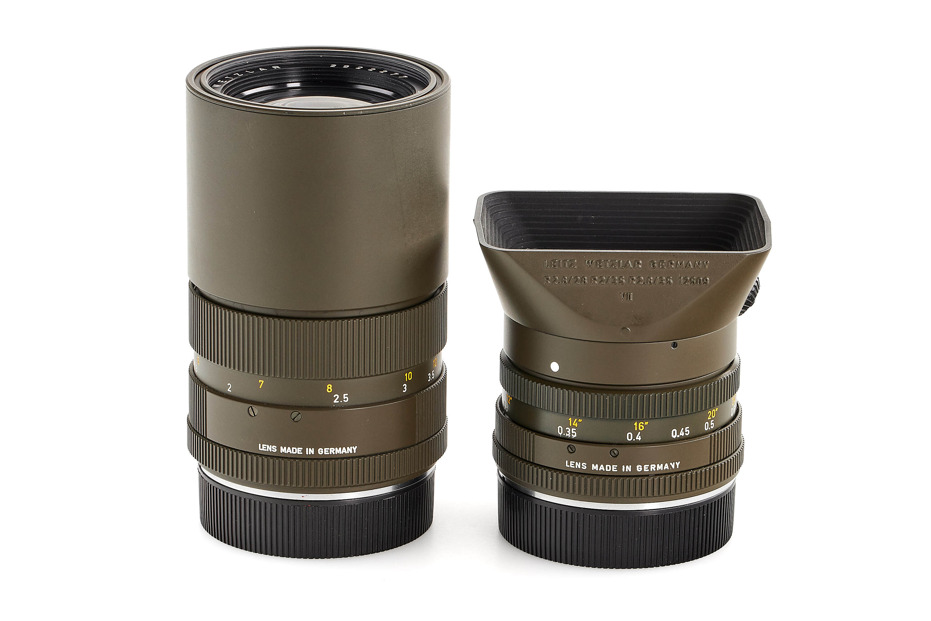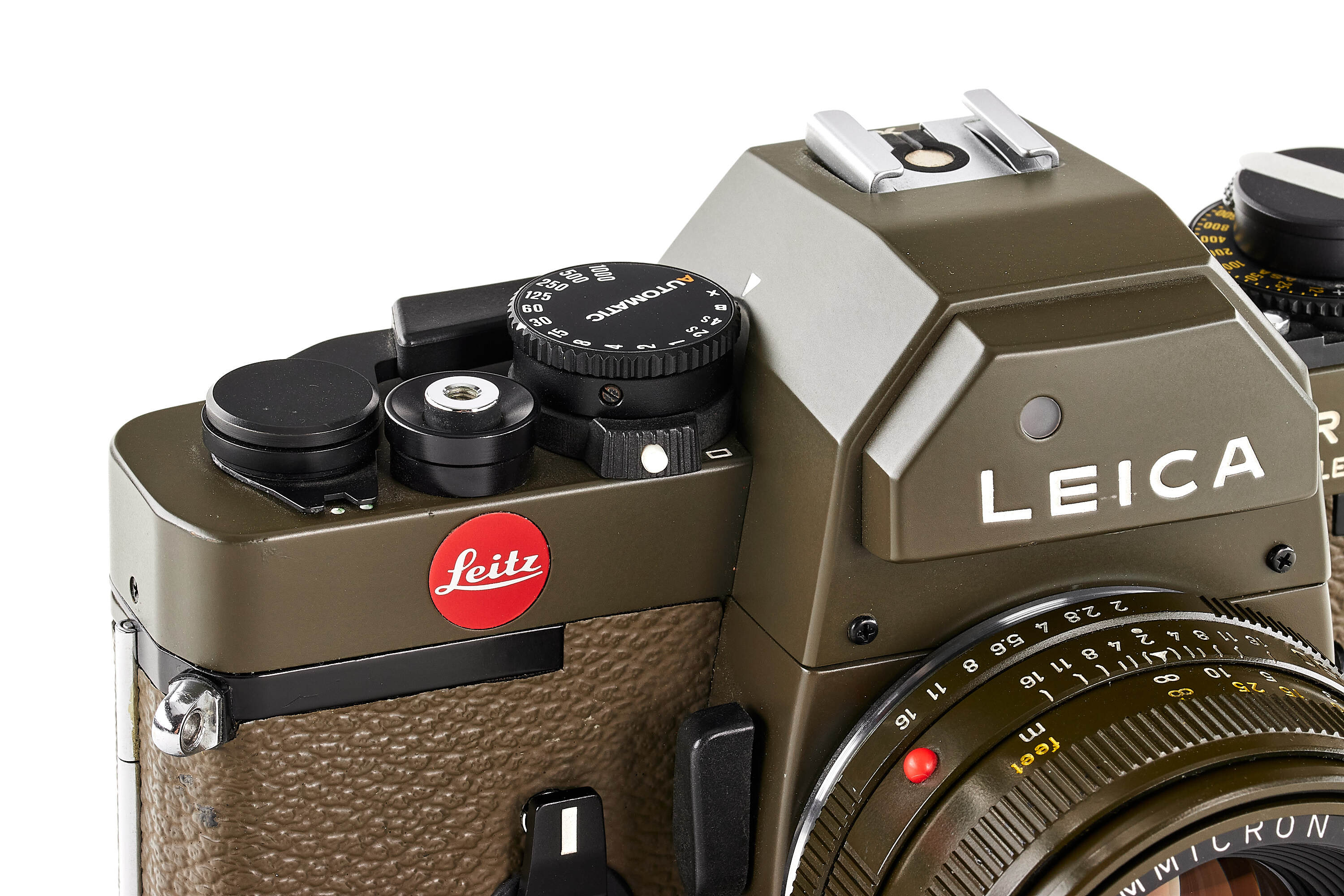 Limited edition Leica R3 outfit finished in olive green, comprising a camera body no.1483062 (edition no. C662), Elmarit-R 2.8/28mm no.2921484 with matching olive 12509 hood, Summicron-R 2/50mm no.2891814, and Elmar-R 4/180mm no.2922277. Only about 5,000 examples of the Leica R3 Olive were produced. This set is complemented by a matching olive-green Leica canvas bag.