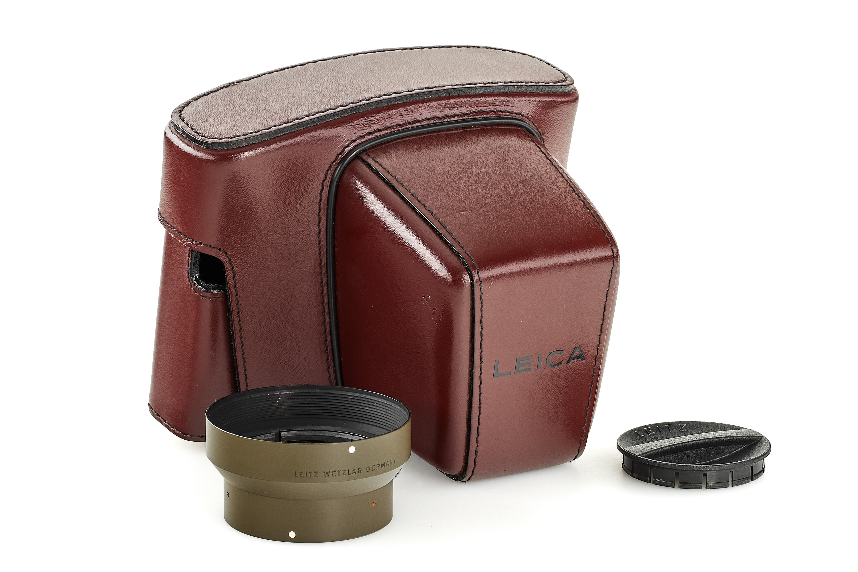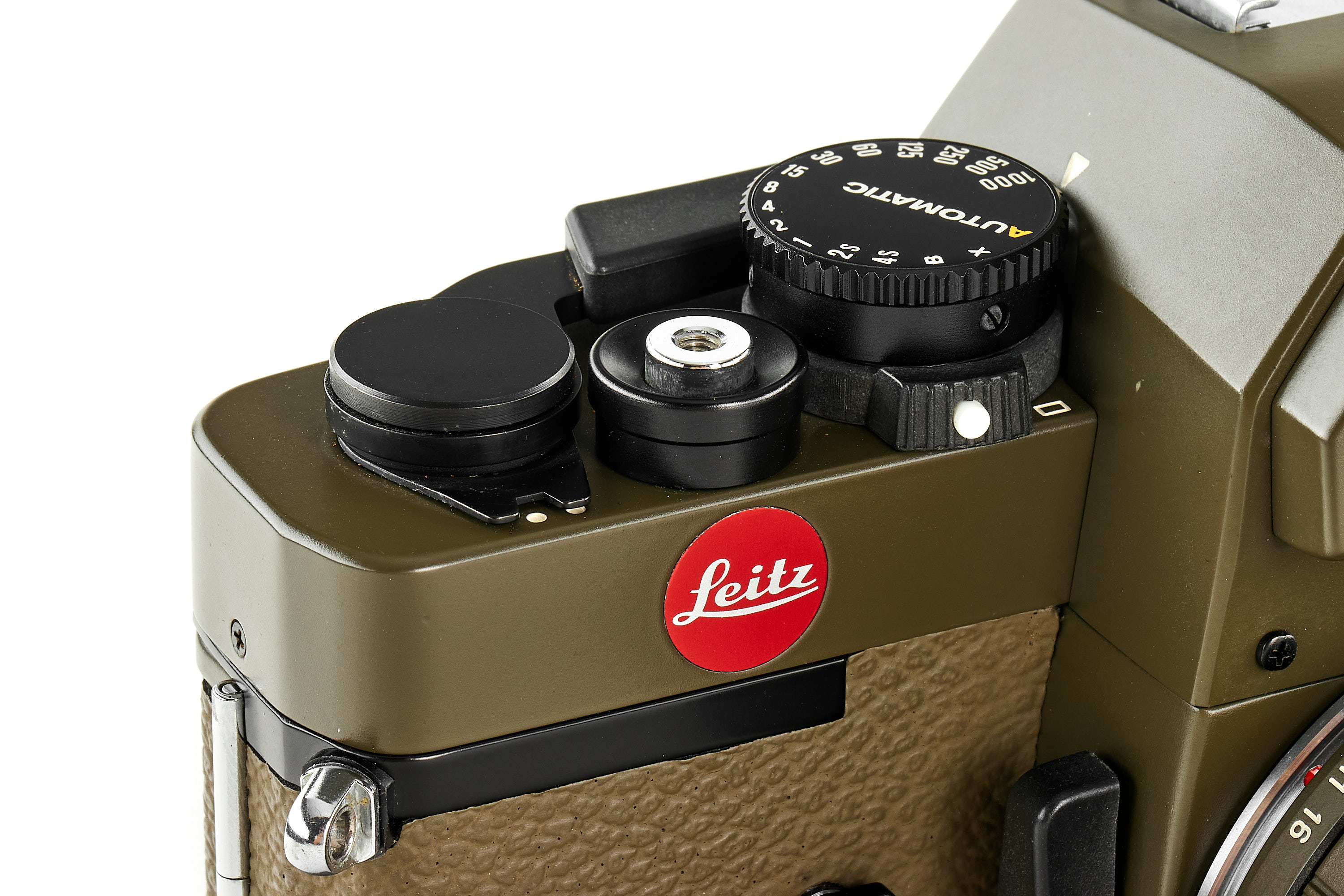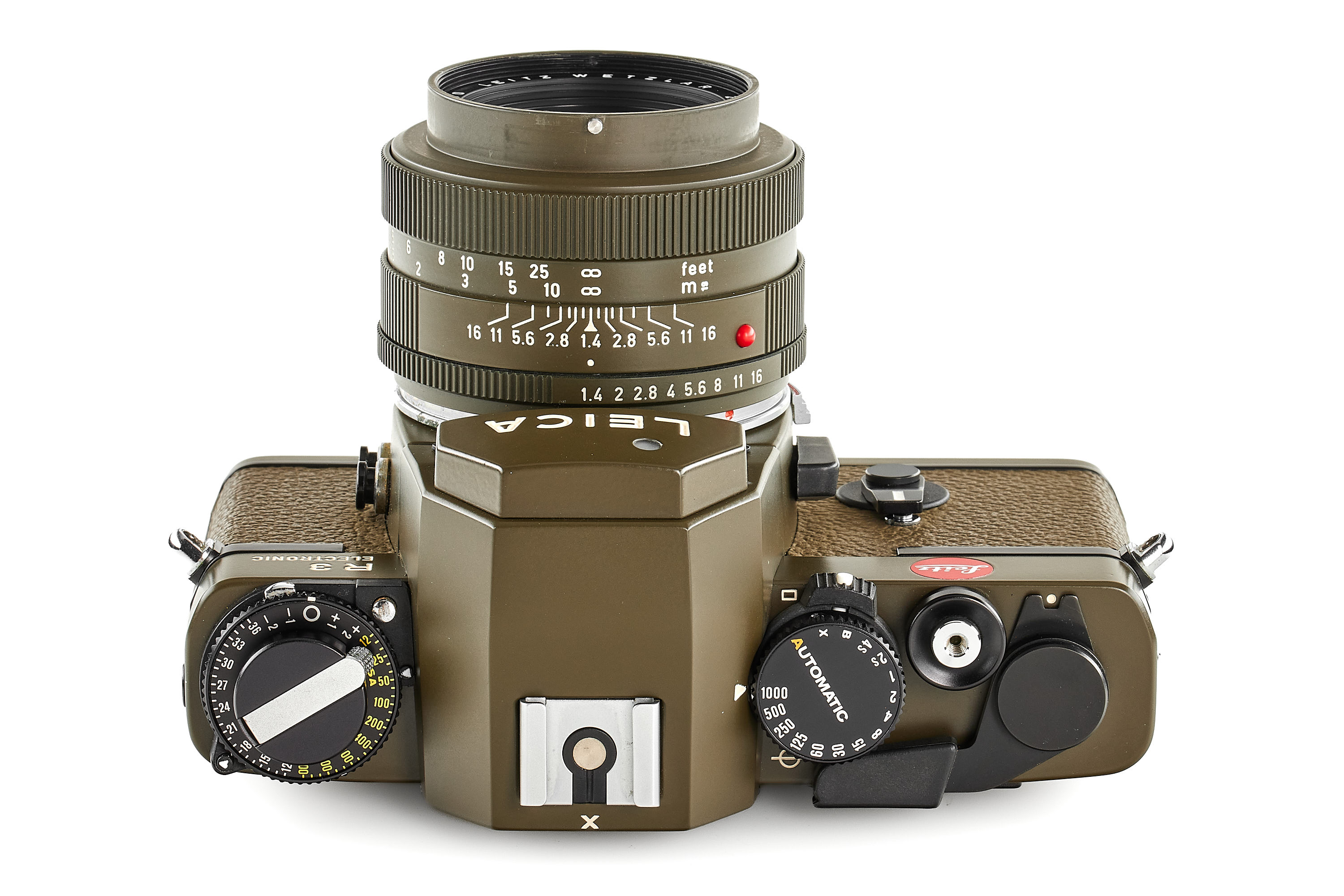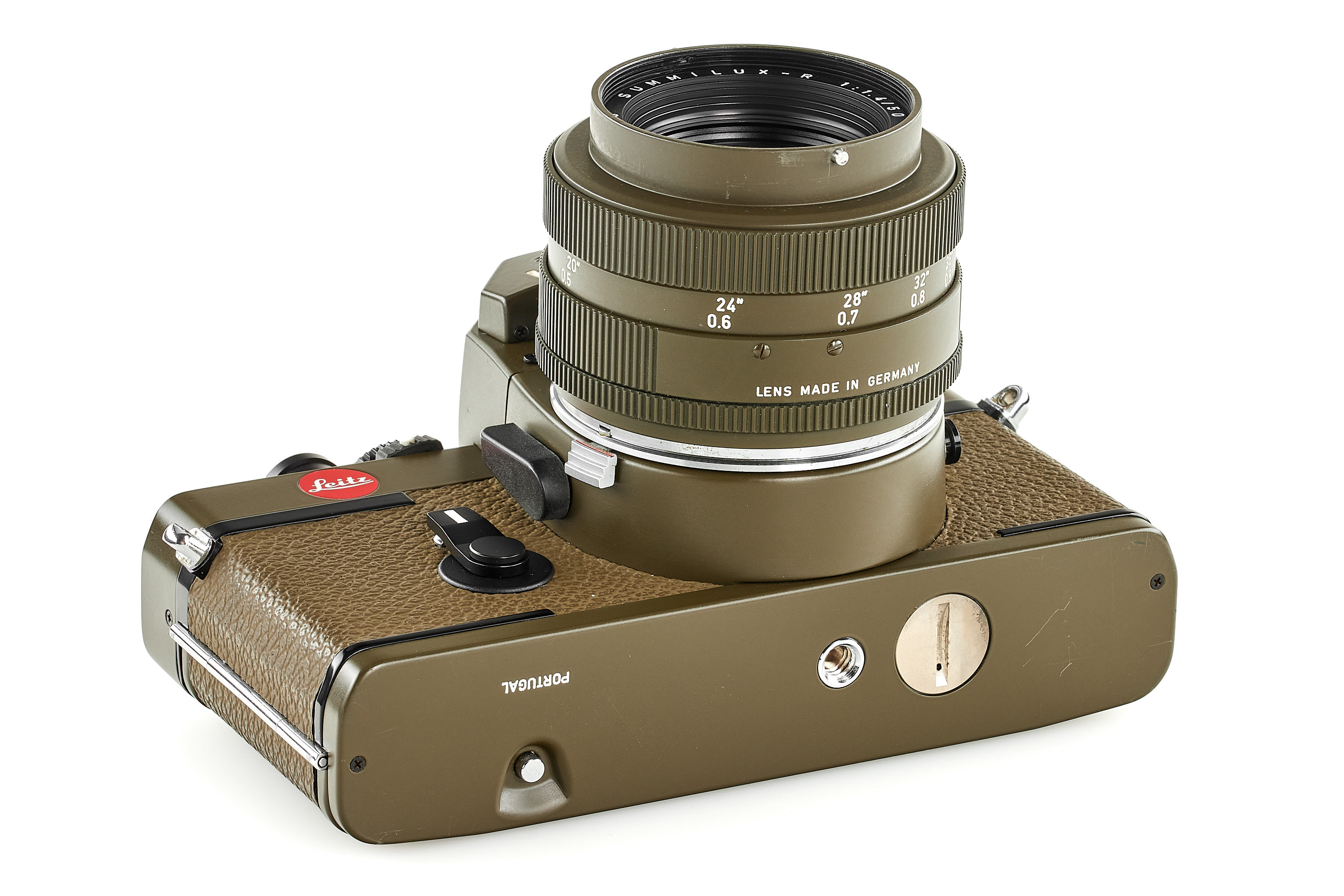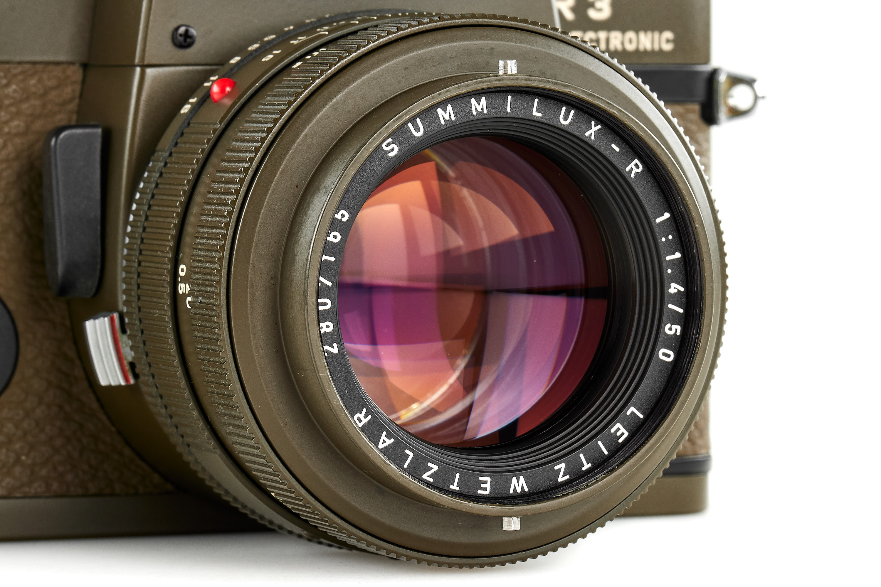 Special edition olive green Leica R3 body in mint condition and working order, with the engraving 'E 288' on the rear, with matching olive green Summilux 1.4/50mm 11877 no.2807165 (clean and clear optics), with matching olive hood, front lens cap and leather case.