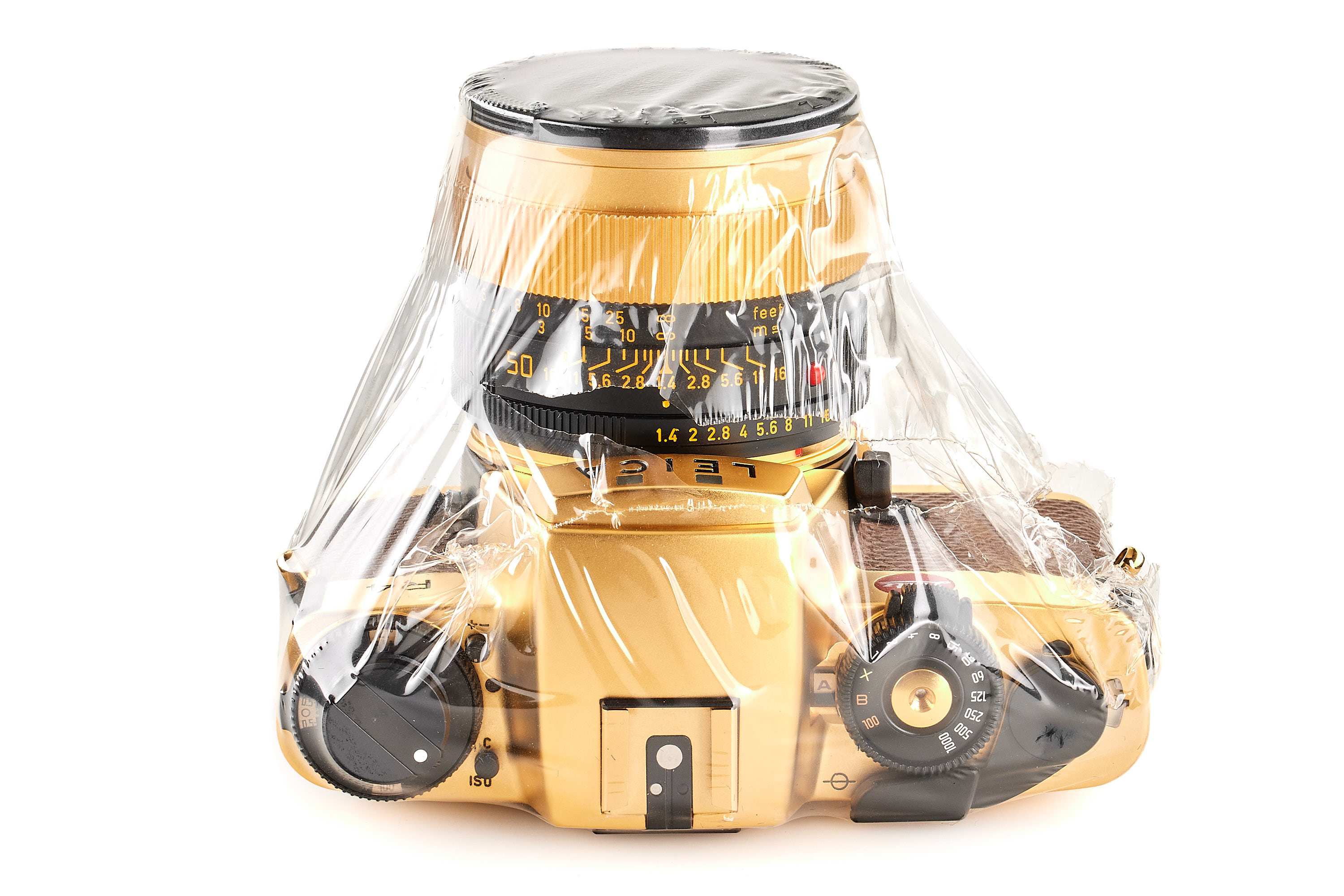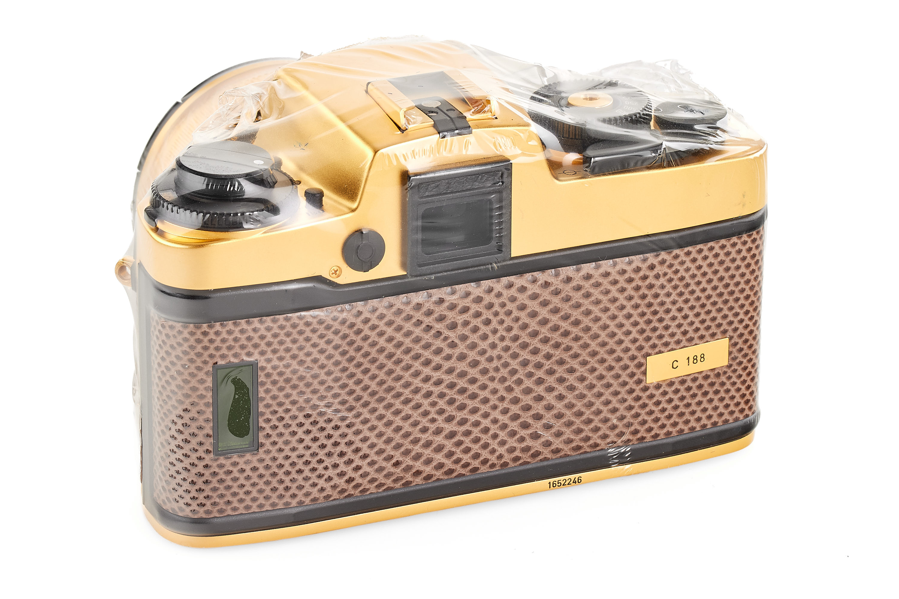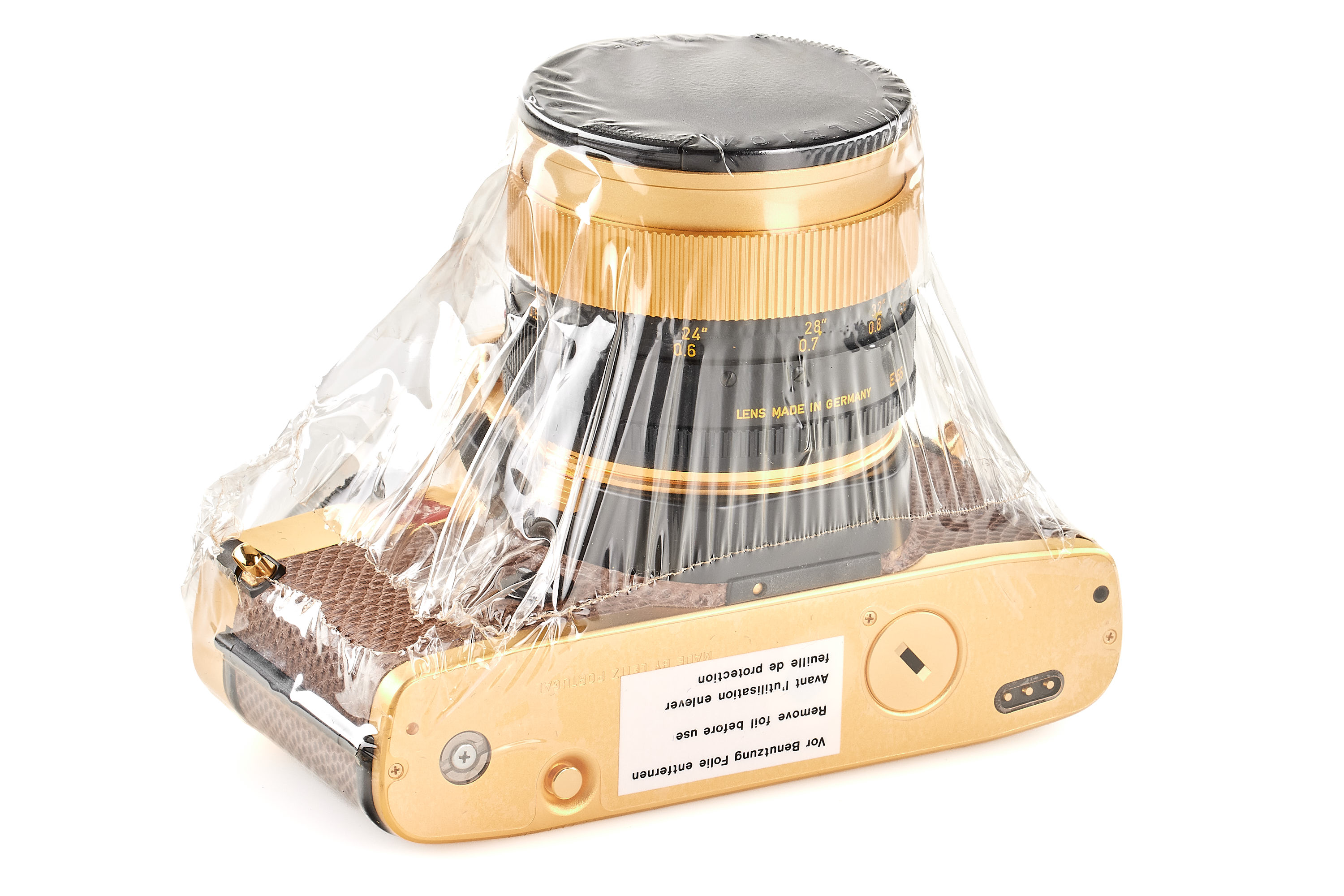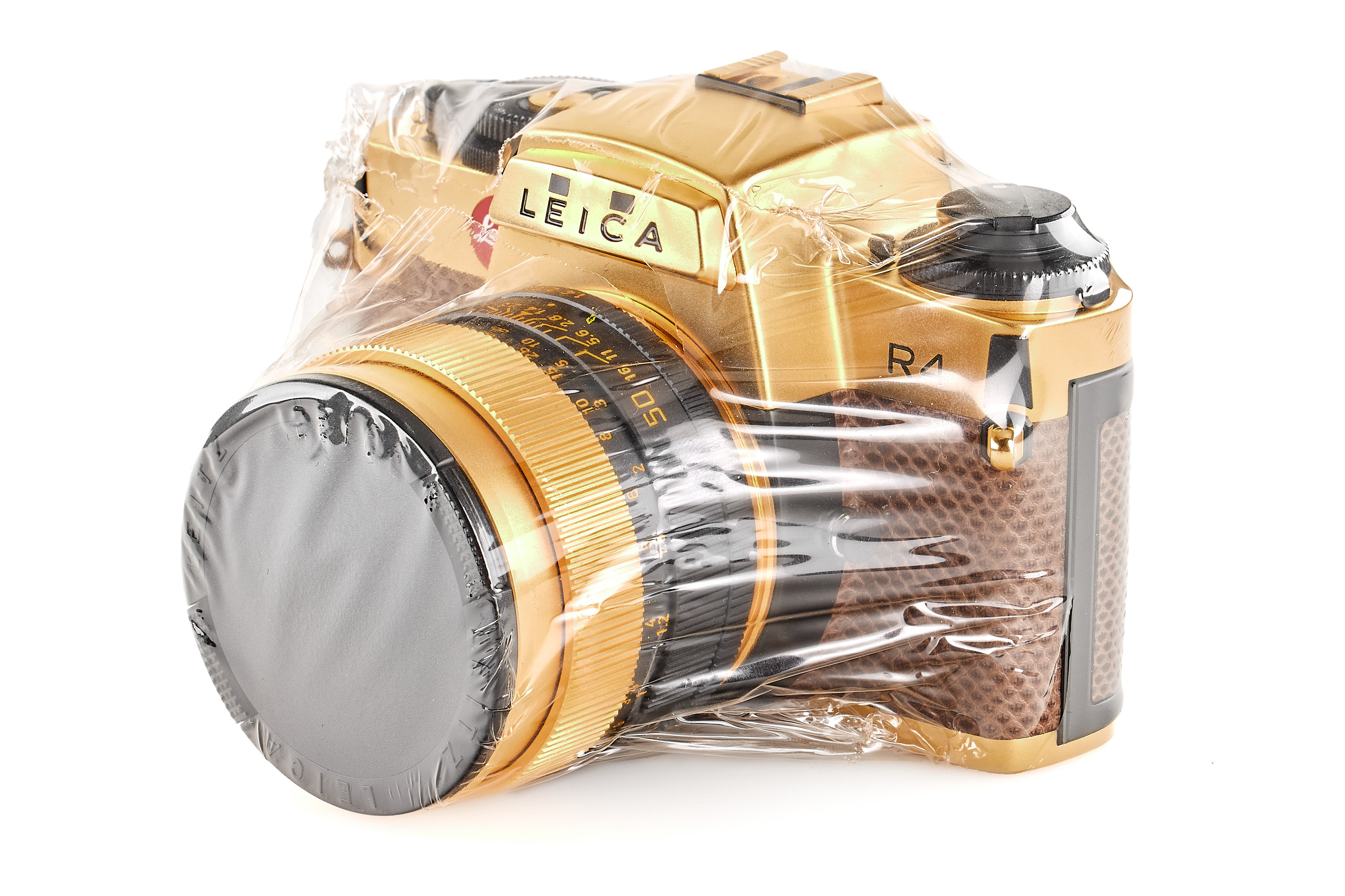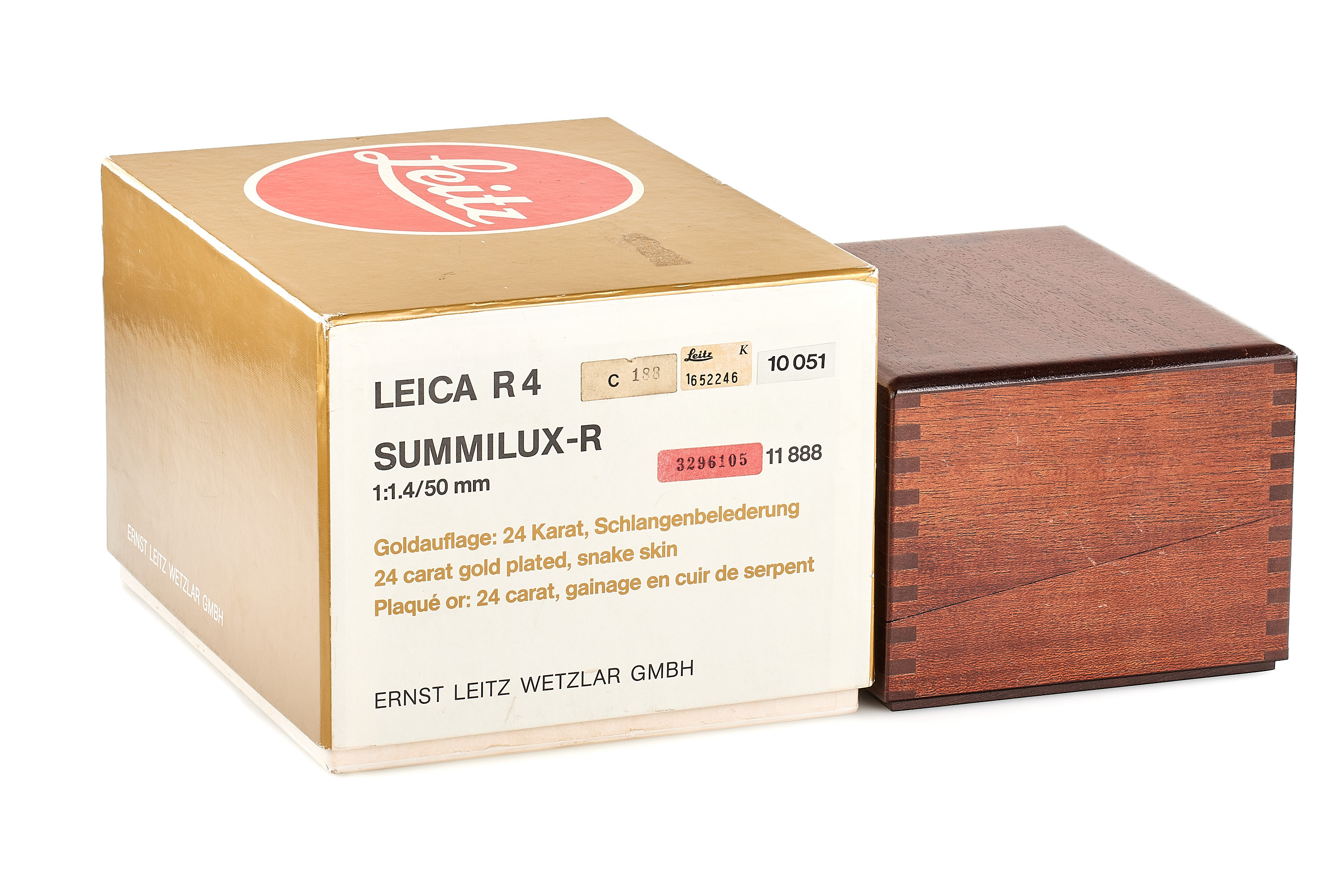 Limited edition gold plated R4 (1000 pieces) in lizardskin covering, in unused condition, still sealed in plastic (partially open), body number 1652246, with matching gold plated Summilux-R 1.4/50mm no.3296105), with front lens cap, strap, presentation box and maker's box.