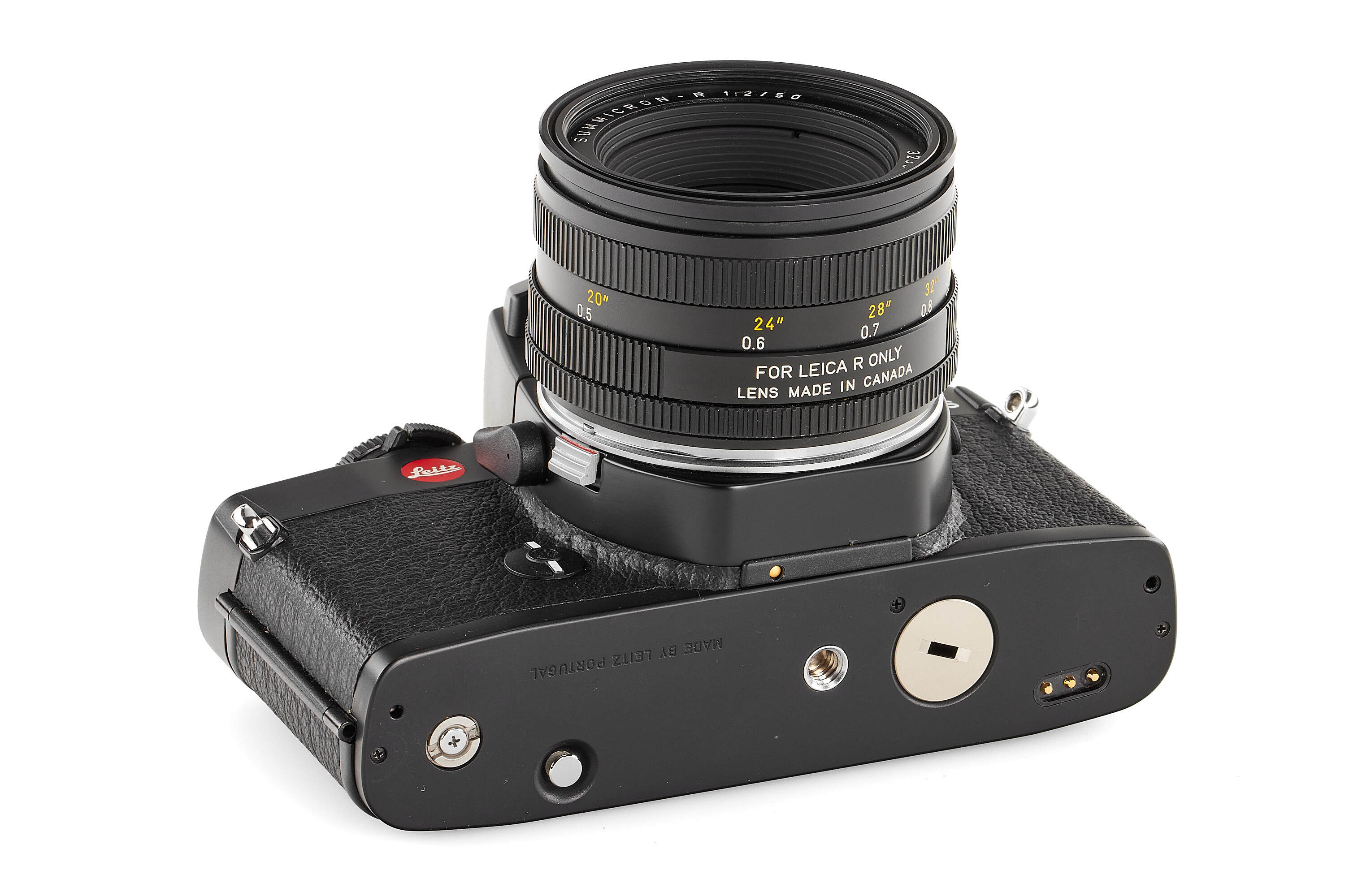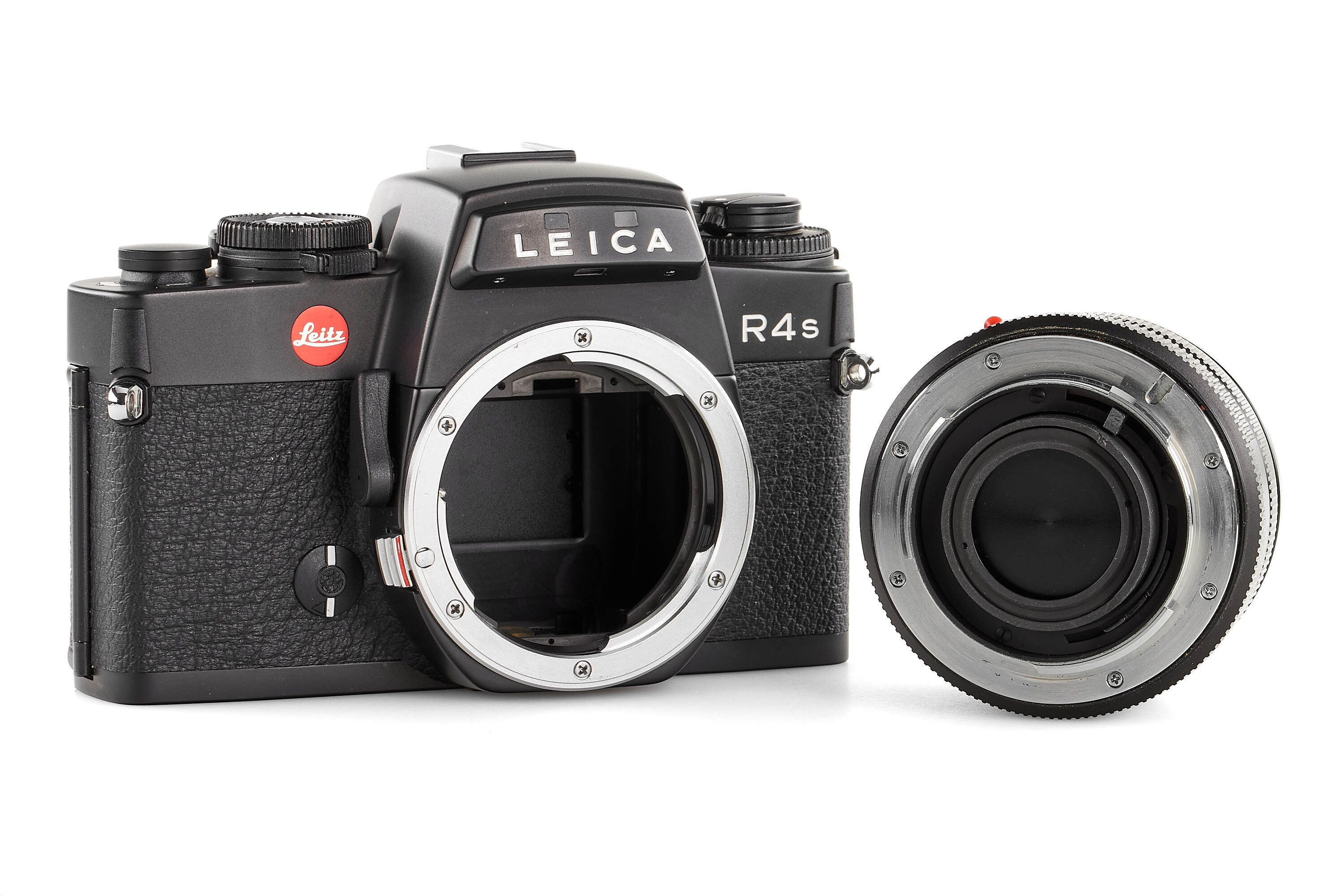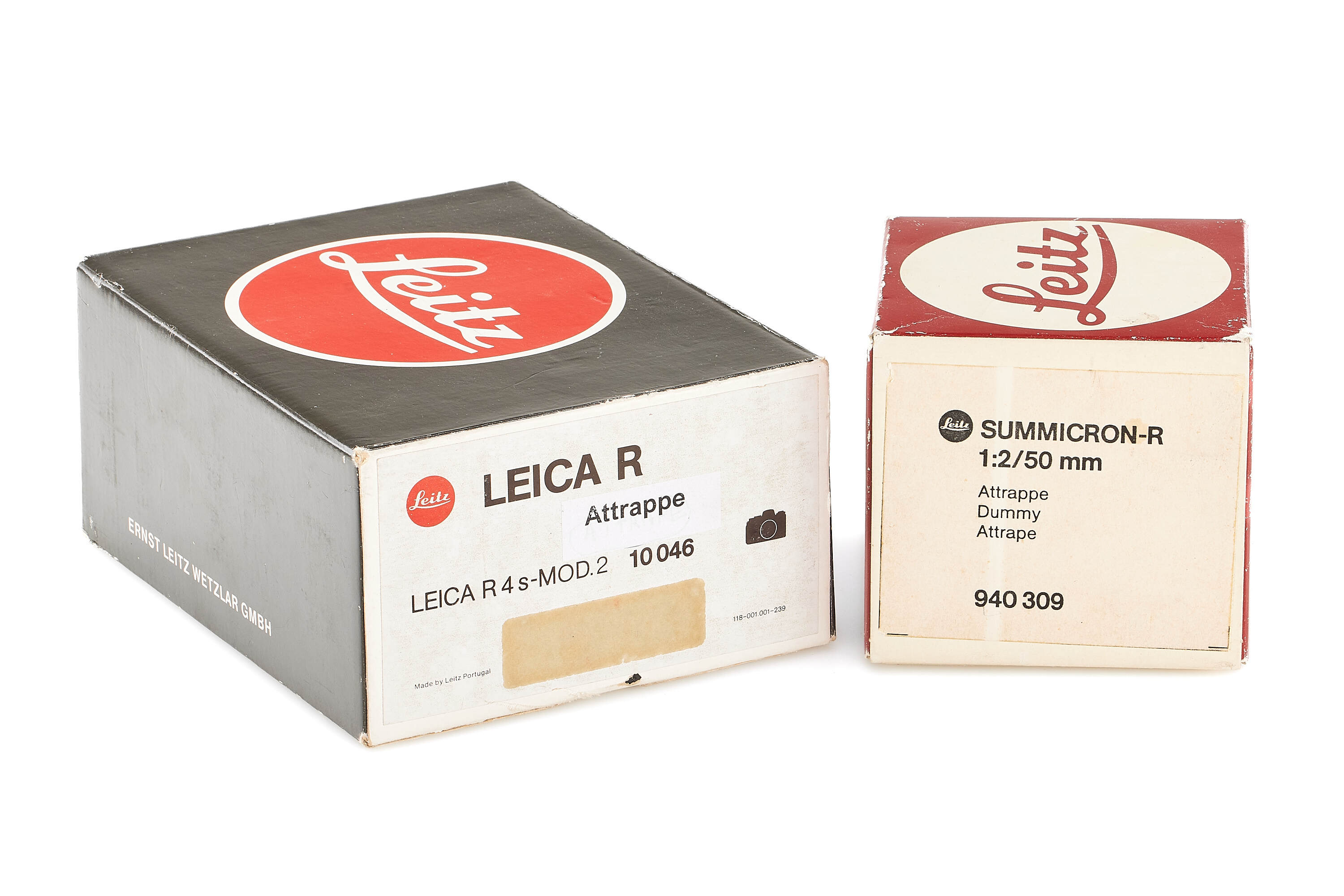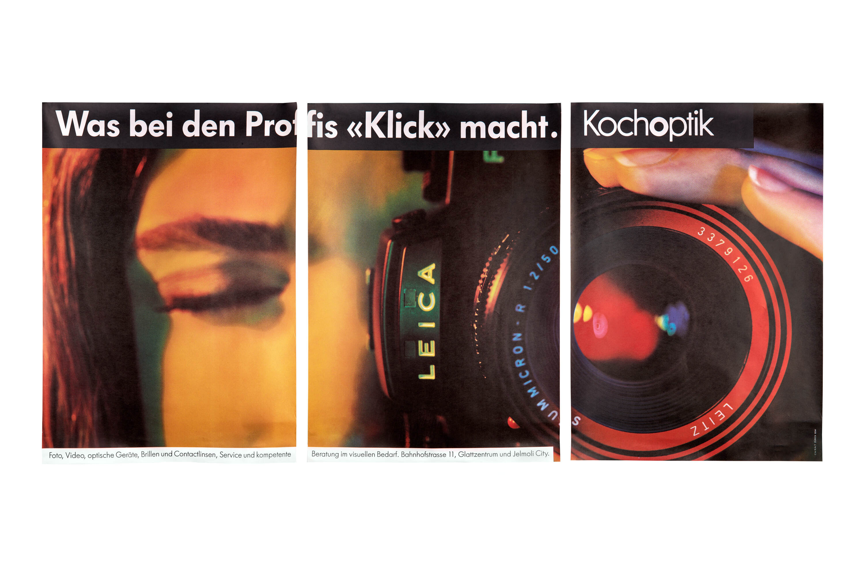 An impressive Leica R4 poster from the famous Swiss Leica dealer Koch Optik, huge F12 poster format (286.5 cm x 128cm!), made out of three F4 (98.5 cm x 128cm) posters combined. The only example we have ever seen and is in excellent condition. Included with the poster is a mint Leica R4S dummy with a matching dummy Summicron 50mm lens.