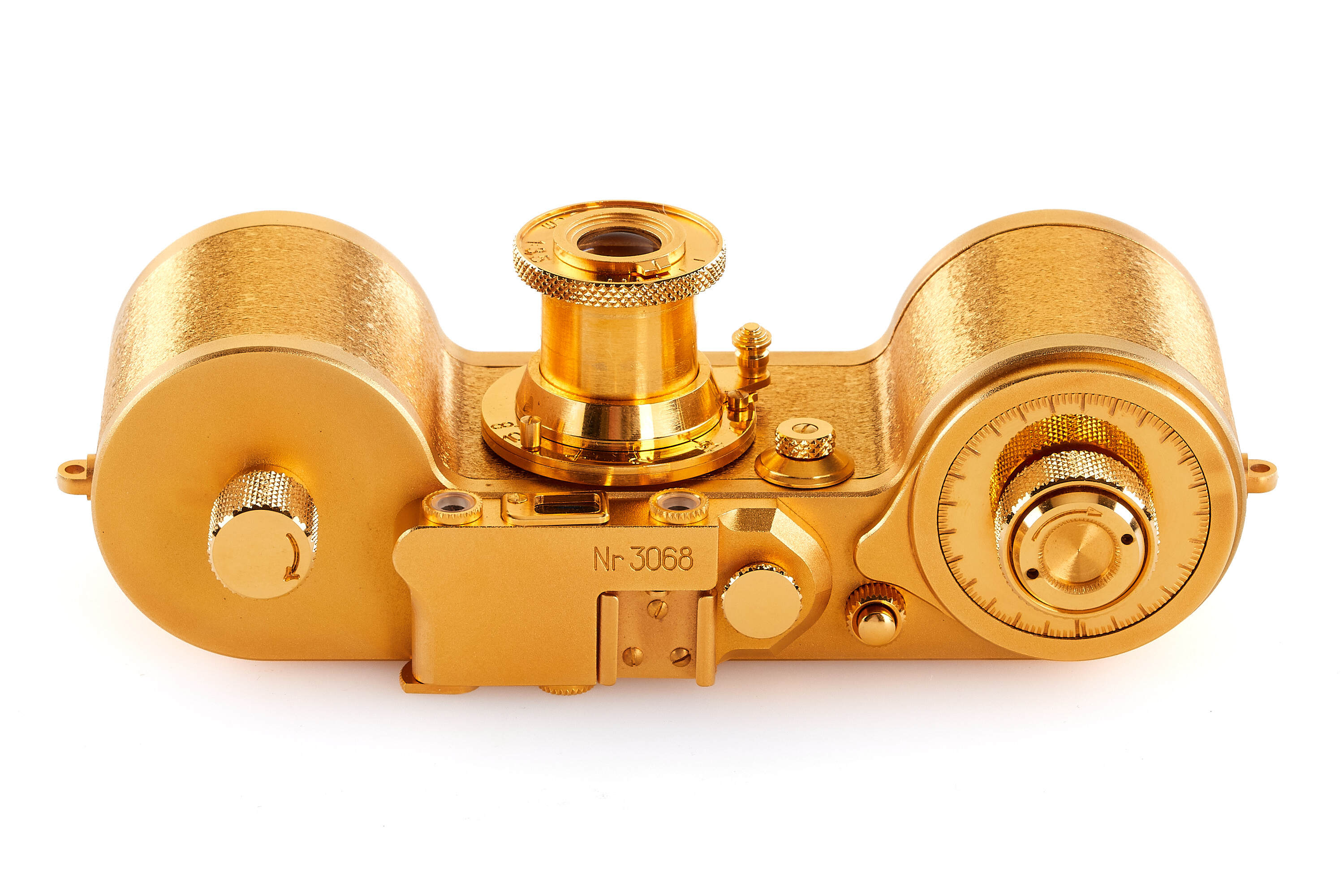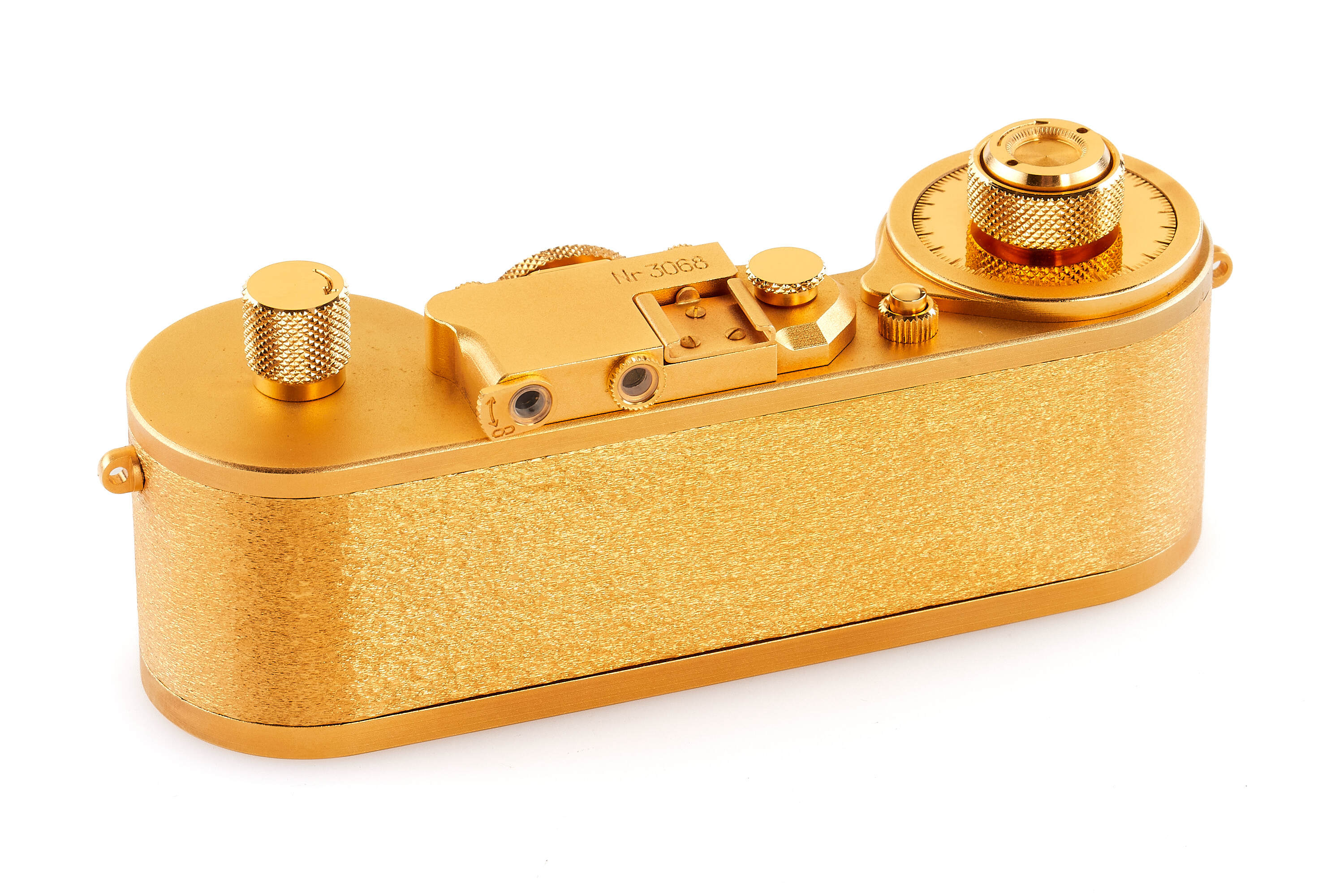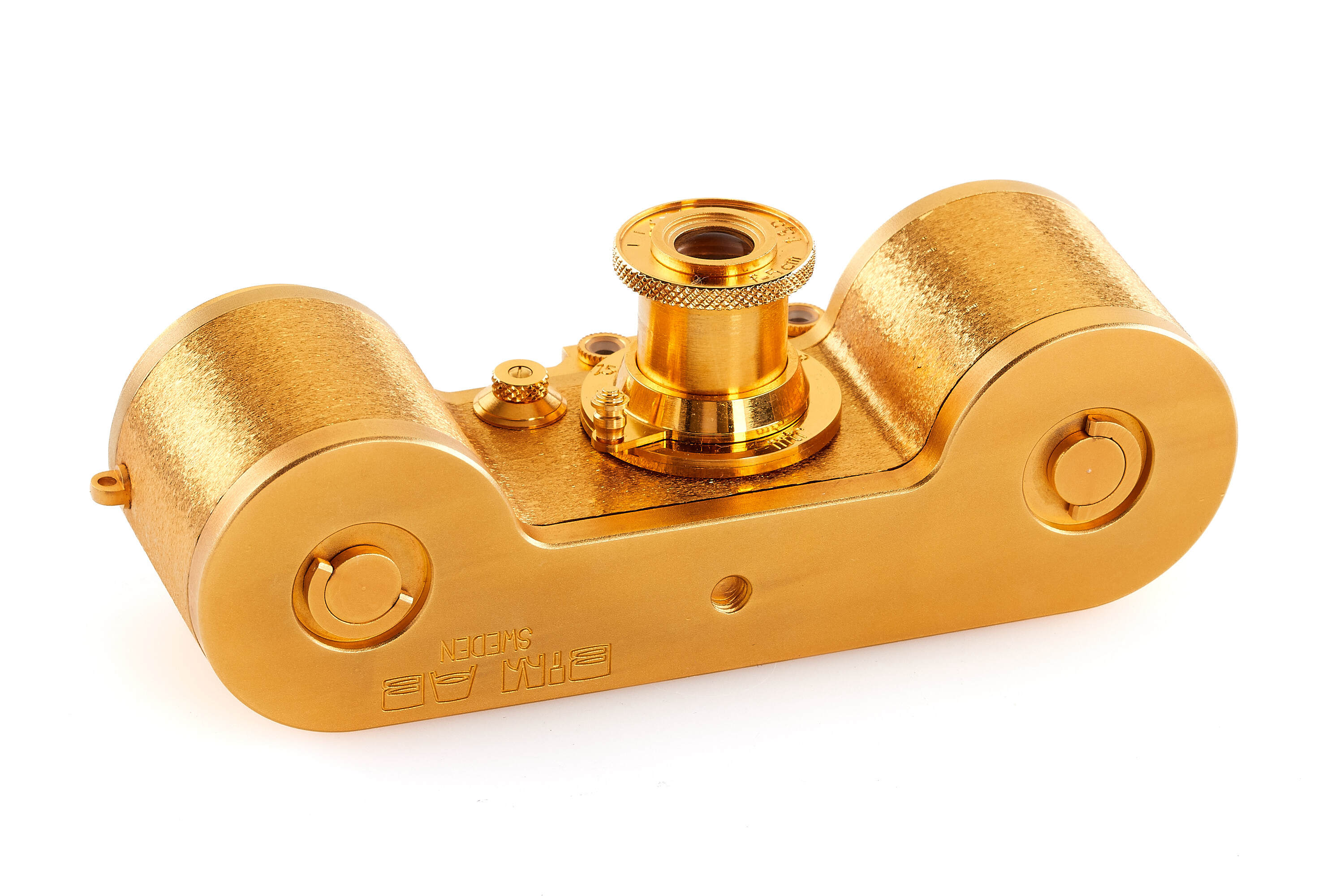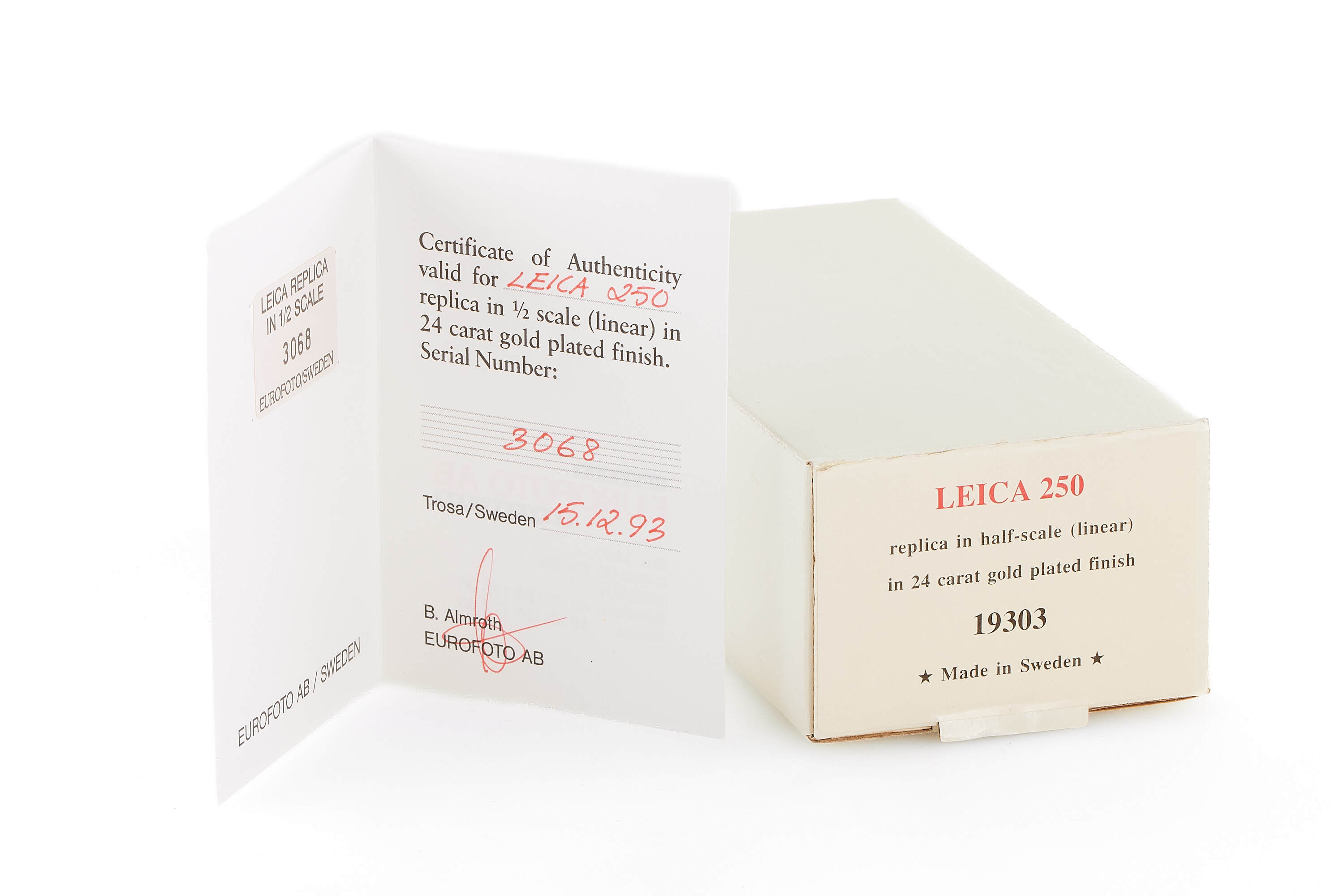 Rare 24-carat gold plated replica of Leica Reporter 250 with Elmar 3.5/5cm in scale 1:2 produced by Eurofoto in Sweden, in mint condition, with certificate of authenticity and maker's box.