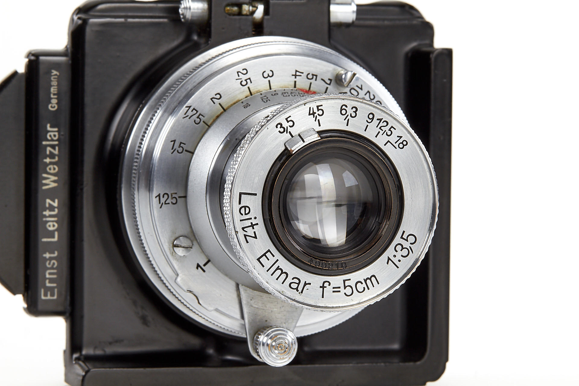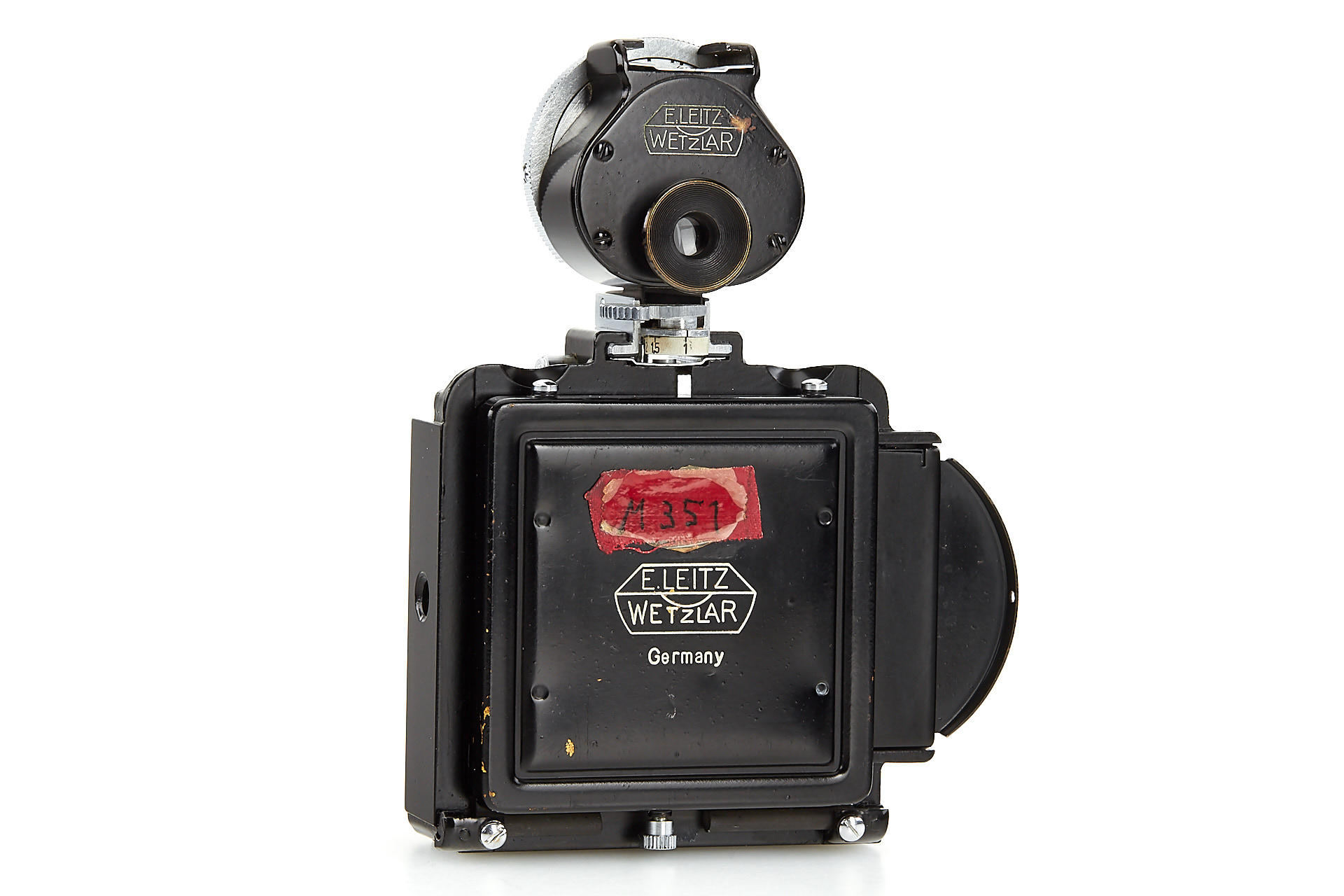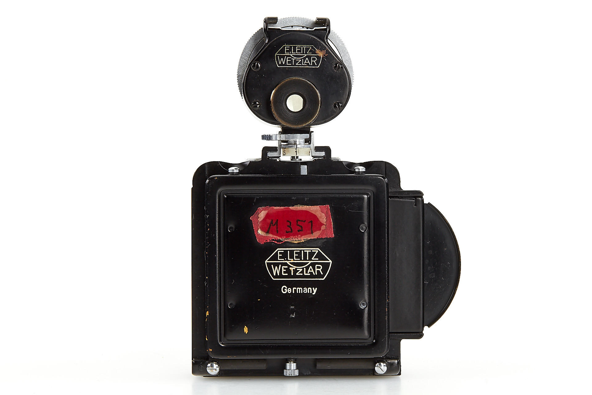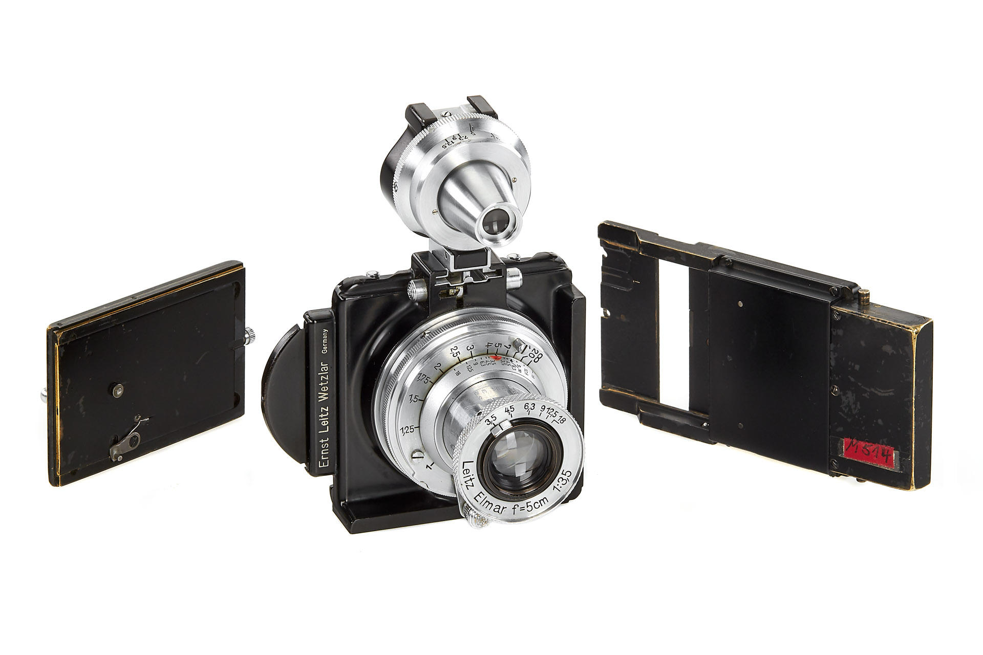 a unique square single exposure housing, for 5x5cm single exposures on film sheets, with removable back, dark slider, inclusive special cassette for two 24x36mm exposures on a single glass plate, both the camera housing as well as the cassette with original Leica Museum inventory stickers, with uncoated Elmar 3.5/5cm no.499218, VIOOH finder (unnumbered), and a TOOUG tripod, this camera is pictured in Wilhelm Albert 'Geburtstage der Leitz-Foto-Konstruktionen ab1927' on page 43+44