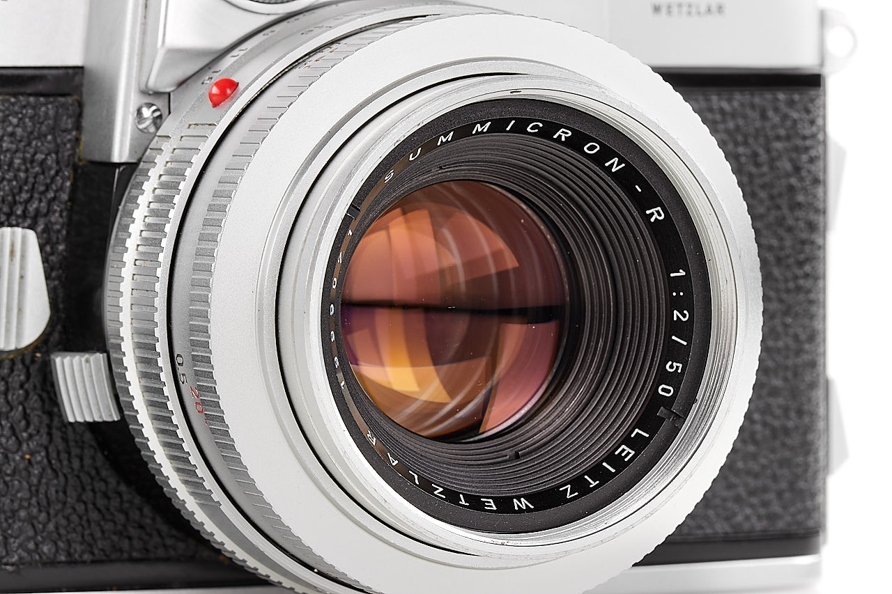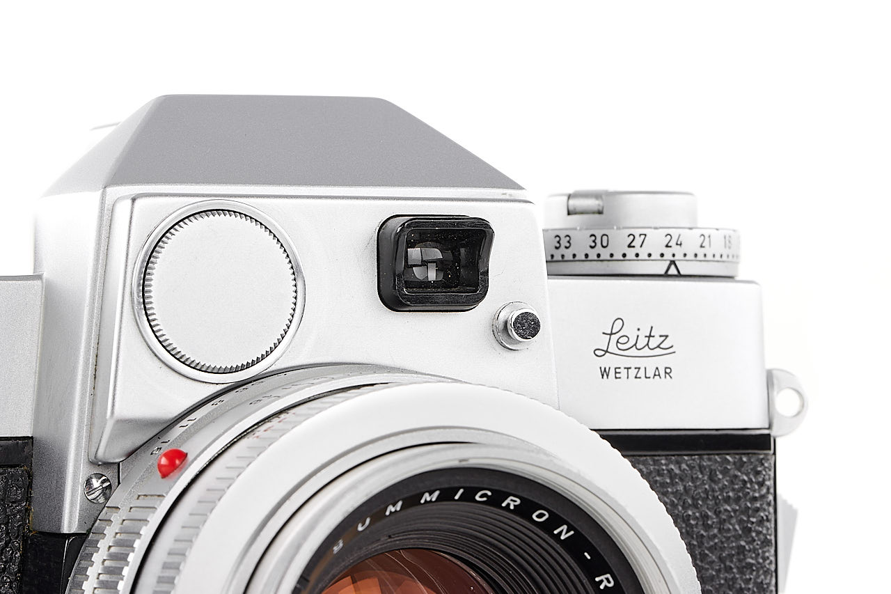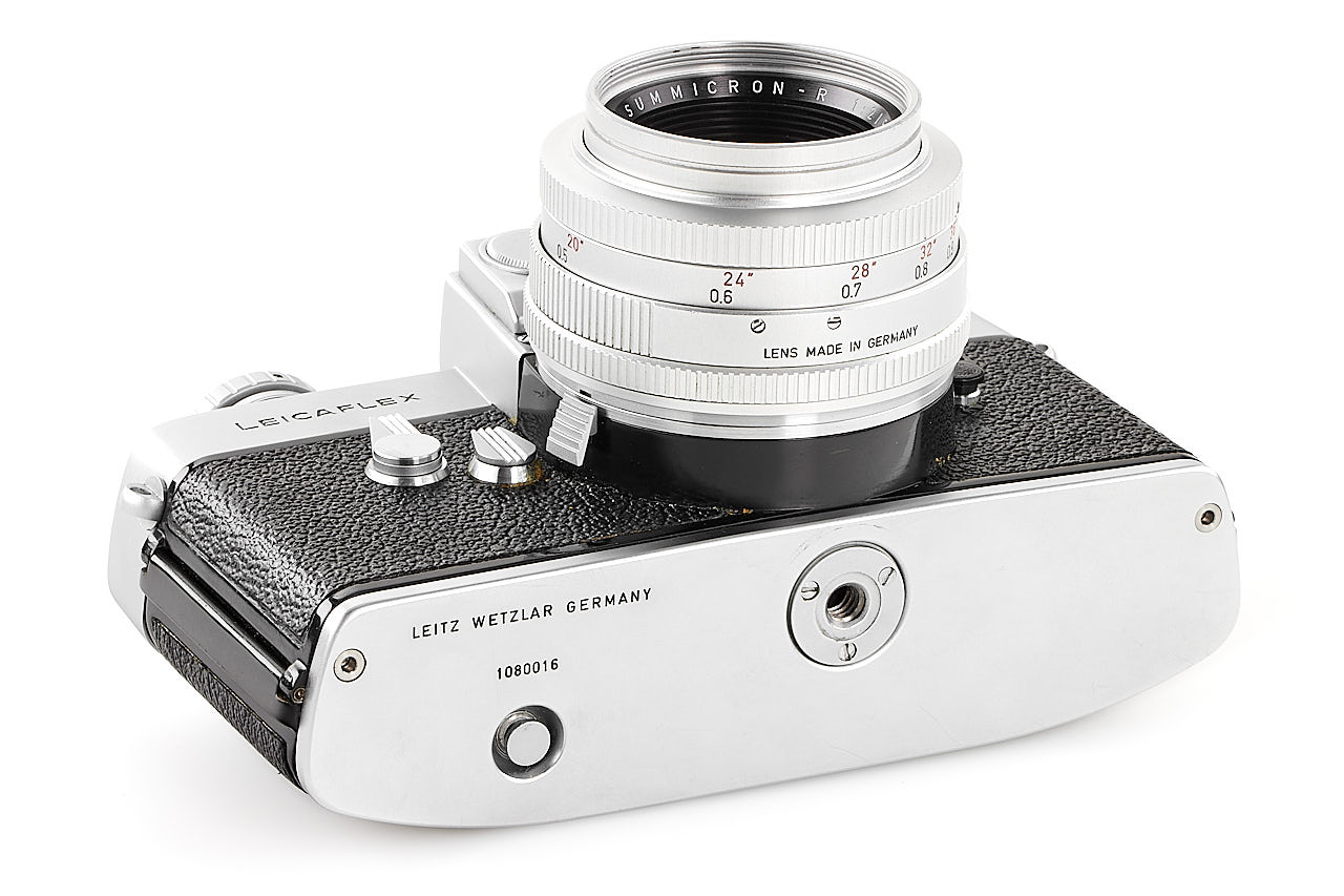 Very rare preseries Leicaflex, with early features like the pie-shaped frame counter, early type tripod socket, and also note the very unusual back opening system, with matching early Summicron-R 2/50mm chrome no.1999071 with black metal hood 12564, only a few of these cameras were made for evaluation before the production commenced, both in absolute mint condition.