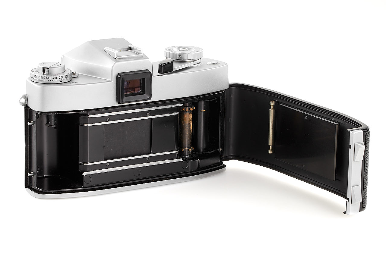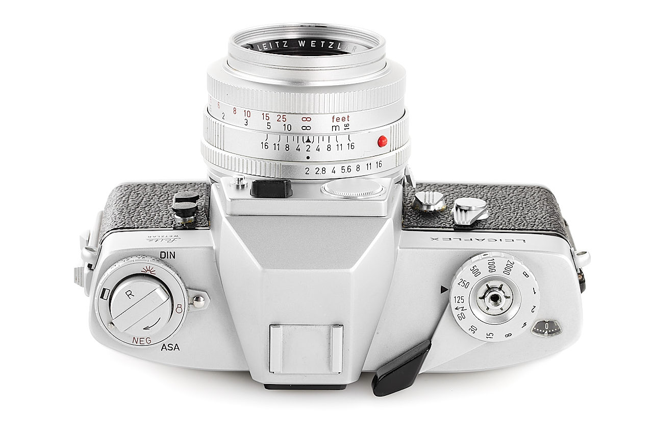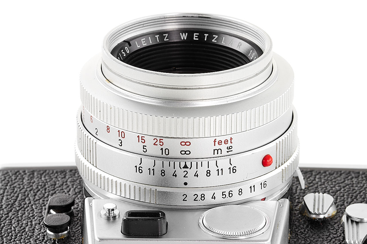 Very rare preseries Leicaflex, with early features like the pie-shaped frame counter, early type tripod socket, and also note the very unusual back opening system, with matching early Summicron-R 2/50mm chrome no.1999071 with black metal hood 12564, only a few of these cameras were made for evaluation before the production commenced, both in absolute mint condition.