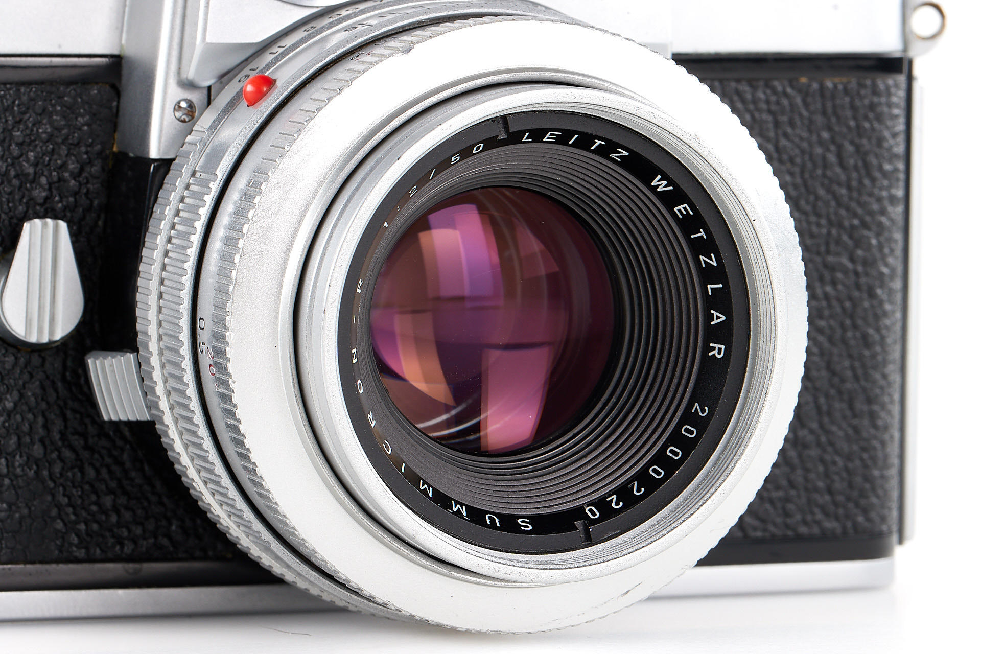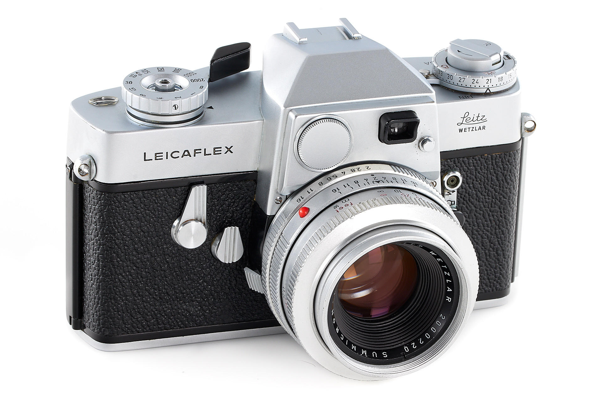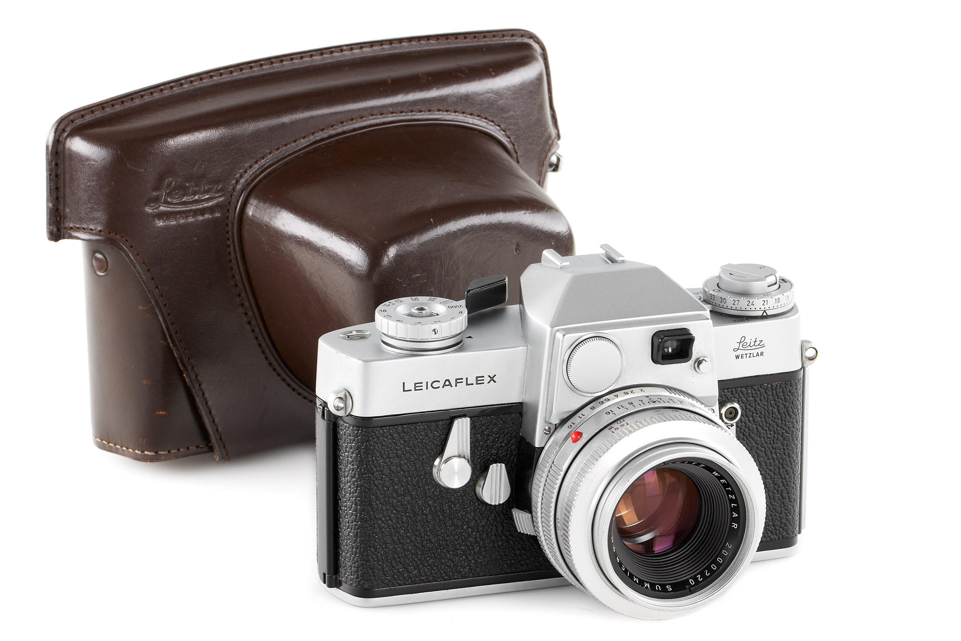 a very early first version Leicaflex (production started with serial number 1080001), in excellent cosmetic condition and good working order, with matching, rare chrome Summicron 2/50mm no.2000220 (250 units produced), 12564K hood and early leather case