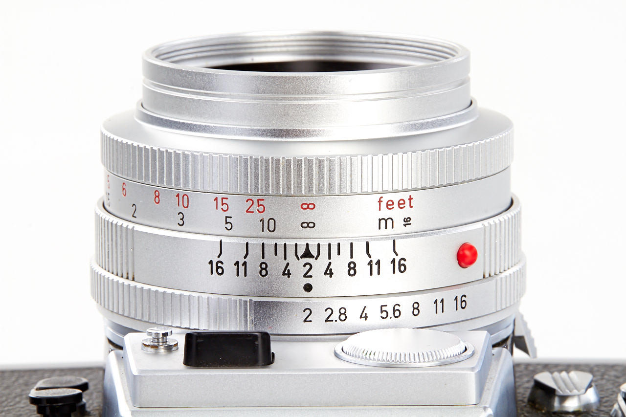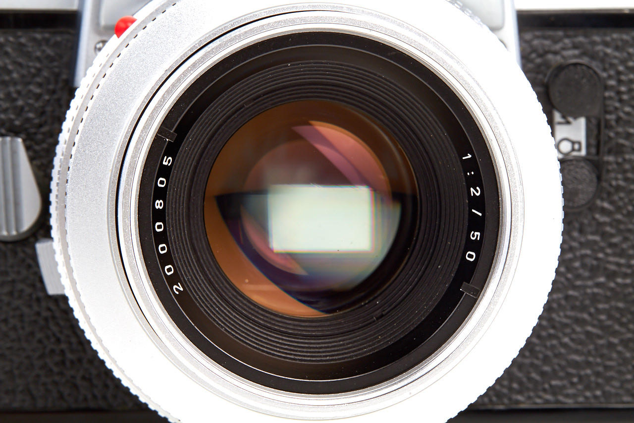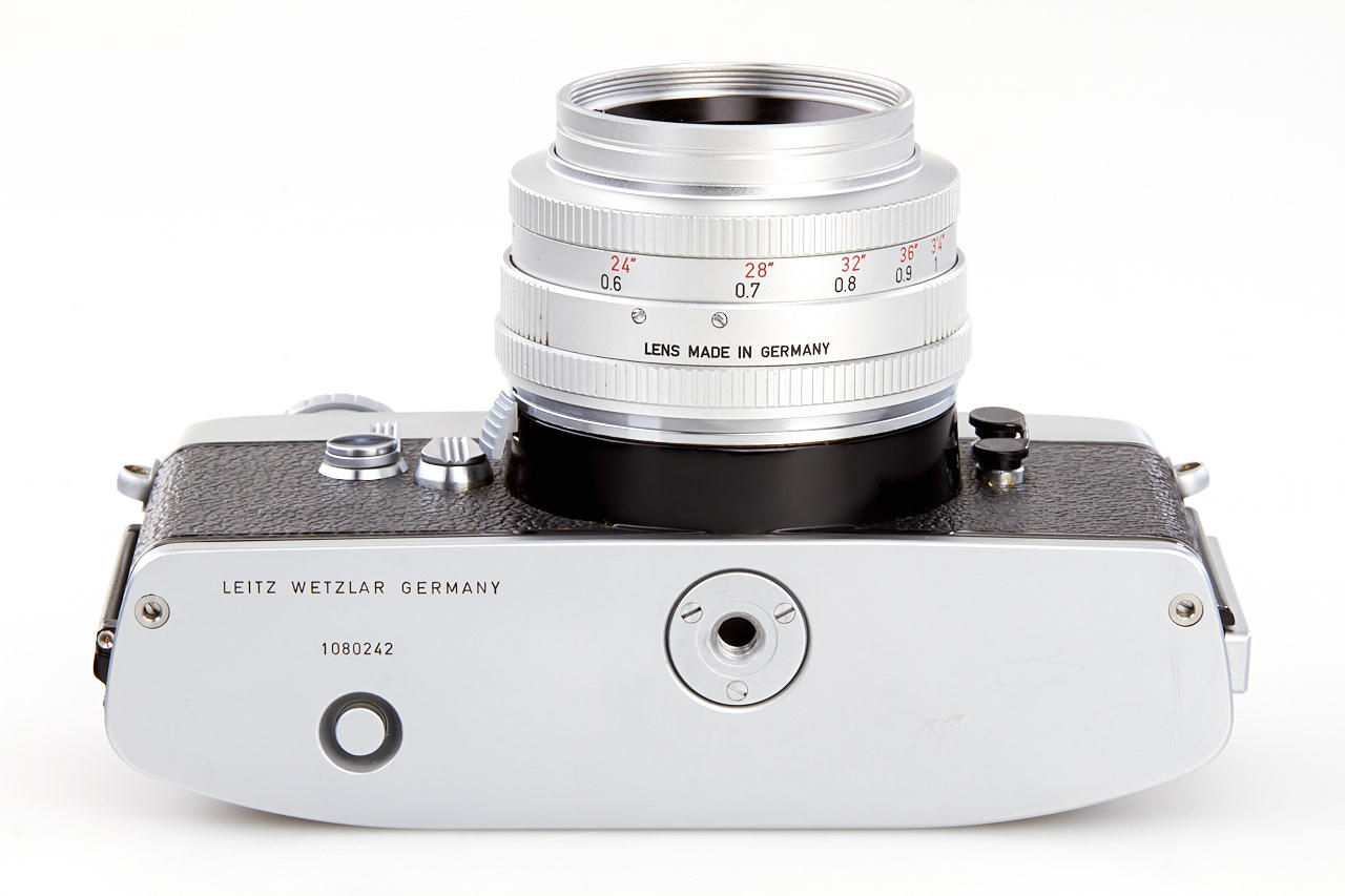preseries body without Leicaflex or Leitz Wetzlar engravings, with all early features like the pie-shaped frame counter and early type tripod socket, with matching chrome Summicron 2/50mm no.2000805 without Summicron engraving, and prototype unengraved hood, only few of these cameras were made for evaluation before the production cameras - see Lager I, page 266 for a similar camera, with matching preseries Summicron no.2000804! A historically important camera in beautiful condition