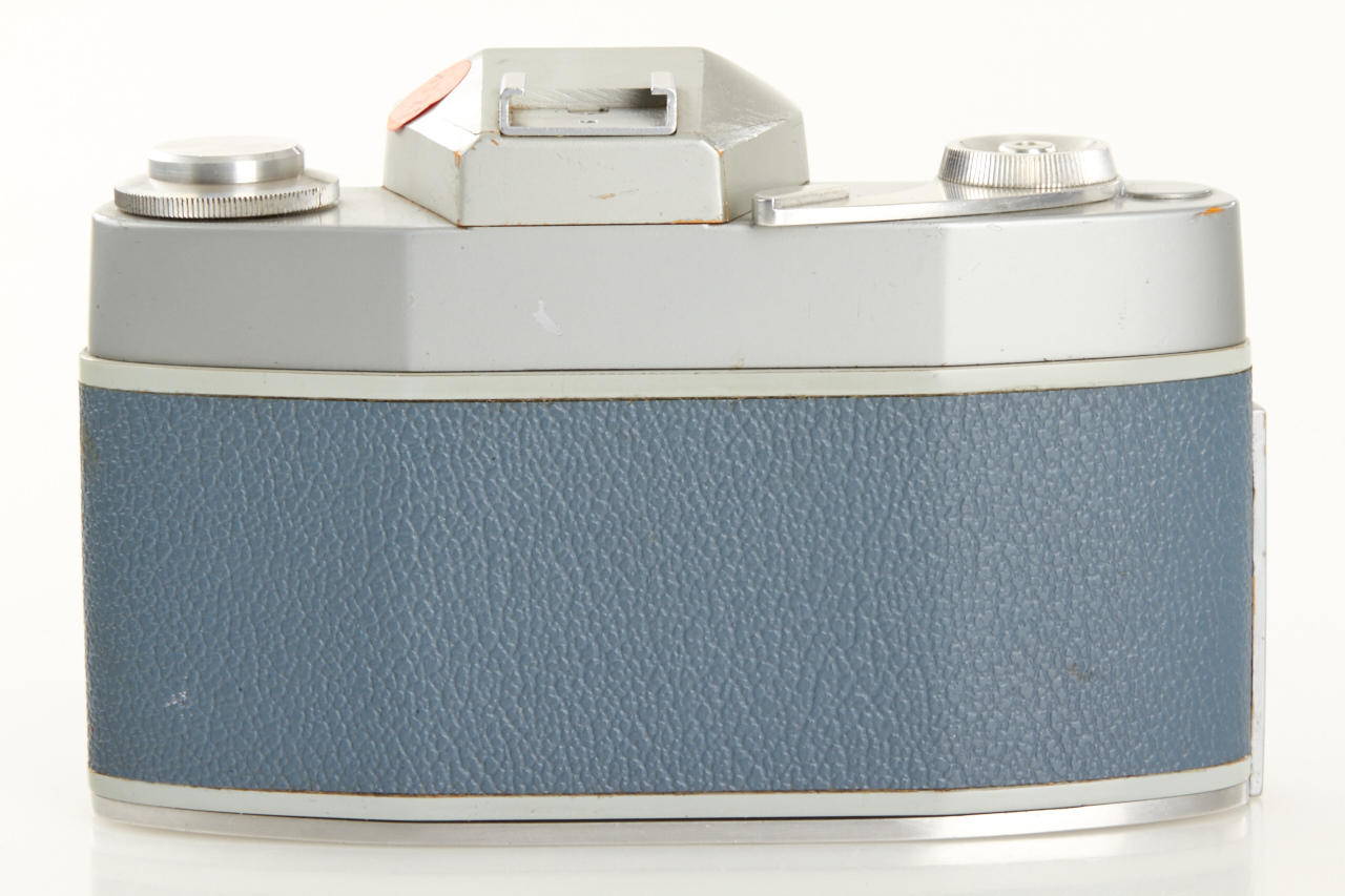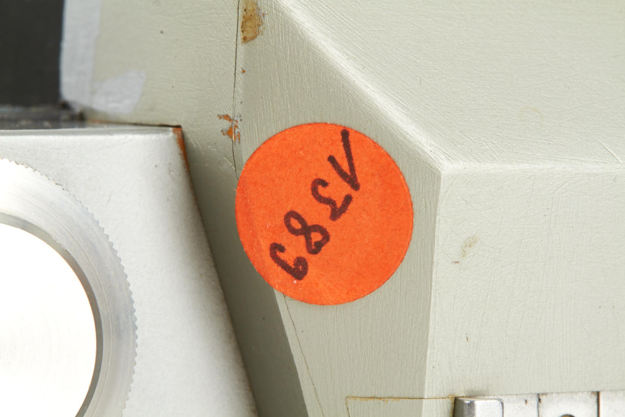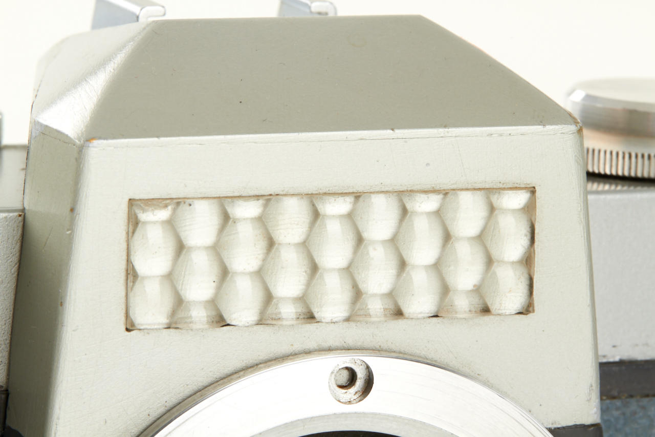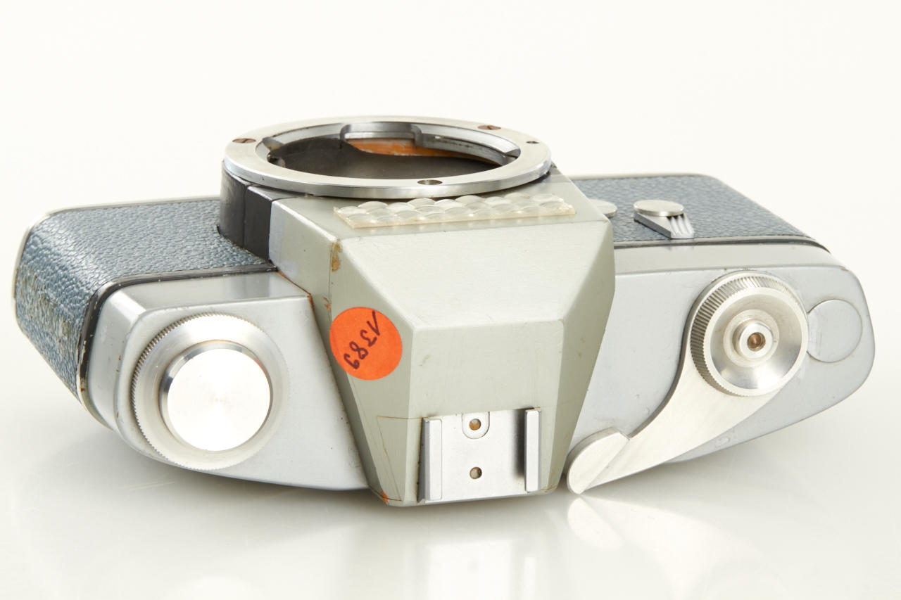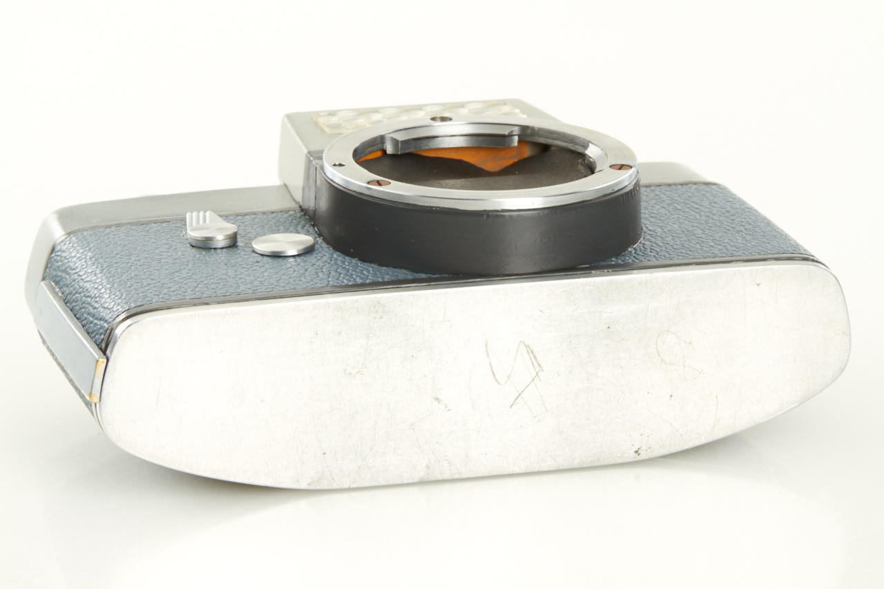 Leicaflex dummy with selenium cell exposure meter made from aluminium and wood with blue/grey leather covering, ex Leitz museum (with red inventory sticker '1389')