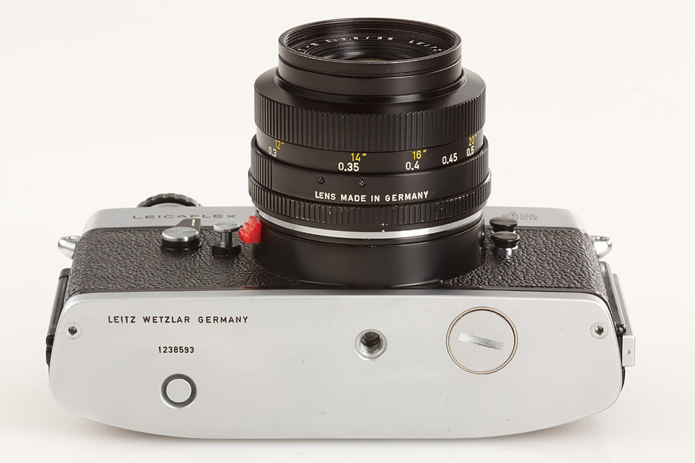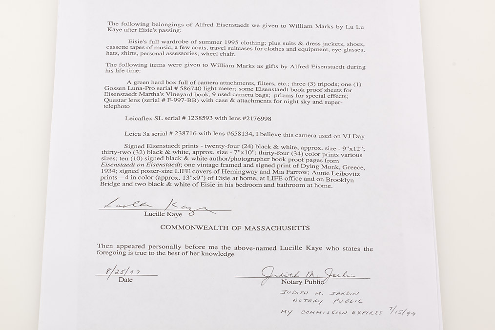 camera owned and used by Alfred Eisenstaedt, Elmarit 2.8/35mm no.2176998 (hood, cap, strap), with legal notarized transfer document that this camera belonging to Alfred Eisenstaedt was given 1997 to William Marks, the present owner, by Lu Lu Kaye Eisenstaedt's sister-in-law.