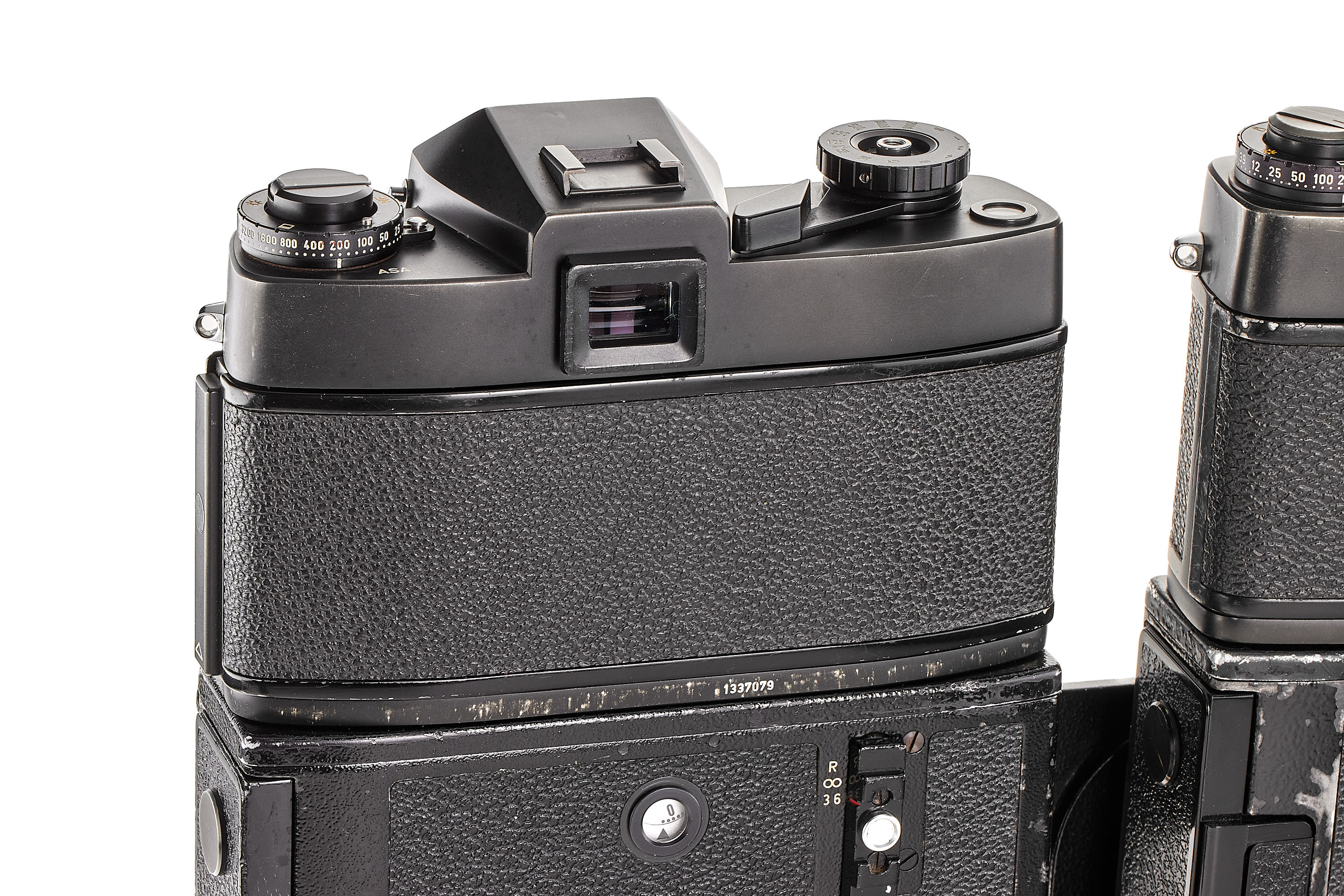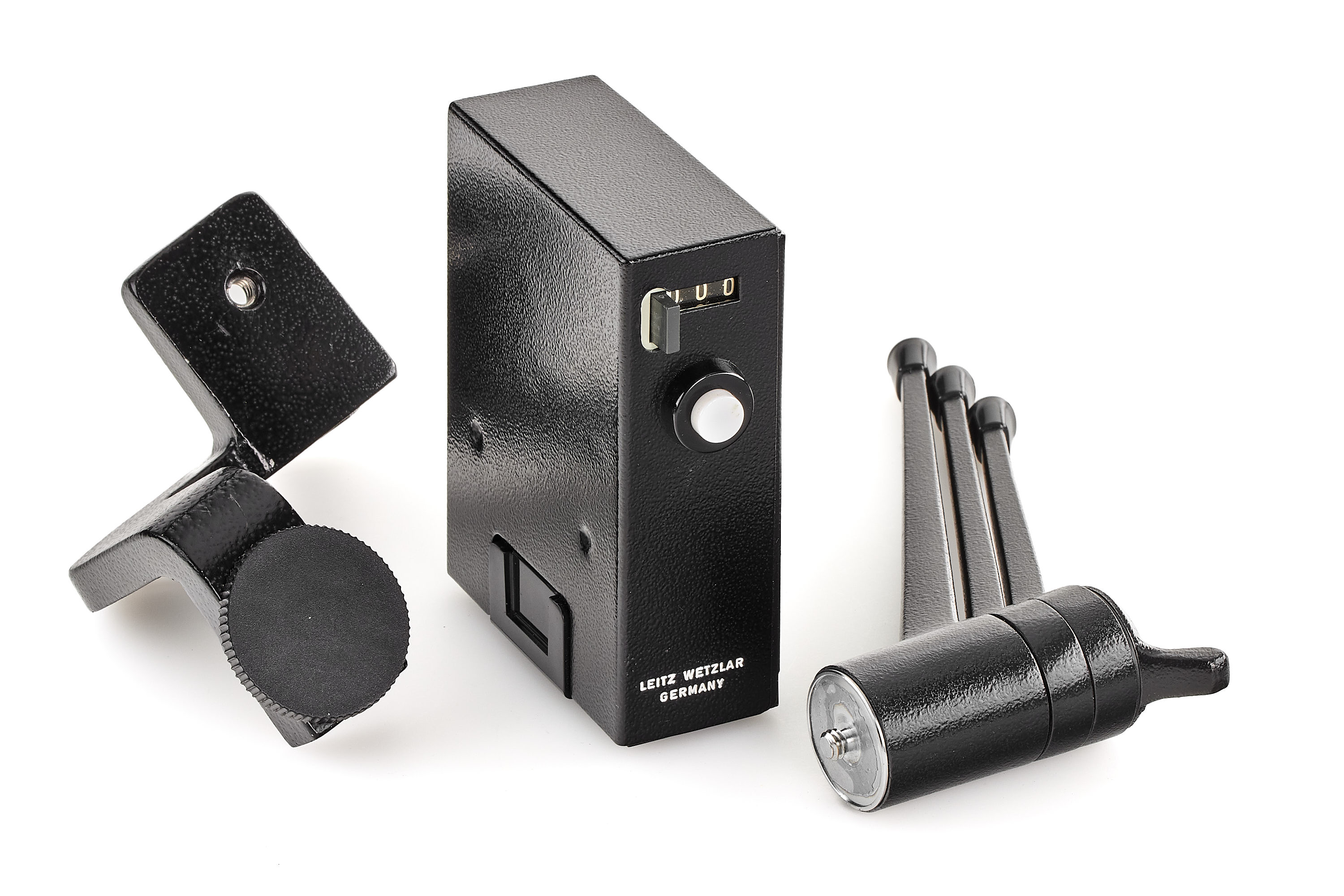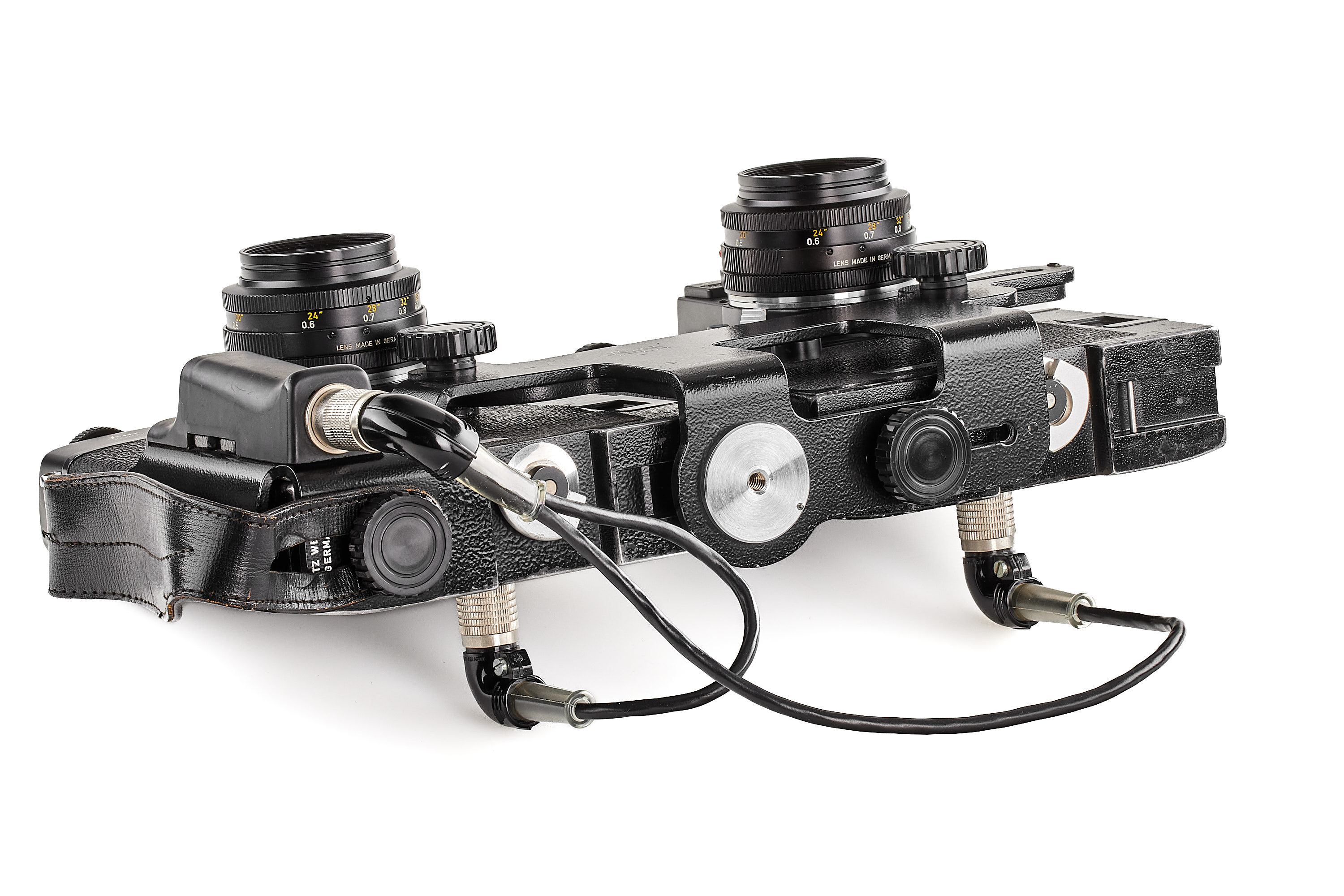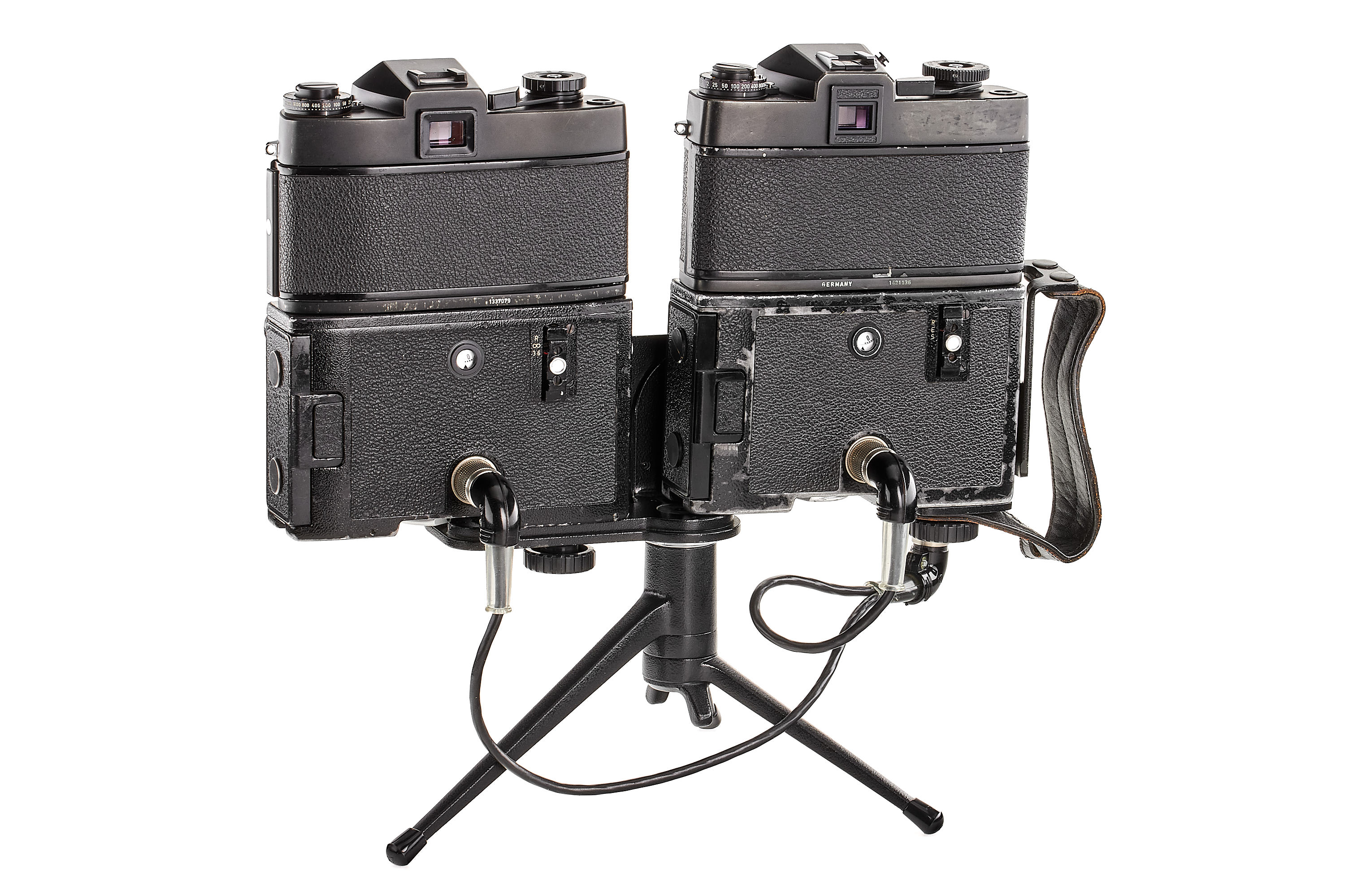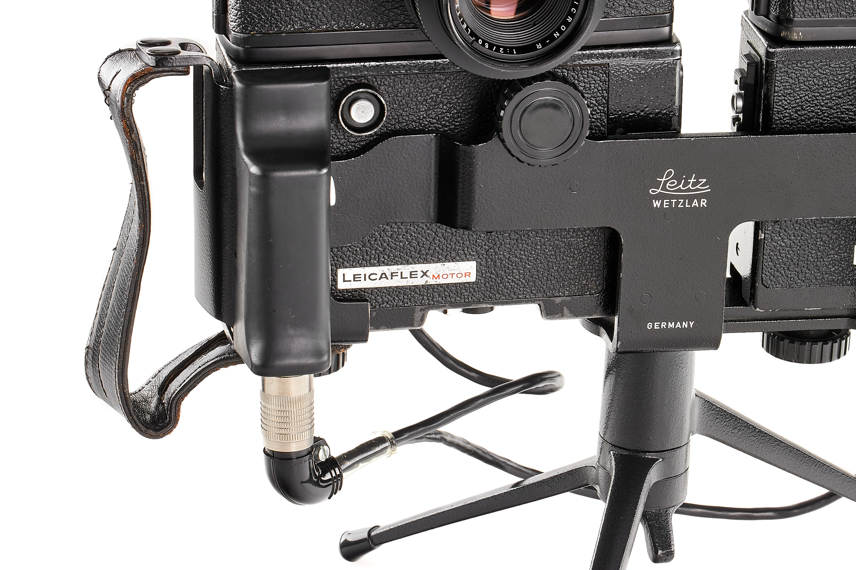 Rare Tandem device 14185 including grip with double cable, Leicaflex motors nos.2316 + 3998 in B+ condition, not tested, tripod holder 14148, TOOUG table tripod, 2x battery holder 14147, frame counter 14177 (with battery holder), Leicaflex SL MOT no.1337079 with Summicron-R 2/50mm 1-cam no.2192343 + Leicaflex SL2 MOT no.1421136 with Summicron-R 2/50mm 2-cam no.2359311, in very good condition and working order, the Tandem device was intended to reach 7-8 fps or to double an action with 2 different focal lengths for example.