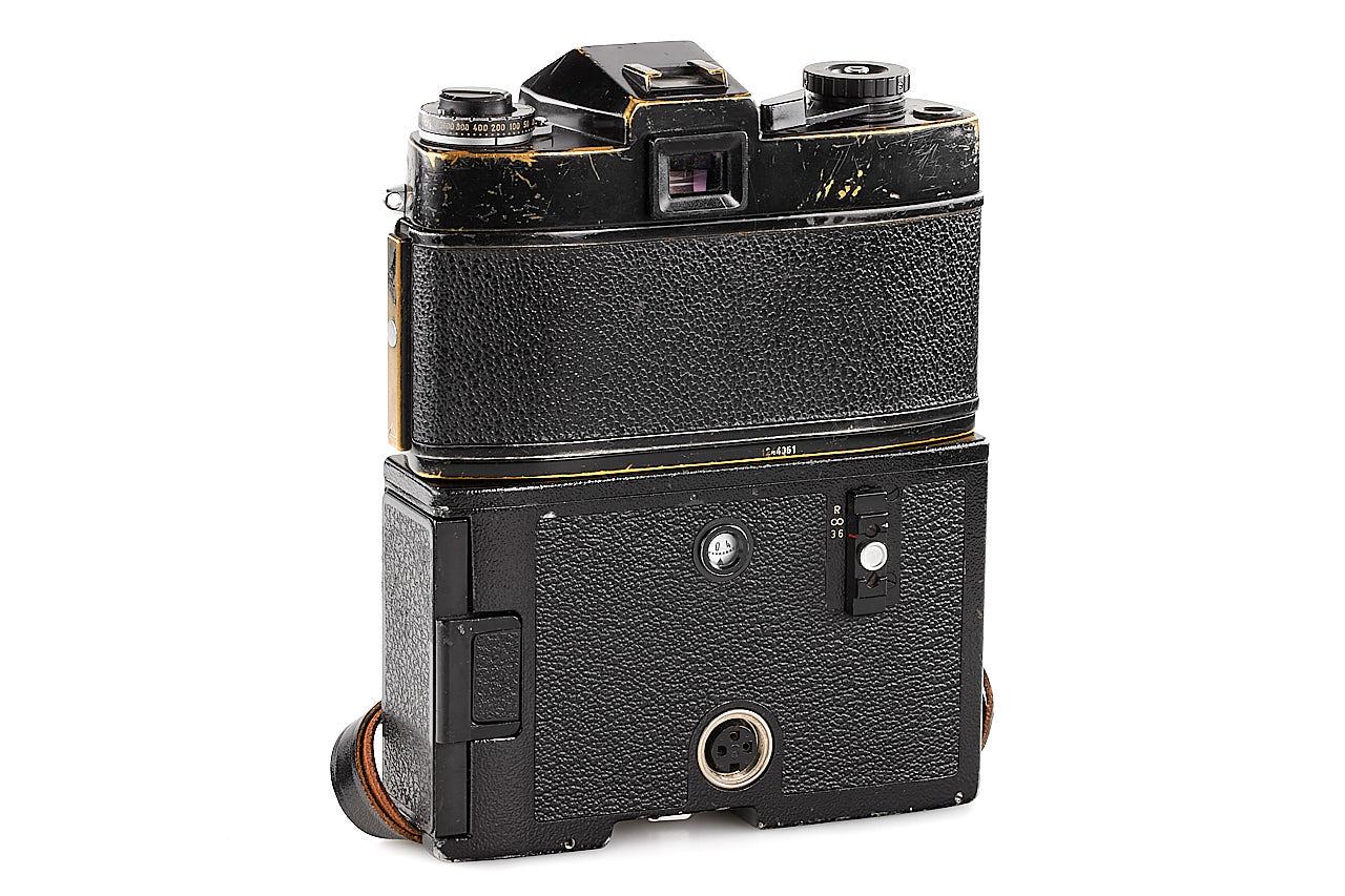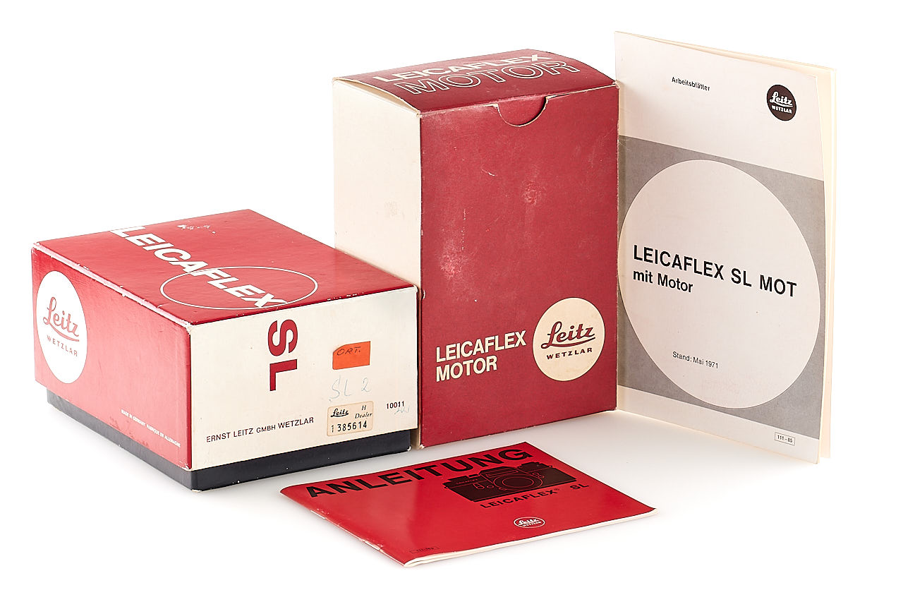 Very rare motorized version of the Leicaflex SL, black paint body in good condition, with Leicaflex Motor no.1451 (not tested), body cap, instructions, and both maker's box.