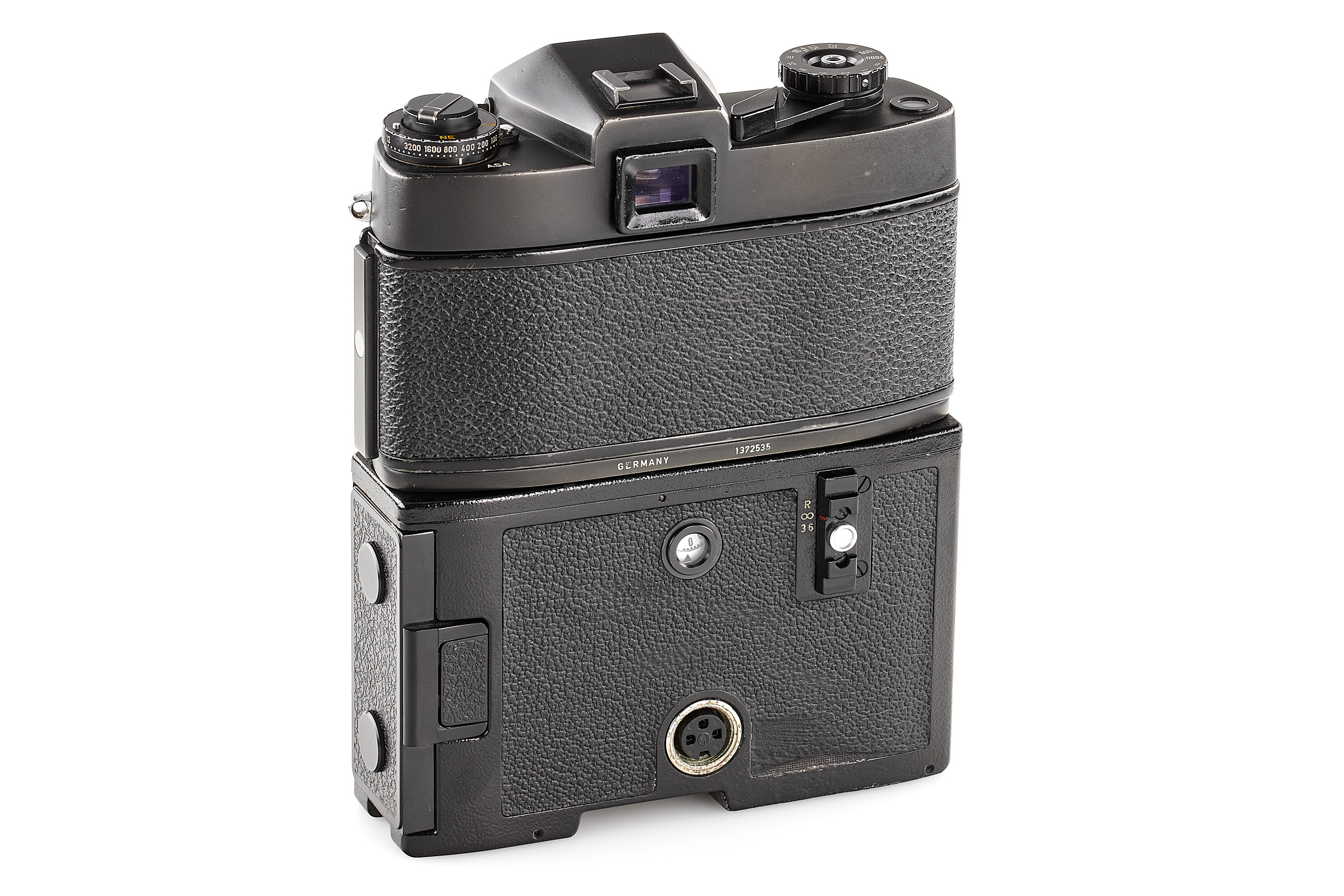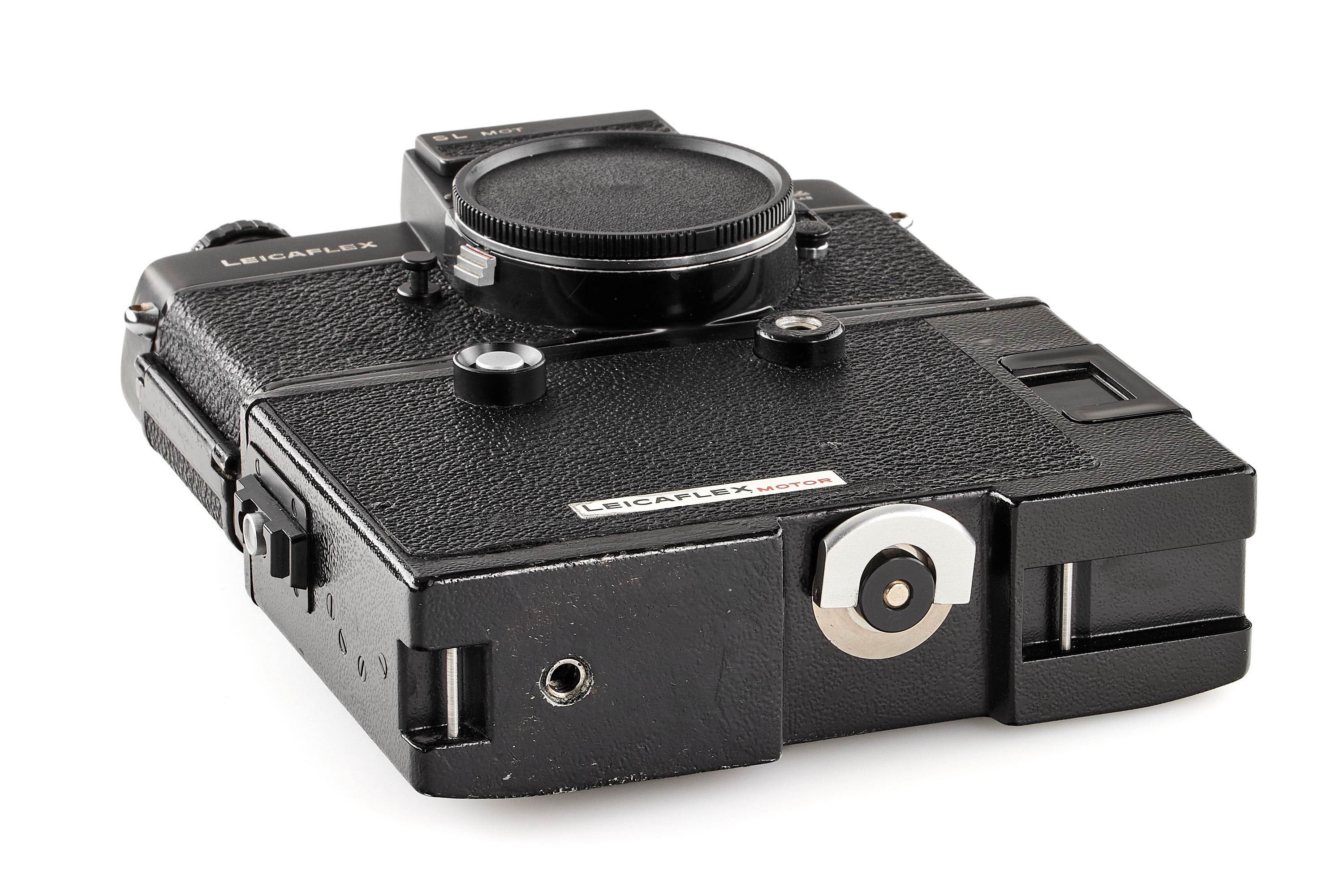 Late rare black body from the last batch of production (nos.1372441-1372630), in very good condition, the shutter needs service, delivered on 31.05.1974, unknown reference '6-134701' engraved on the bottom plate, with Leicaflex Motor no.1907 (in working order) and body cap.