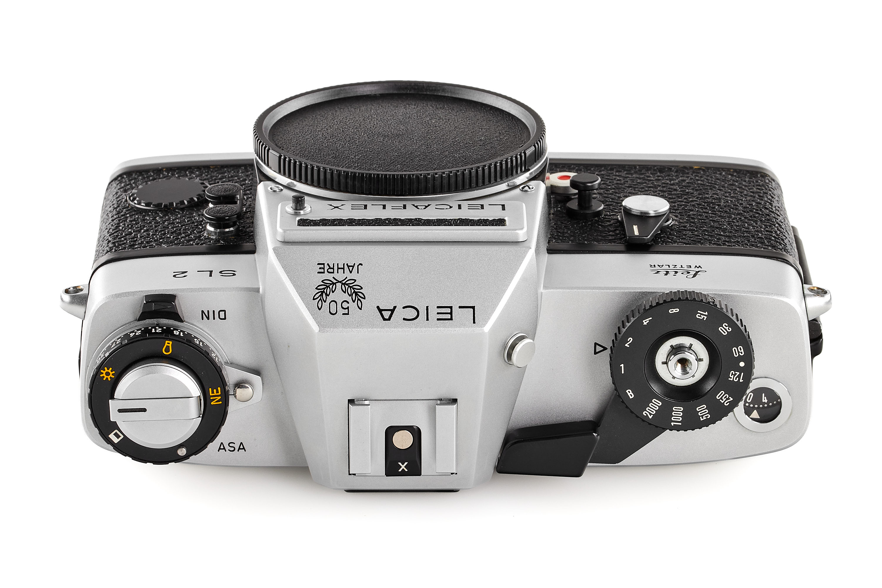 Rare limited edition Leicaflex SL2 chrome released to celebrate the 50th anniversary of the first Leica, 1750 units produced, no.1392624 with special engraving '50 Jahre' and '047-I', in mint condition and working order, with body cap and bottom plate protection.