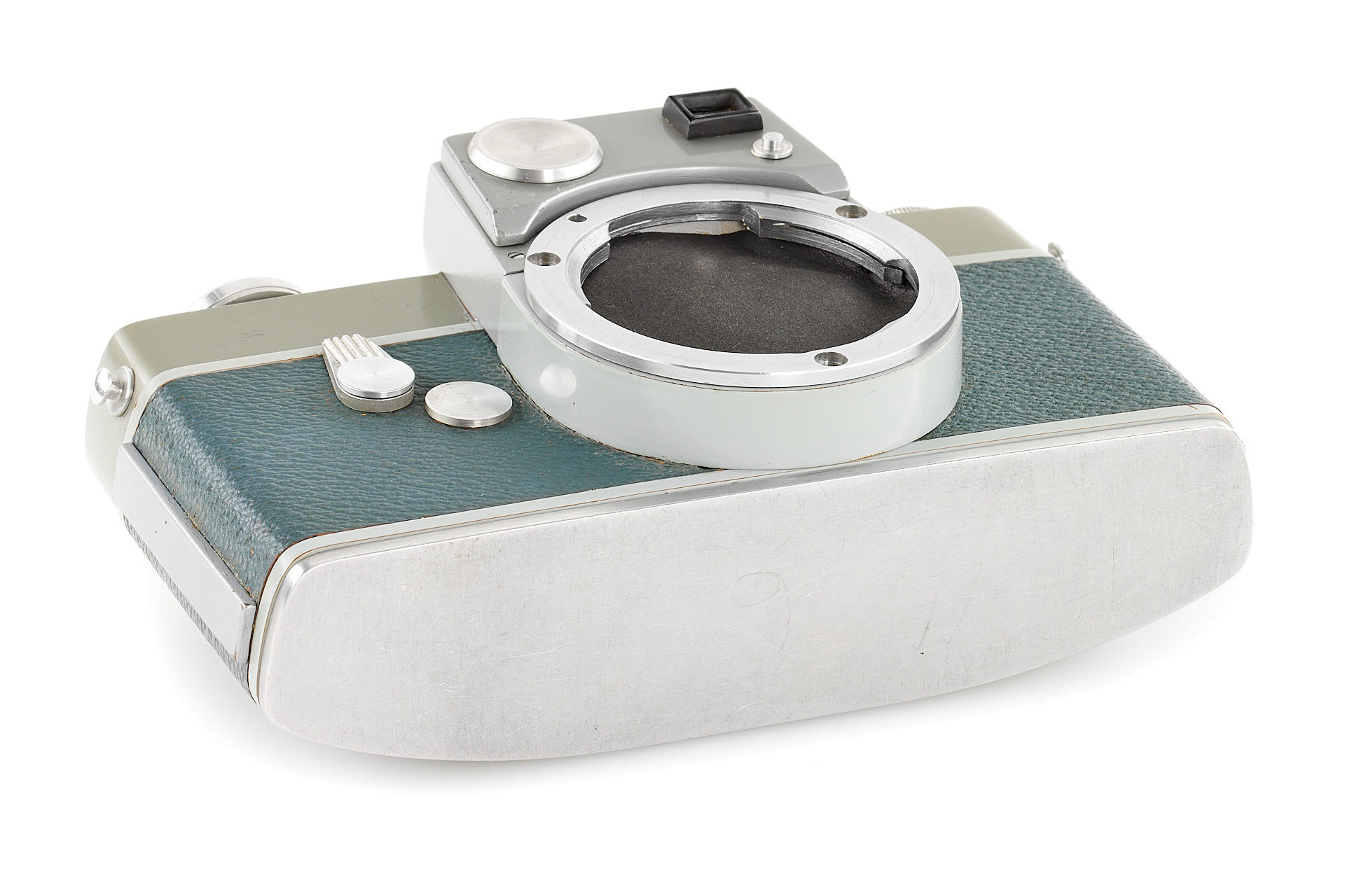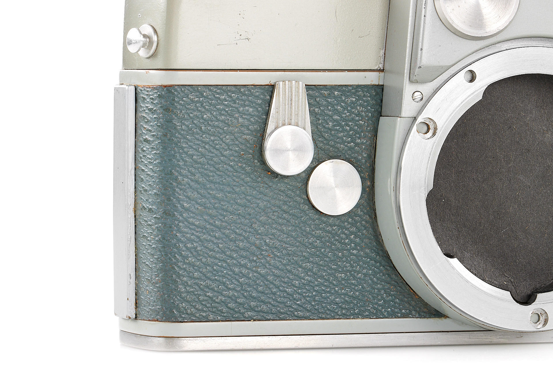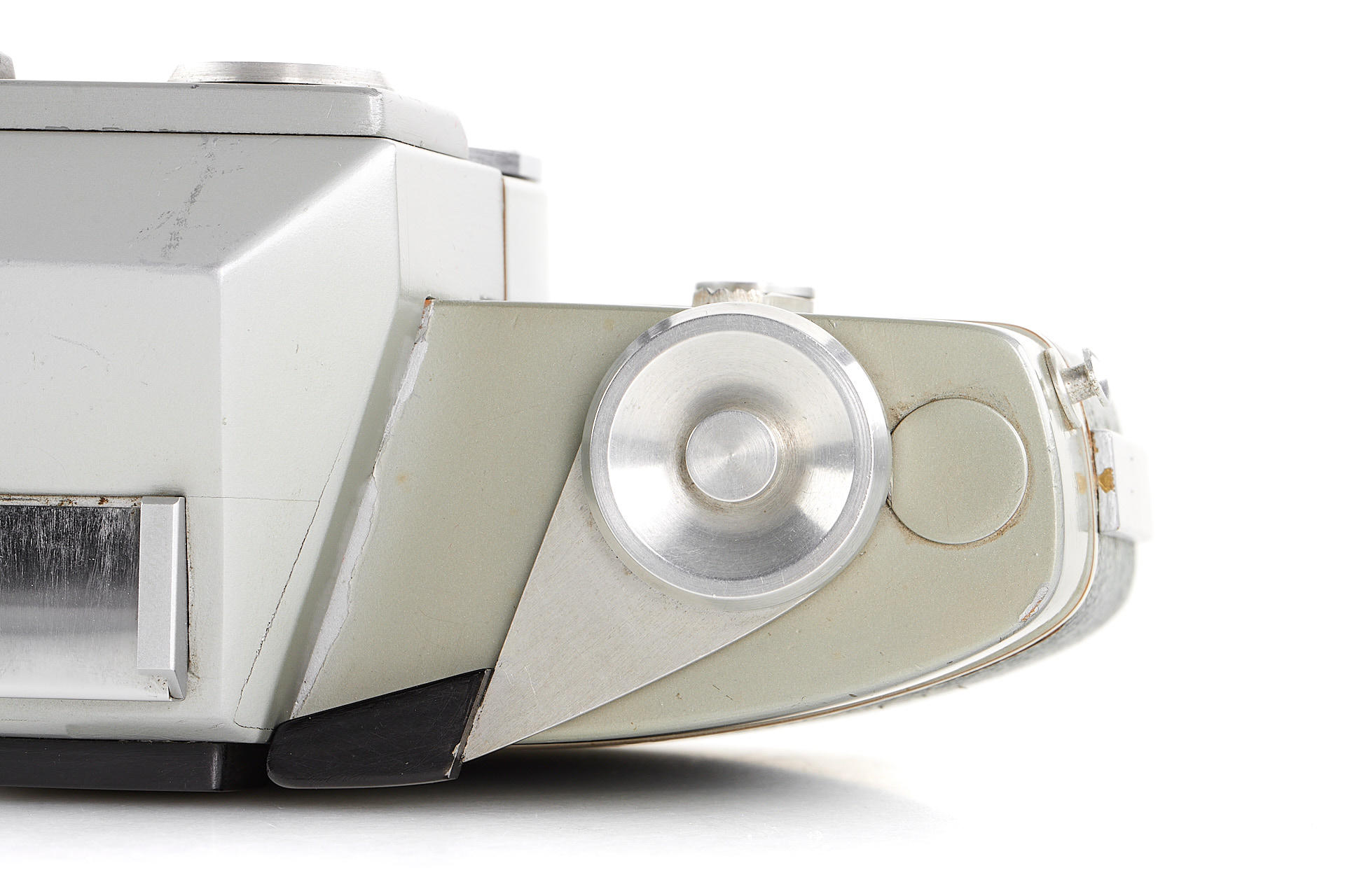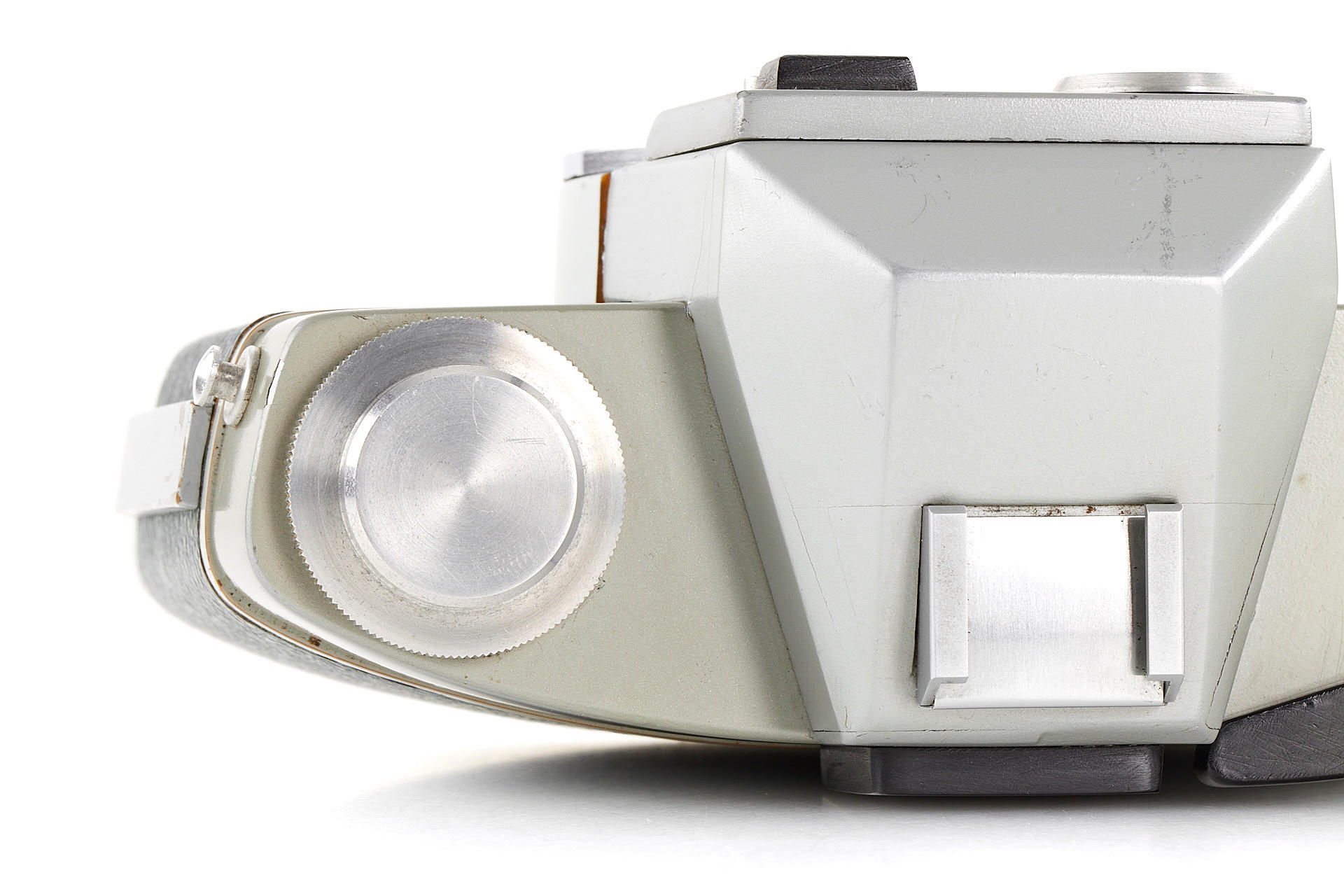 A very interesting, late prototype dummy of the Leicaflex. The body already has got the final shape of the production camera, but it is c.2mm smaller in every dimension and shows several distinctive differences, like the special grey covering, special strap lugs, different shapes of controls etc. The camera was a part of the inventory of the Leitz Museum.