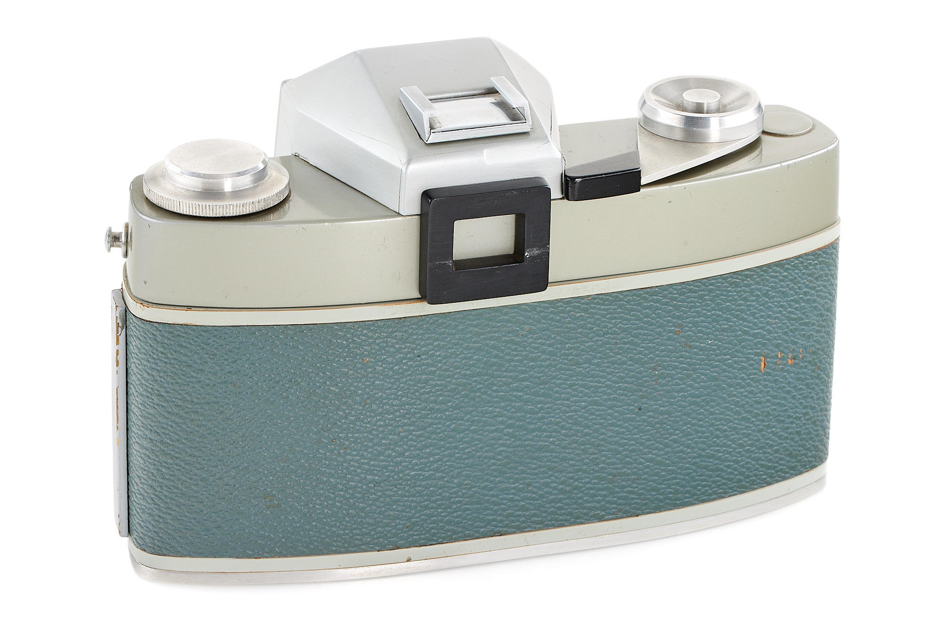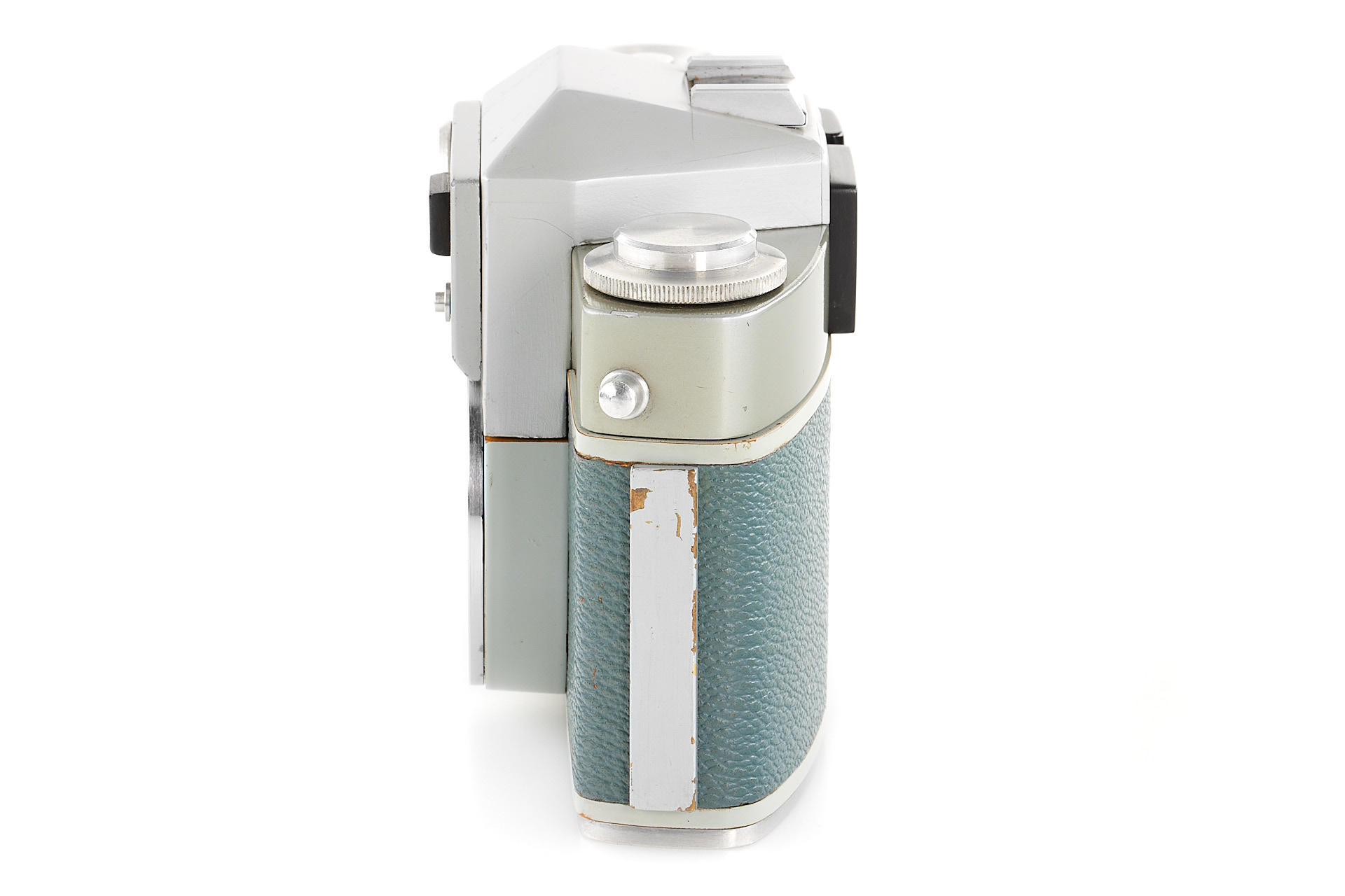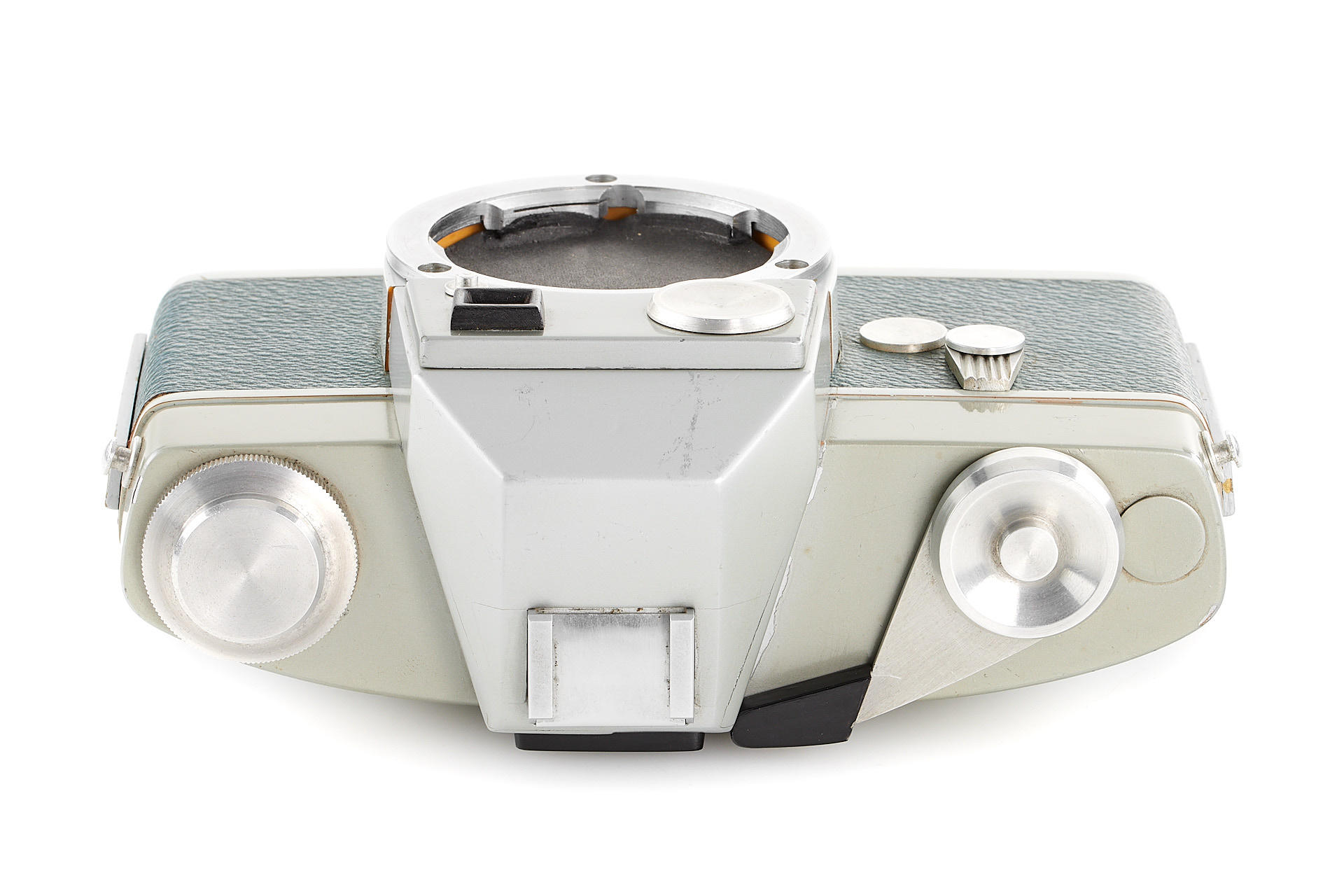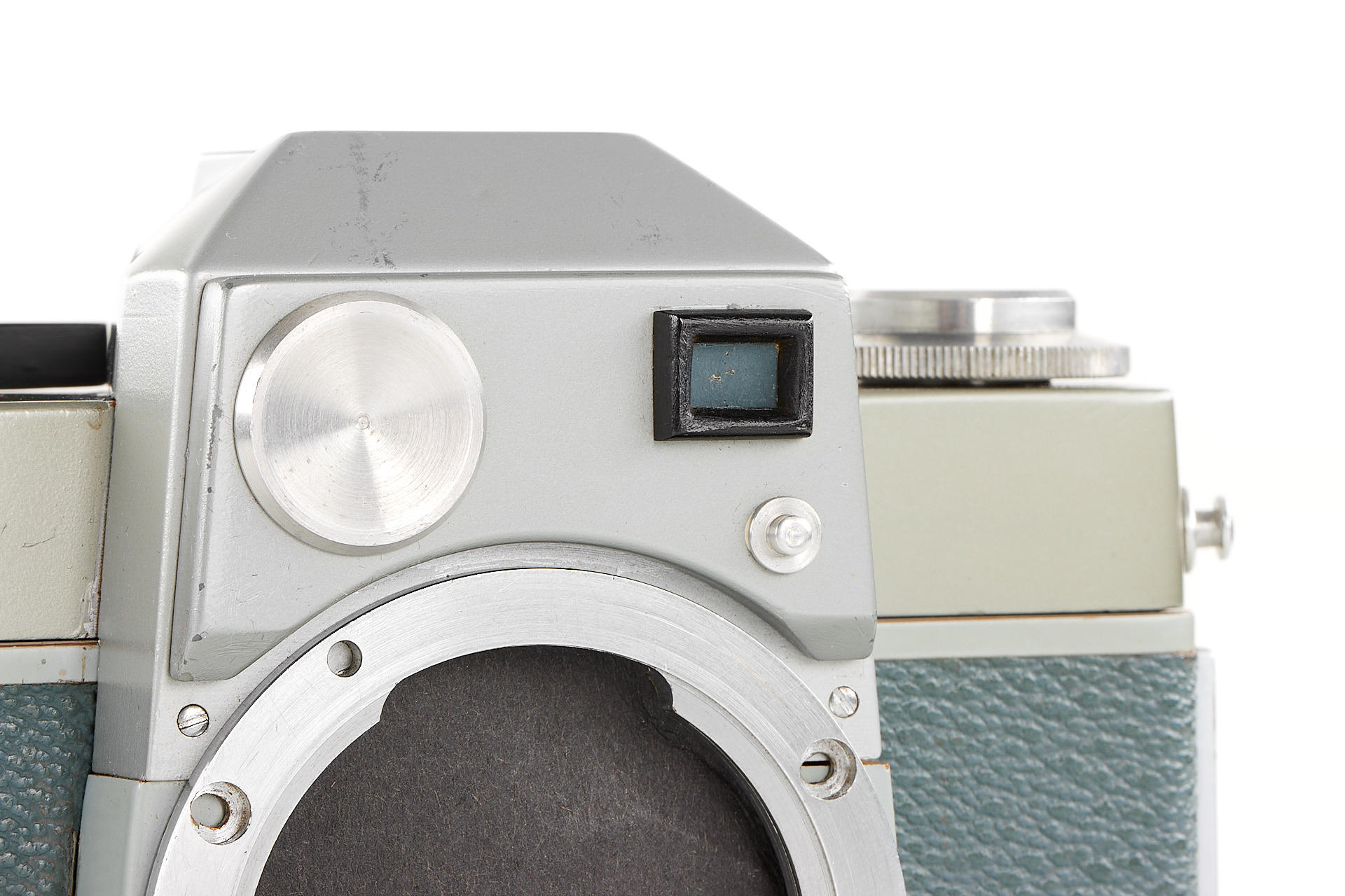 A very interesting, late prototype dummy of the Leicaflex. The body already has got the final shape of the production camera, but it is c.2mm smaller in every dimension and shows several distinctive differences, like the special grey covering, special strap lugs, different shapes of controls etc. The camera was a part of the inventory of the Leitz Museum.