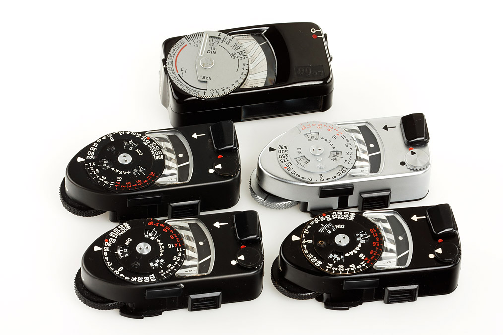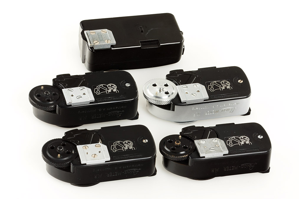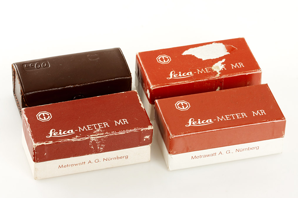 (1) Metrawatt LC60 with case, (2) Leicameter MR-4 chrome no.80626, (3) Leicameter MR-4 black paint no.37243 in maker's box, (4) Leicameter MR-4 black no.58629 in maker's box, (5) Leicameter MR-4 black no.69064 in maker's box - all in fine condition (5)