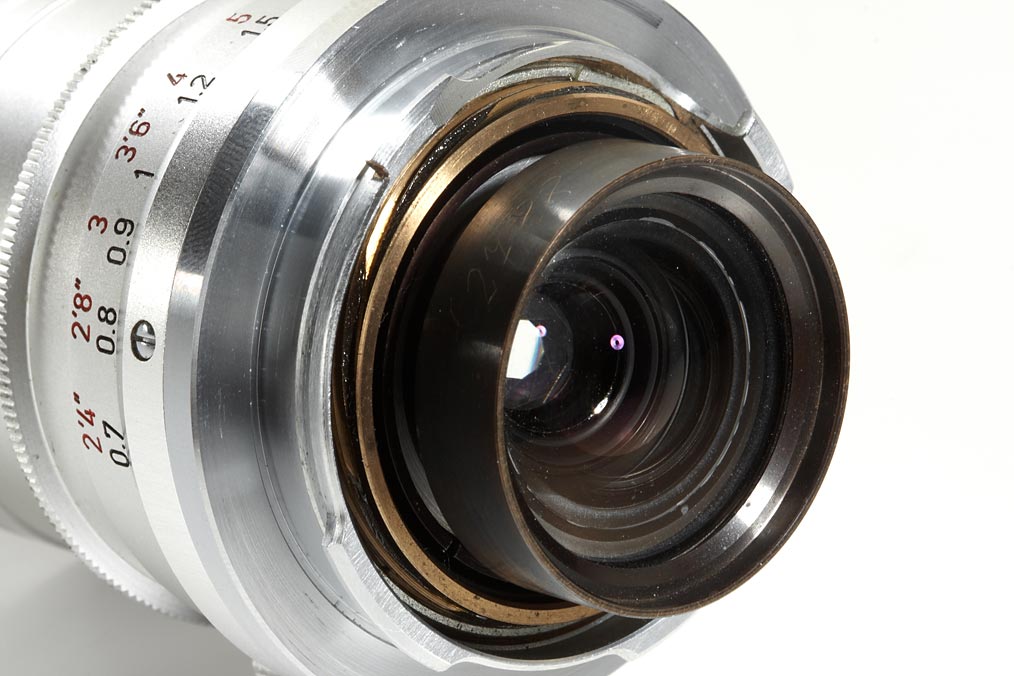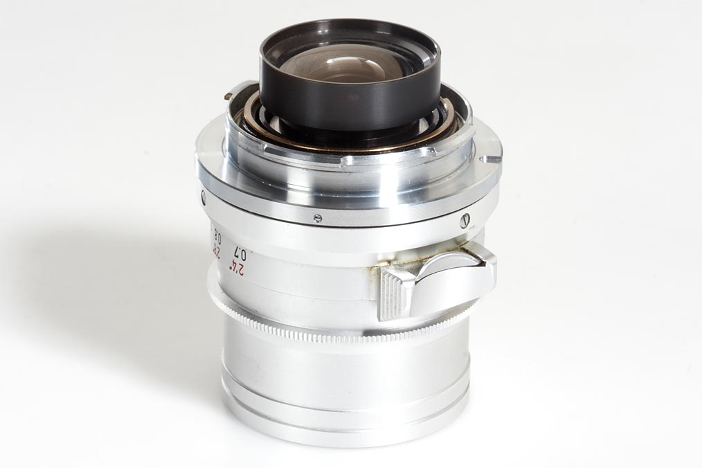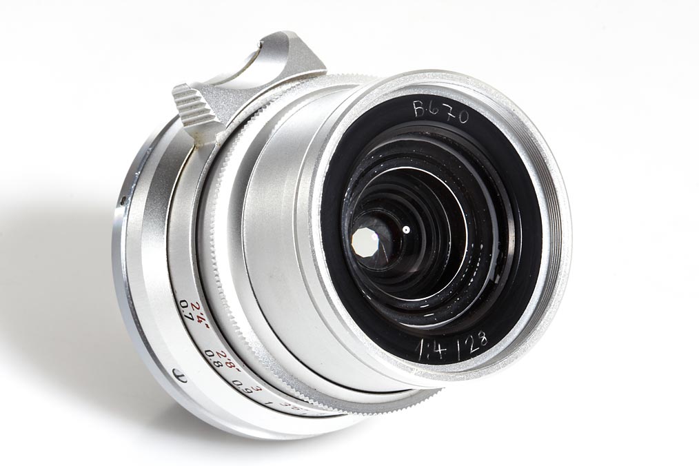 unique prototype 28mm lens in chrome M-mount with deep protruding rear elements, hand-engraved number on front: B670 1:4/28, on the rear element hand-engraved: f 27,88, this lens is illustrated in Lager Vol.II p.233