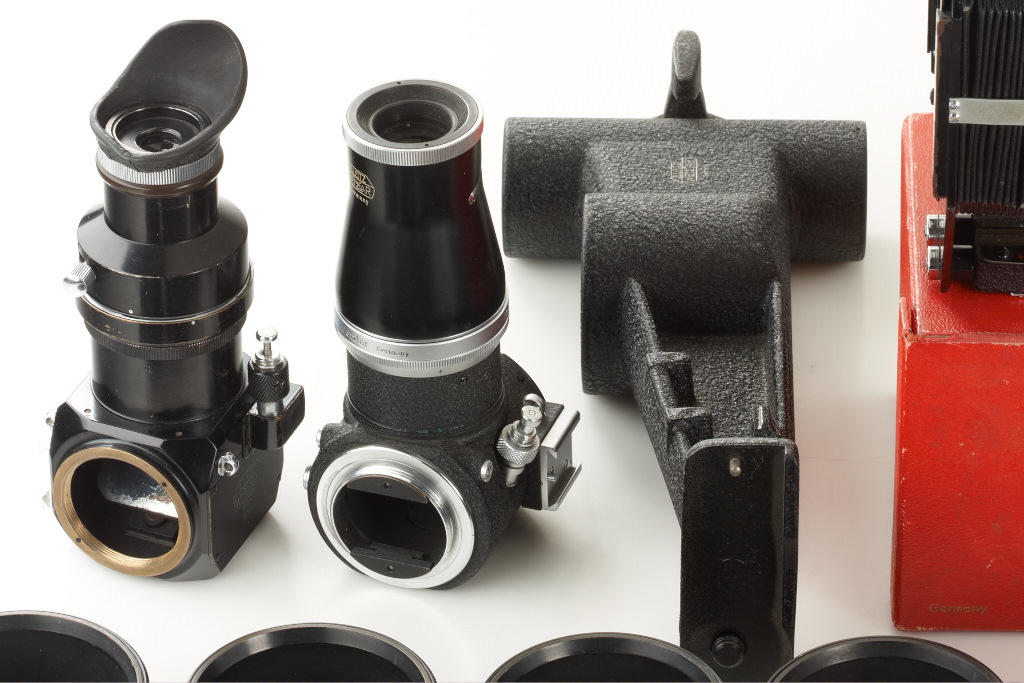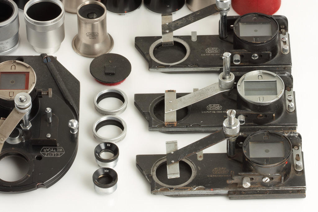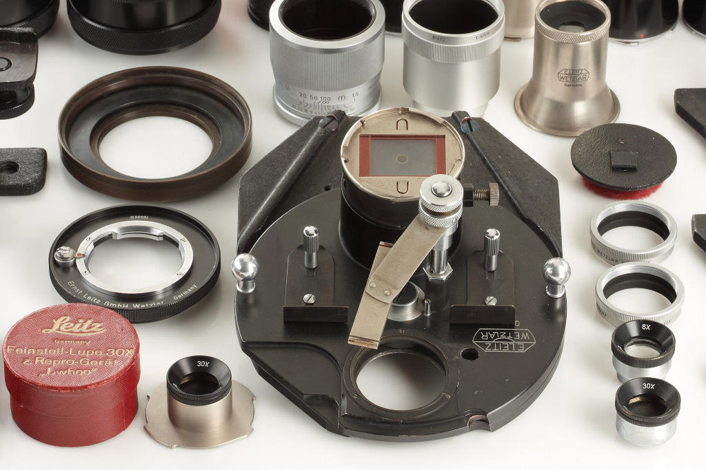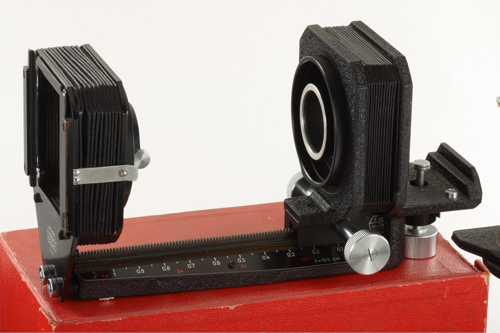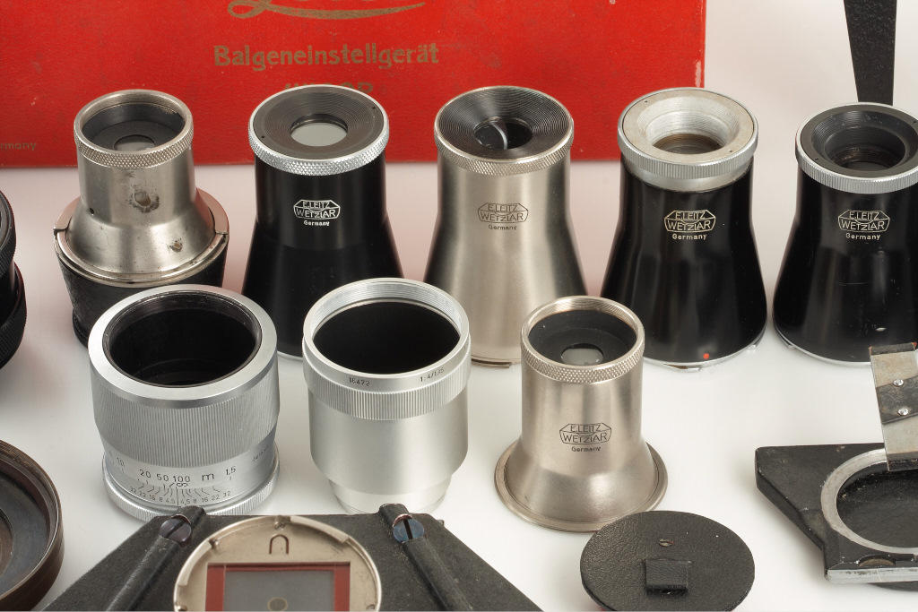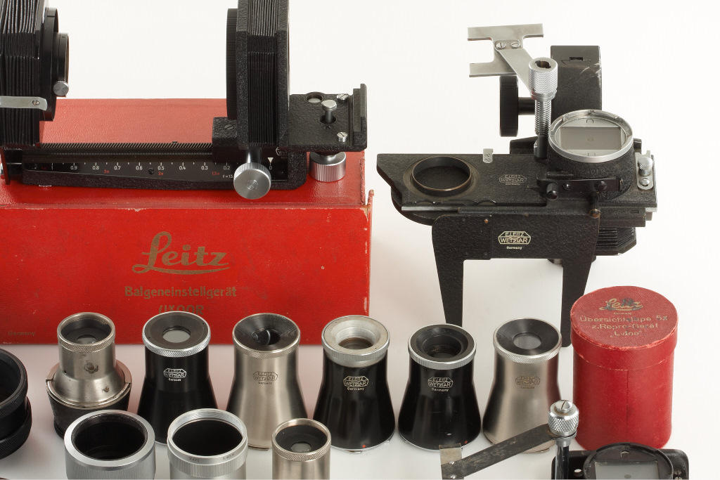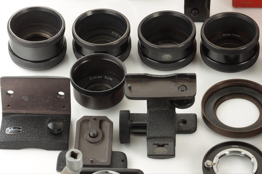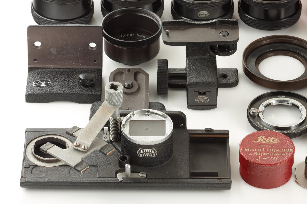 collection of Leitz reproduction devices and accessories in fine condition, Visoflex I, PLOOT, various LVFOO magnifiers, focusing stages, bellows I with maker's box, adapters, etc.