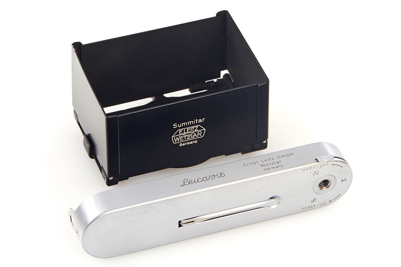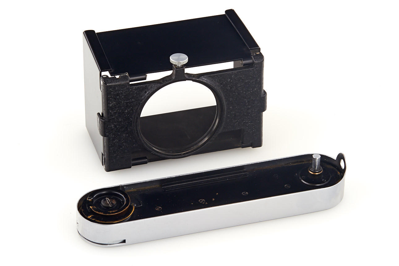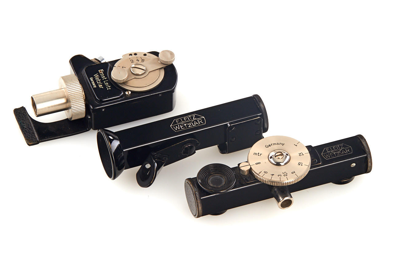 Leitz accessories: (1) Leicavit SYOOM (cond. B+), (2) HEBOO release (cond. B/A, maker's box), (3) WINTU angle finder (cond. A/B, early maker's box), (4) FOKOS rangefinder (cond. B+, leather circles glued on both ends, maker's box), (5) SOOPD collapsible hood (cond. A/B)