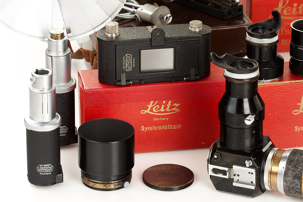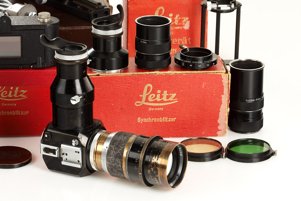 PLOOT reflex housing no.3357 with Telyt 4.5/20cm no.1072123 (with 2 filters, cap, hood, double cable release, POOIM magnifier), BEHOO close-up attachment (with legs: BETAB, BEOOY, BEHOO), 2x BELUN close-up attachment (one maker's box), UXOOR bellows I no.5853 (with adapter ring UOOYW and tube UOOVH), 4 extension rings (1:1, 1:1.5, 1:2, 1:3), ELDIA printing apparatus, 2x CEYOO Synchronblitzer (2 different lamps, one reflector, one with Vacu synchroniser (without dial), both maker's boxes) (10)