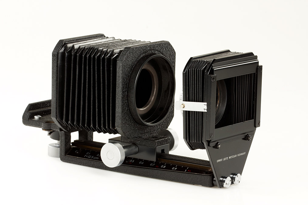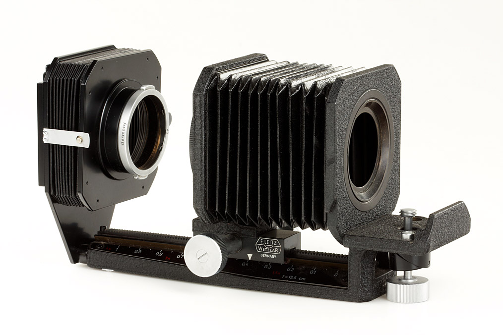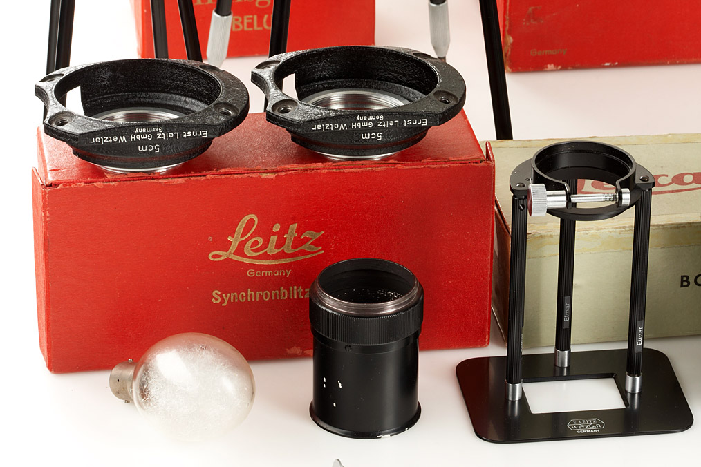 Visoflex I OZXOM (for M cameras) no.22185, LVFOO magnifier (maker's box), BEHOO close-up attachment (with BETAB legs), BELUN close-up attachment (maker's box), extension ring 1:1, UXOOR bellows I no.16608 (with adapter ring UOOYW and UZEOO bellows lens hood, maker's box), CEYOO Synchronblitzer (with cable, lamp, reflector, maker's box, double cable release), BOOWU close up attachment (maker's box) (8)