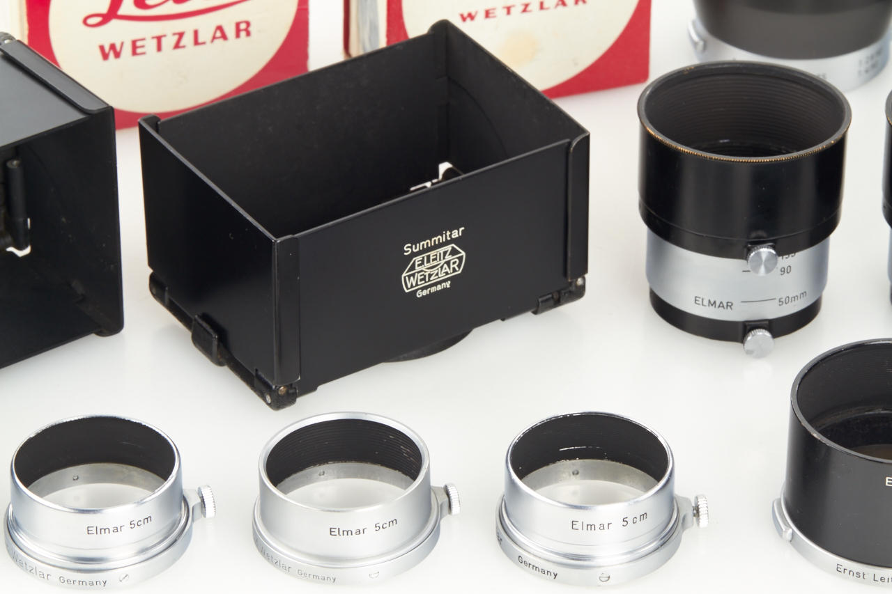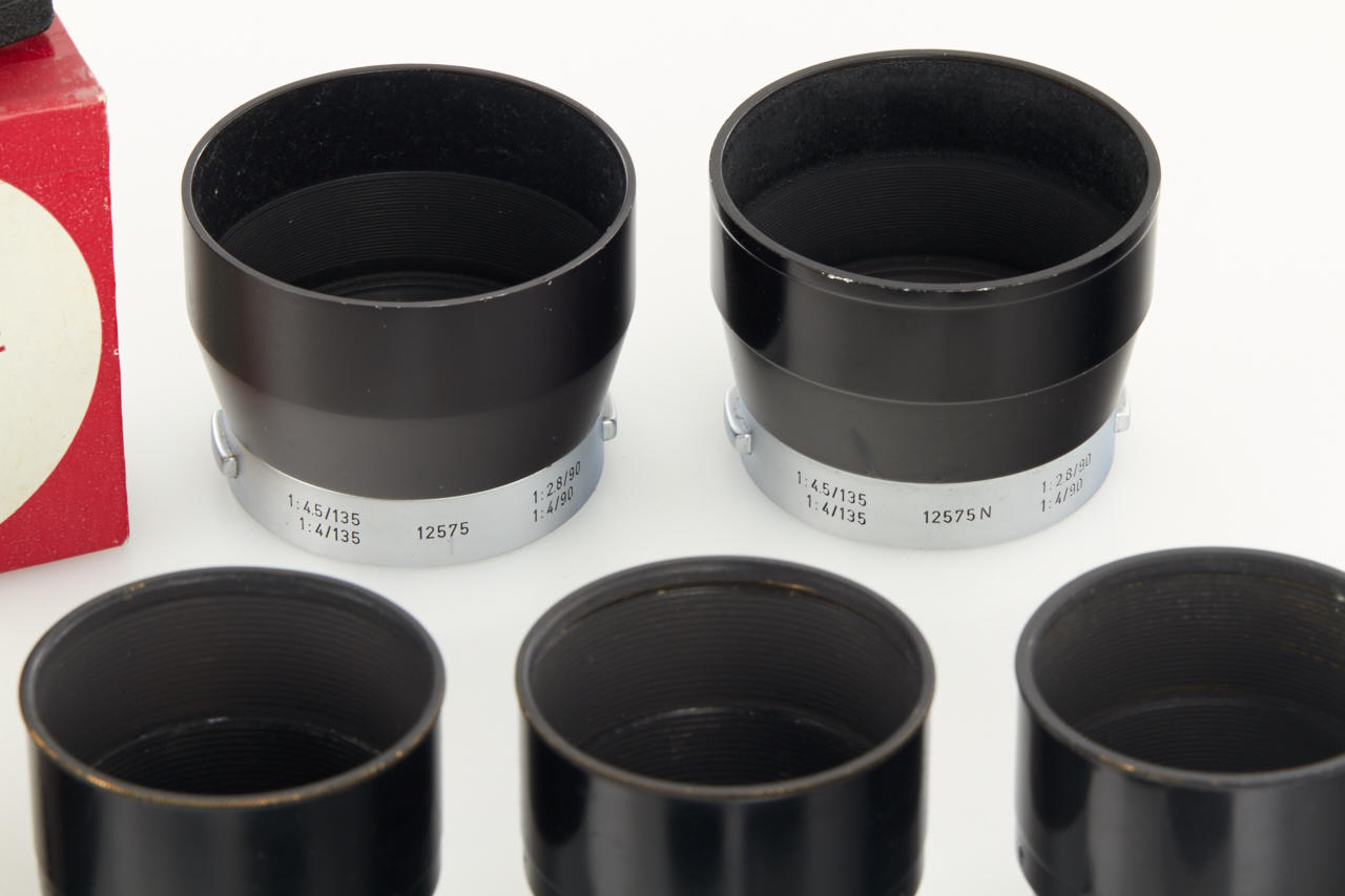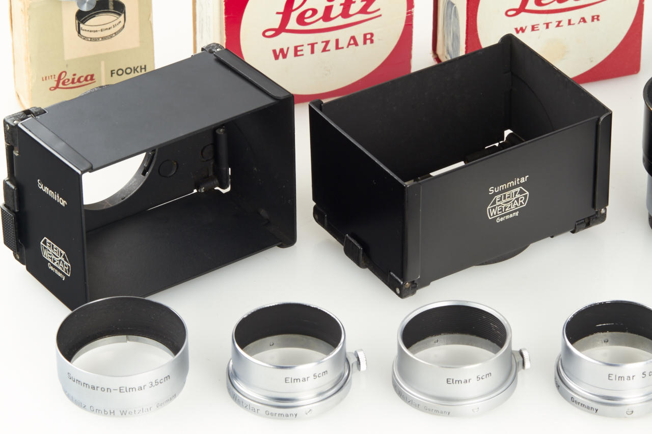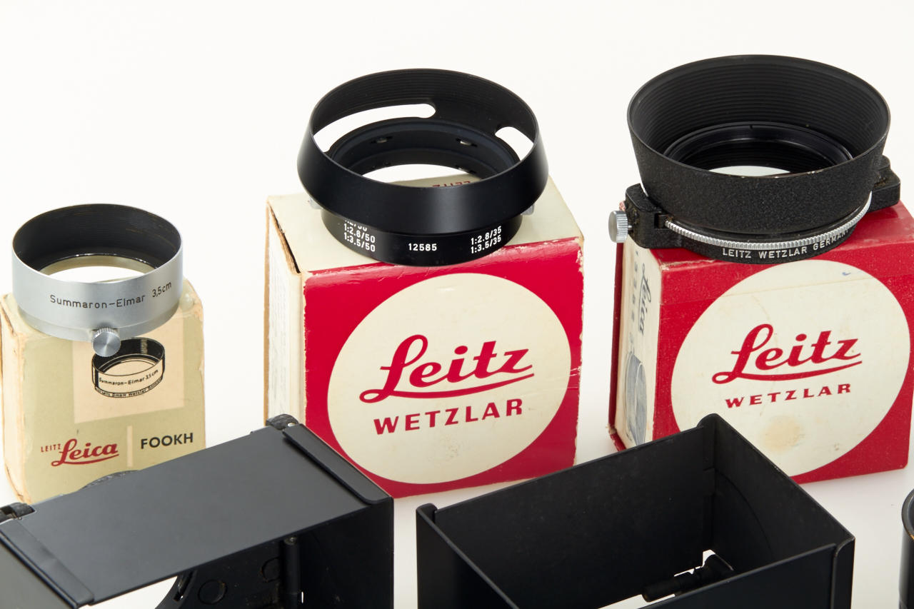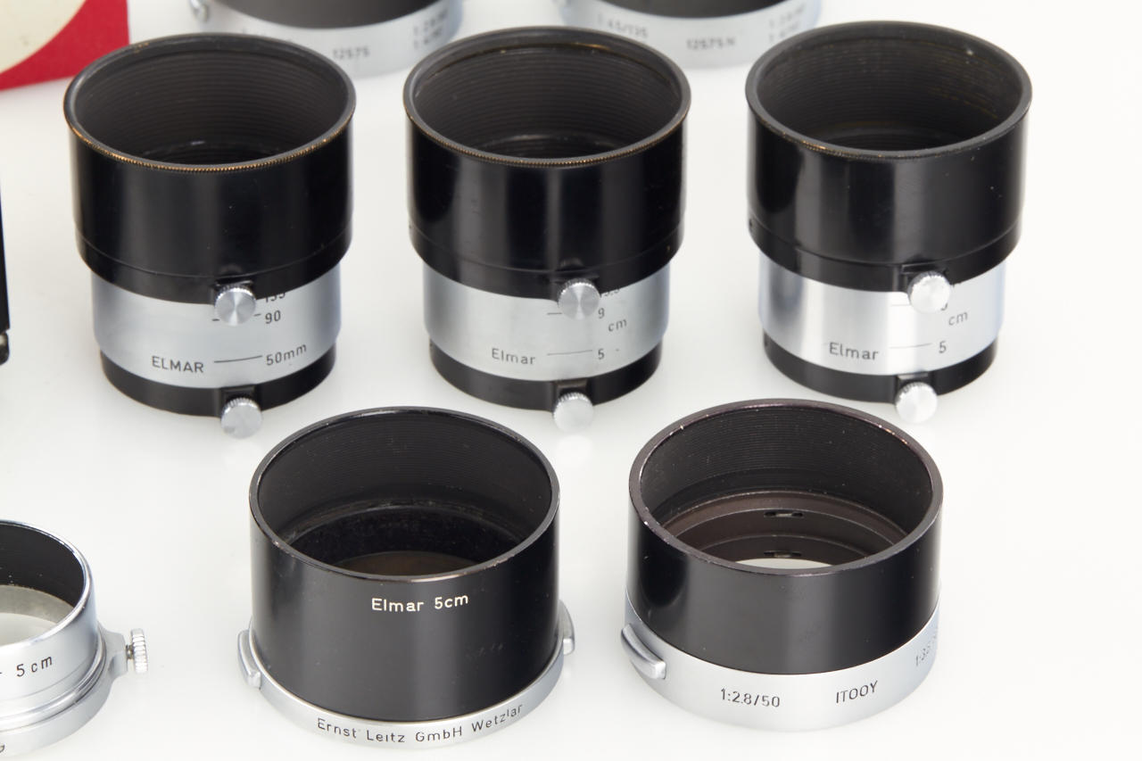 very nice lot of (16) various hoods, all in very fine - mint condition including: 3x FISON chrome, 2x FOOKH (one with box), 3x FIKUS (one from the last version), 2x SOOPD (for Summitar, 2 different versions), 2x ITOOY (early and late version, cap), 2x IUFOO (late version, both with cap), 12585 (with box and cap), 13352 (E39 hood with polarising filter, maker's box)