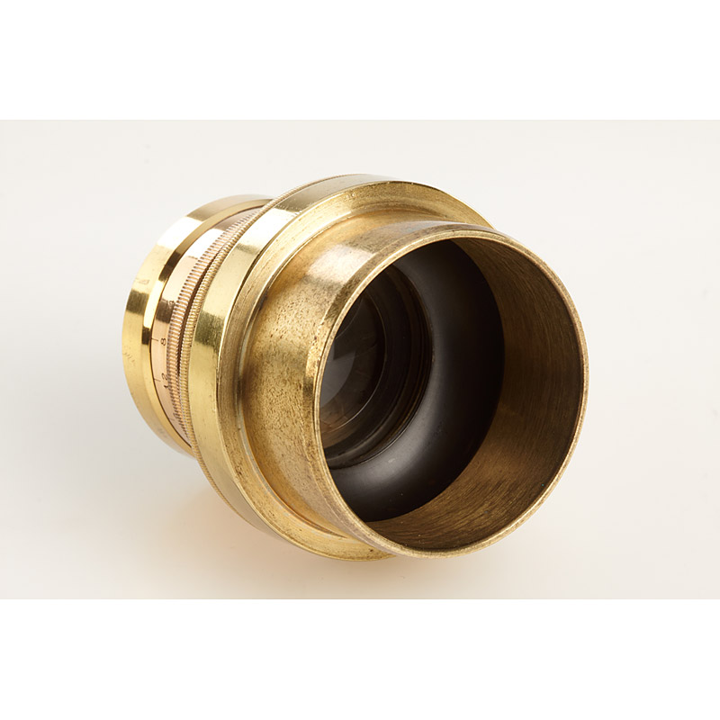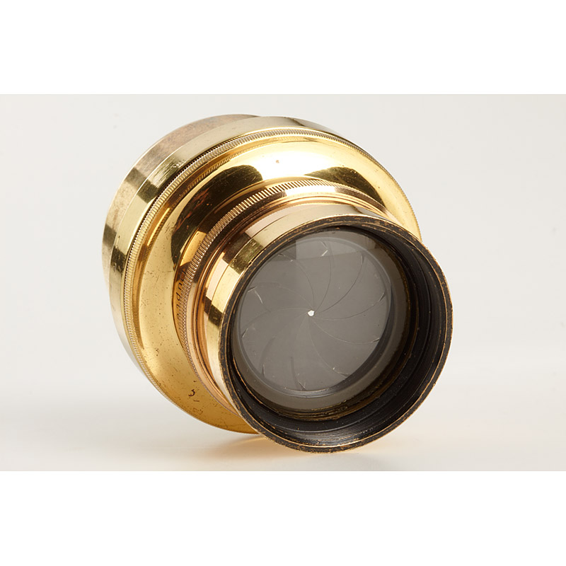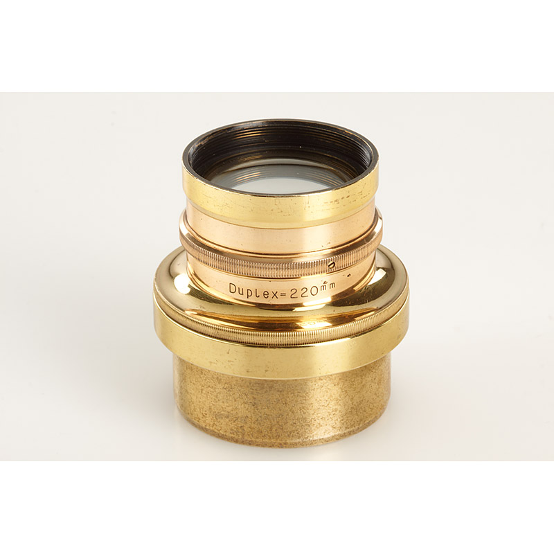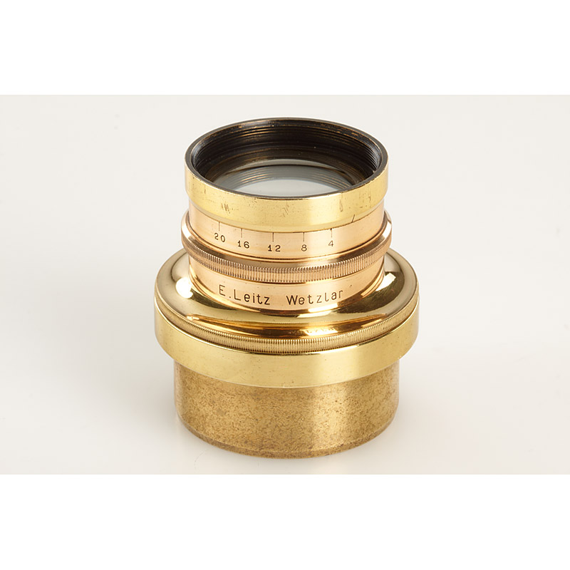 (1) 64mm brass micro lens engraved 'E.Leitz Wetzlar', iris diaphragm, cap, (2) Milar 4.5/10cm engraved: Ernst Leitz Wetzlar with adapter in shutter, (3) Periplan 210mm brass lens with iris diaphragm, (4) Duplex 220mm with iris diaphragm, special mount adapter, all lenses with good optics, also included: AYOOC waist level finder (front glass cracked) with swinging lens for 3.5cm (5)