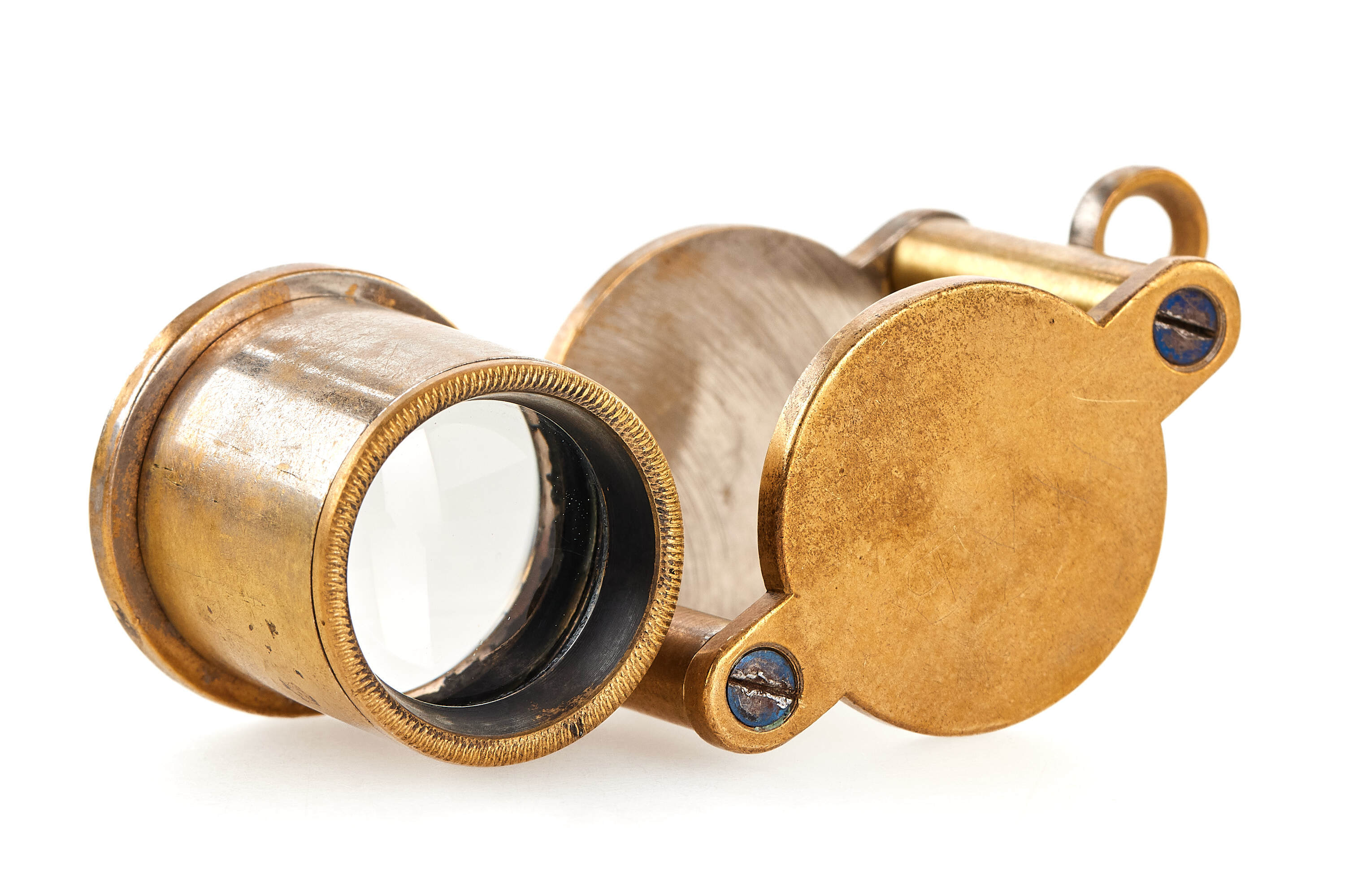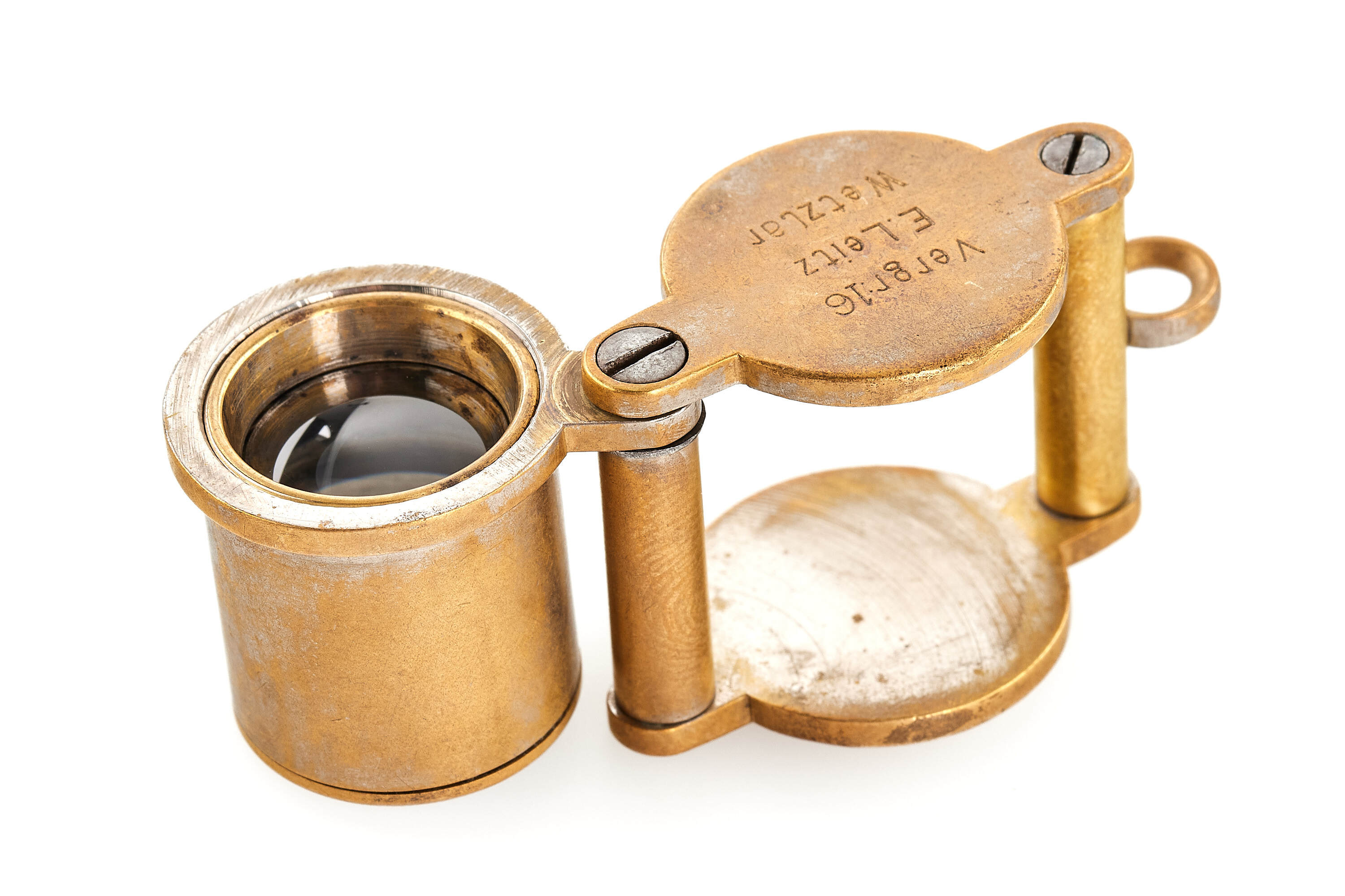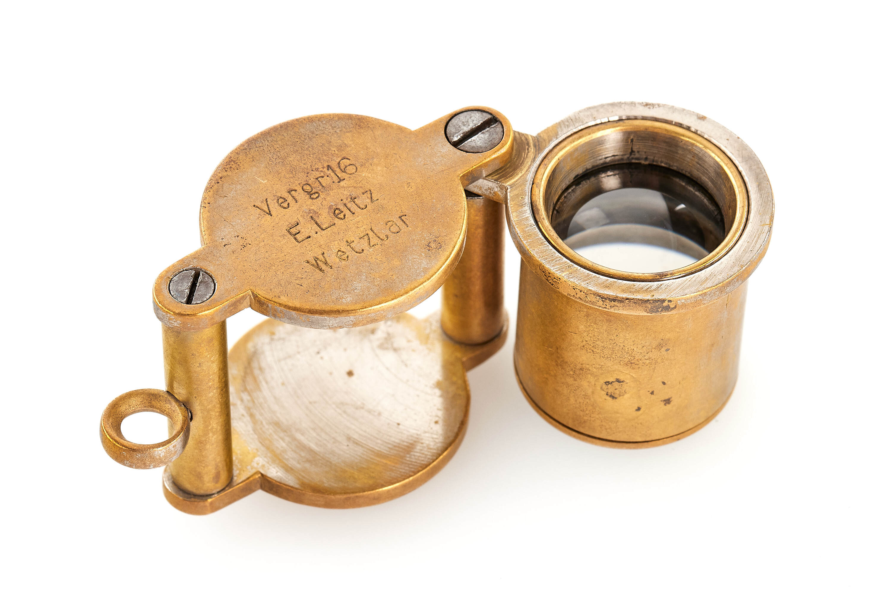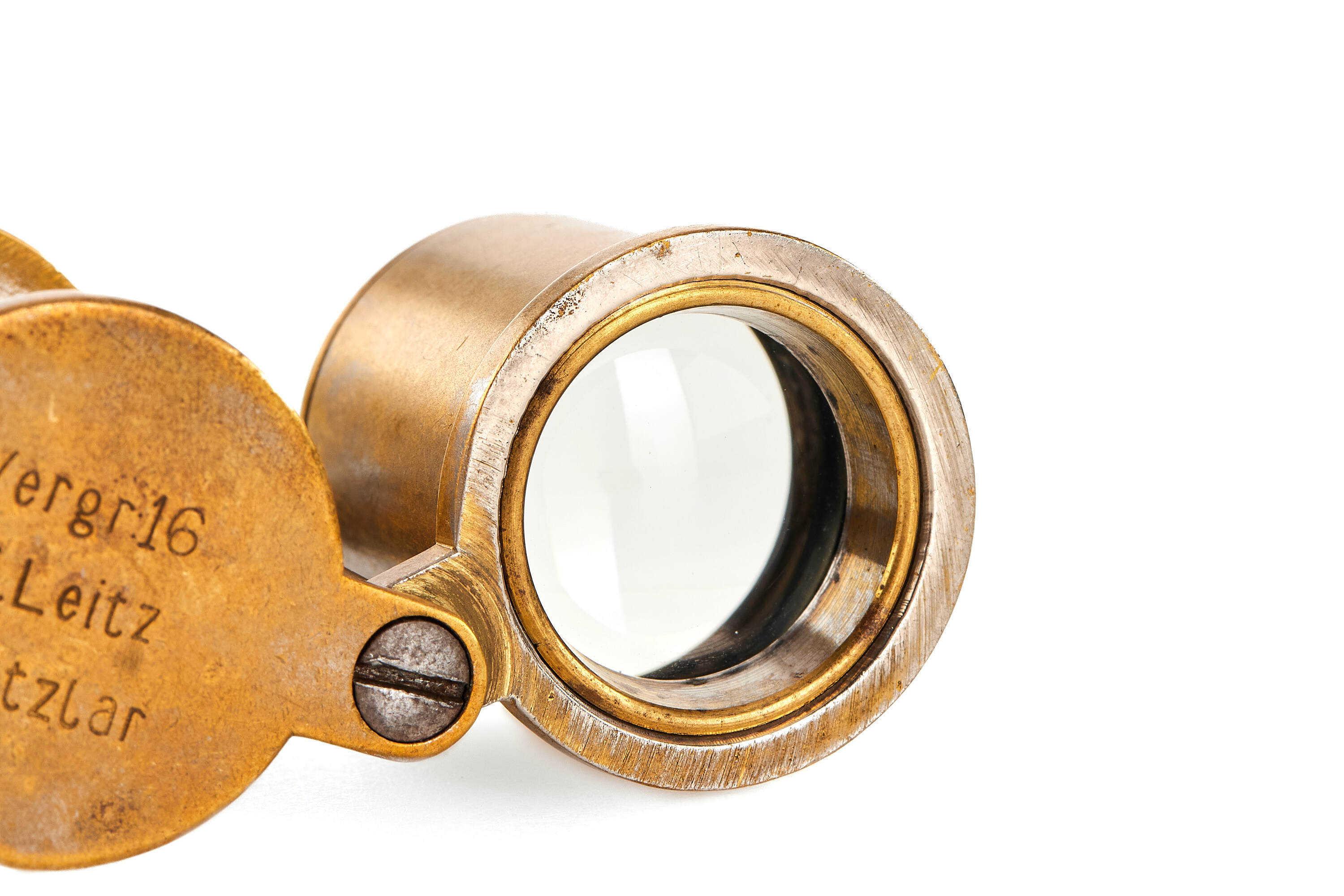 Extremely early and rare jeweller Leitz foldable loupe 16x, in chrome finish (some plating still visible), in used condition but with clean and clear optics, with 'Vergr:16 - E. Leitz - Wetzlar' engravings, Vergrößerung (German for magnification).