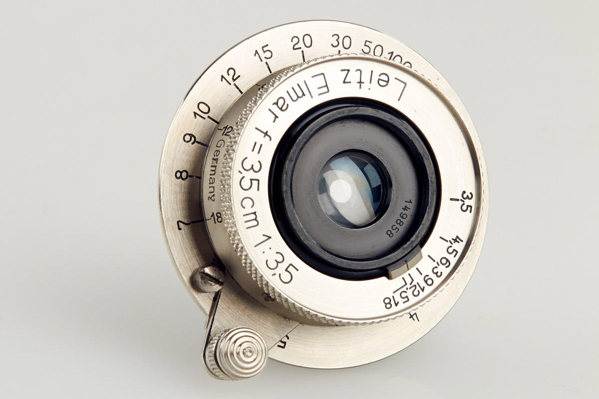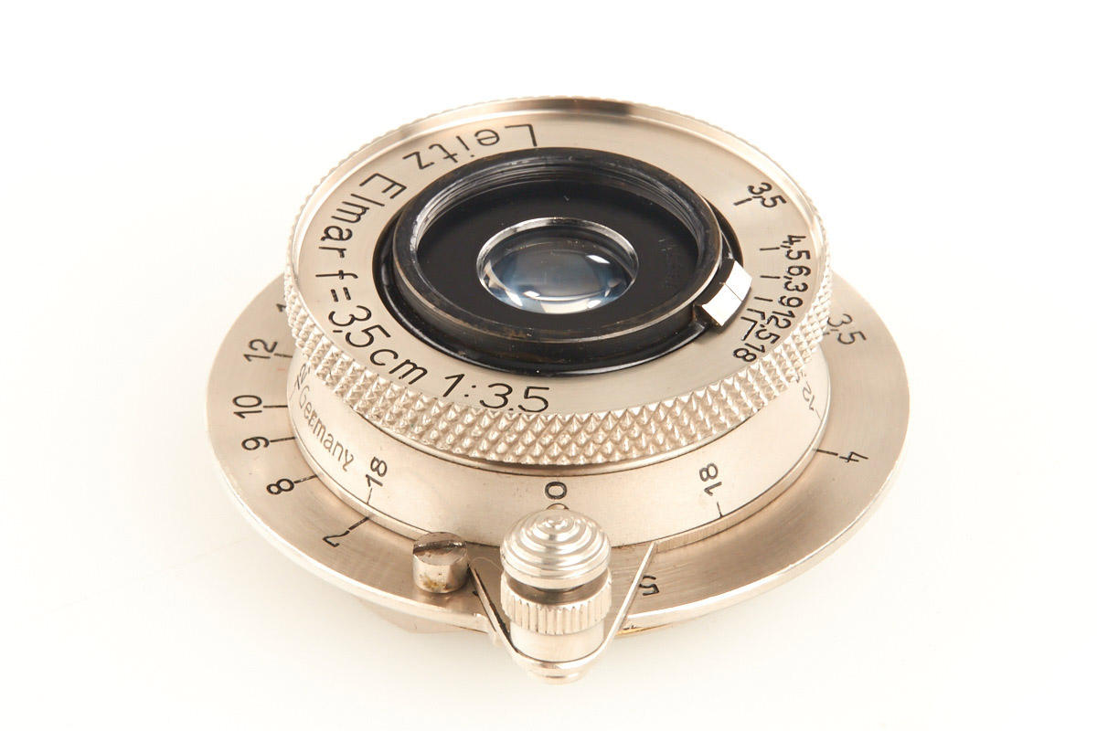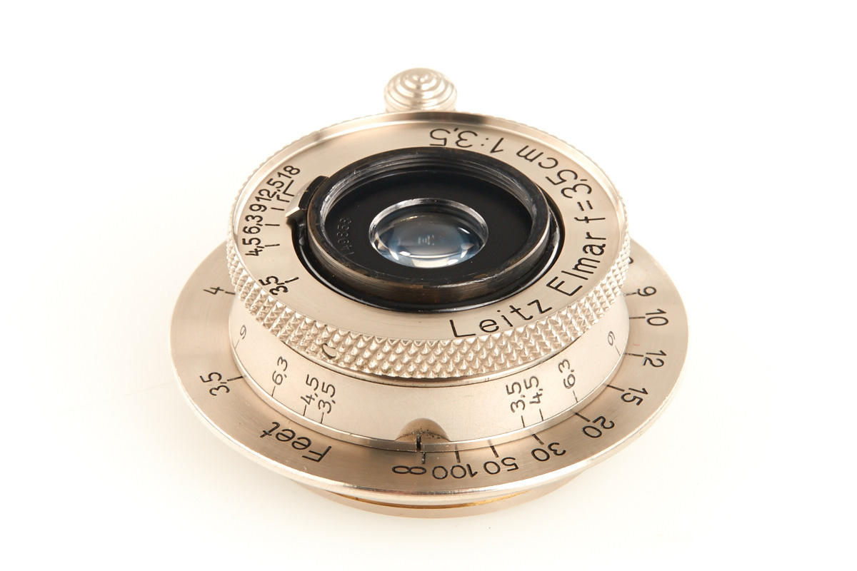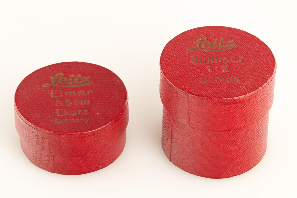 (1) near mint nickel Elmar 3.5/3.5cm no.149858 with both caps in red 'Ekurz' maker's box, black FOOKH hood, (2) coated nickel Elmar 3.5/50mm no.183121, good lenses (both caps), (3) nickel Hektor 2.5/5cm no.168342, very good lenses (rare domed cap, keeper), (4) rare rigid Summar 2/5cm no.186451 in very fine cosmetically condition (cleaning marks on front element), both original caps and red 'Sumus' maker's box (4)
