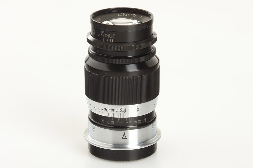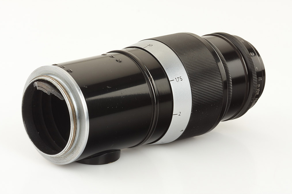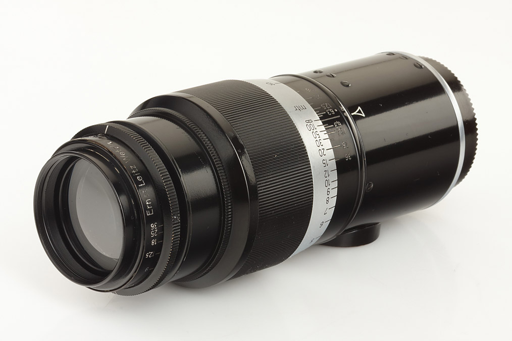 five different Leica screw mount lenses: (1) chrome Elmar 3.5/50mm no.183670 (cond. B+, caps), (2) chrome Summar 2/5cm no.246394 (cond. B, caps), (3) black/chrome Elmar 4/9cm no.457677 (cond. A/B, caps, red maker's box), (4) black/chrome Hektor 4.5/13.5cm no.485726 (cond. B/A, cap) (5) Telyt 4/200mm no.1559061 (cond. B/A, partly black painted, caps, OUBIO adapter) (5)