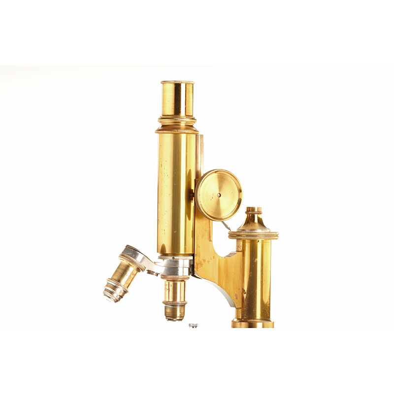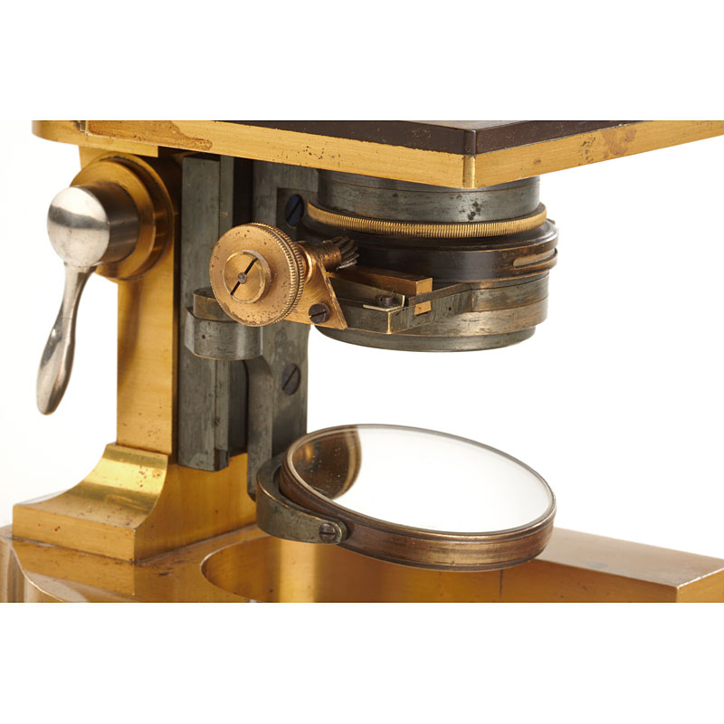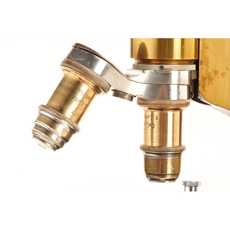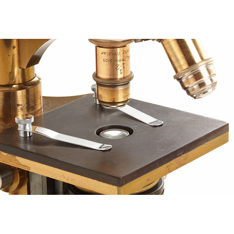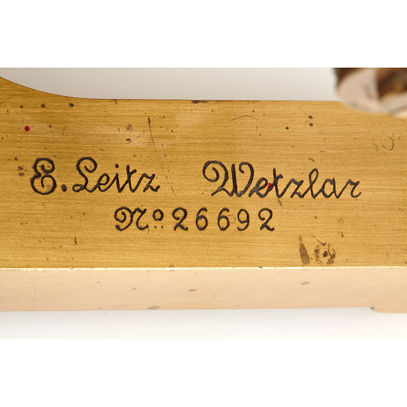 very rare and fully original very early Leitz camera for use with Leitz microscopes, mounted on an adjustable black lacquered metal stand (height 36-59cm), for 13x18cm plates with insert mask for 9x12cm, 'E.LEITZ Opt. Mech. Werkstätte WETZLAR' marked on plaque, with early Leitz microscope Stativ Ib no.26692 (c.1900) and two lenses in wooden maker's carrying case - see 'Leica A History illustrating every Model and Accessory by Paul-Henry Hasbroeck' pg. 18-20, VIDOM by Dr.Bawendi