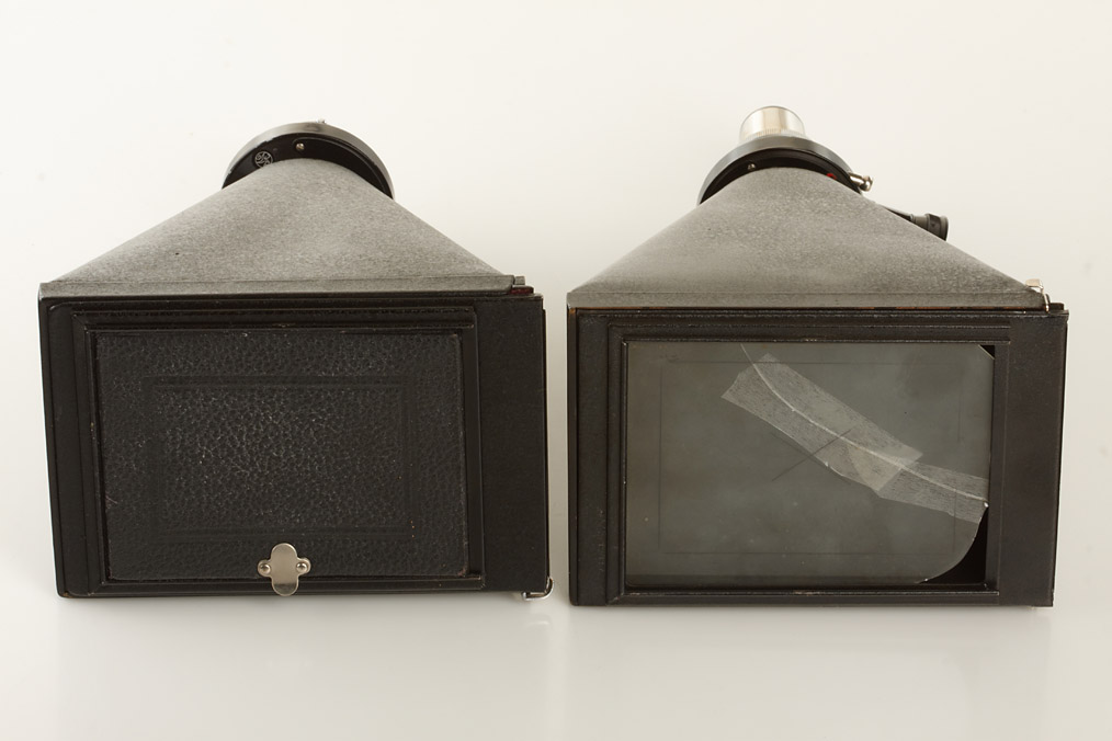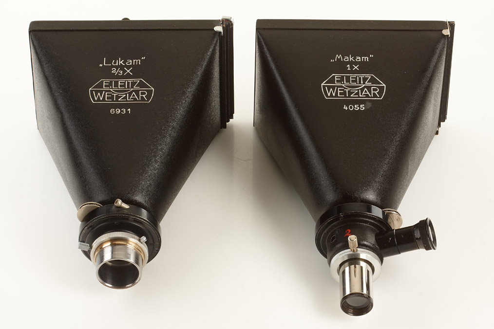 (1) Lukam 2/3x no.6931 with focusing screen adapter, shutter and cable release, (2) Makam 1x no.4055 with focusing screen adapter (screen broken), plate film holder, shutter, instructions and maker's box (2)