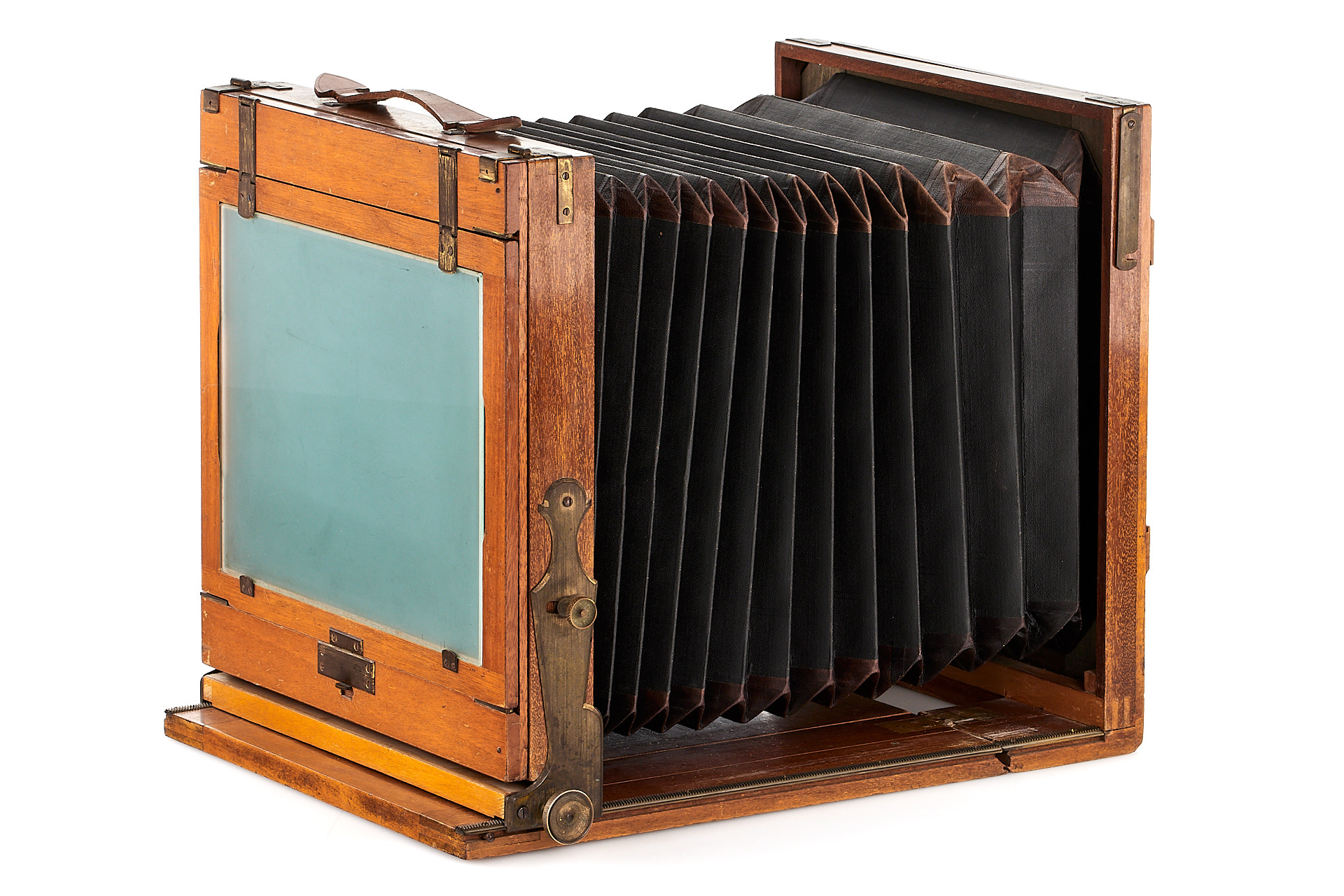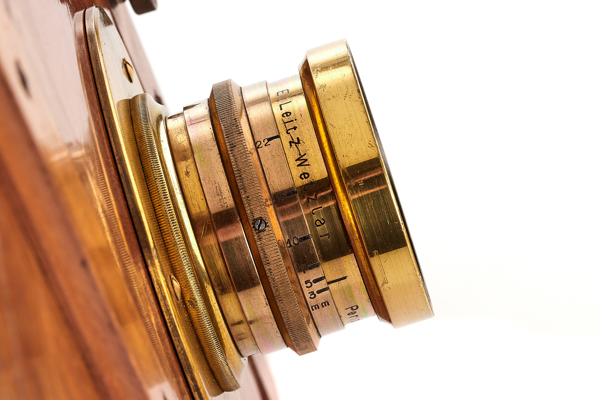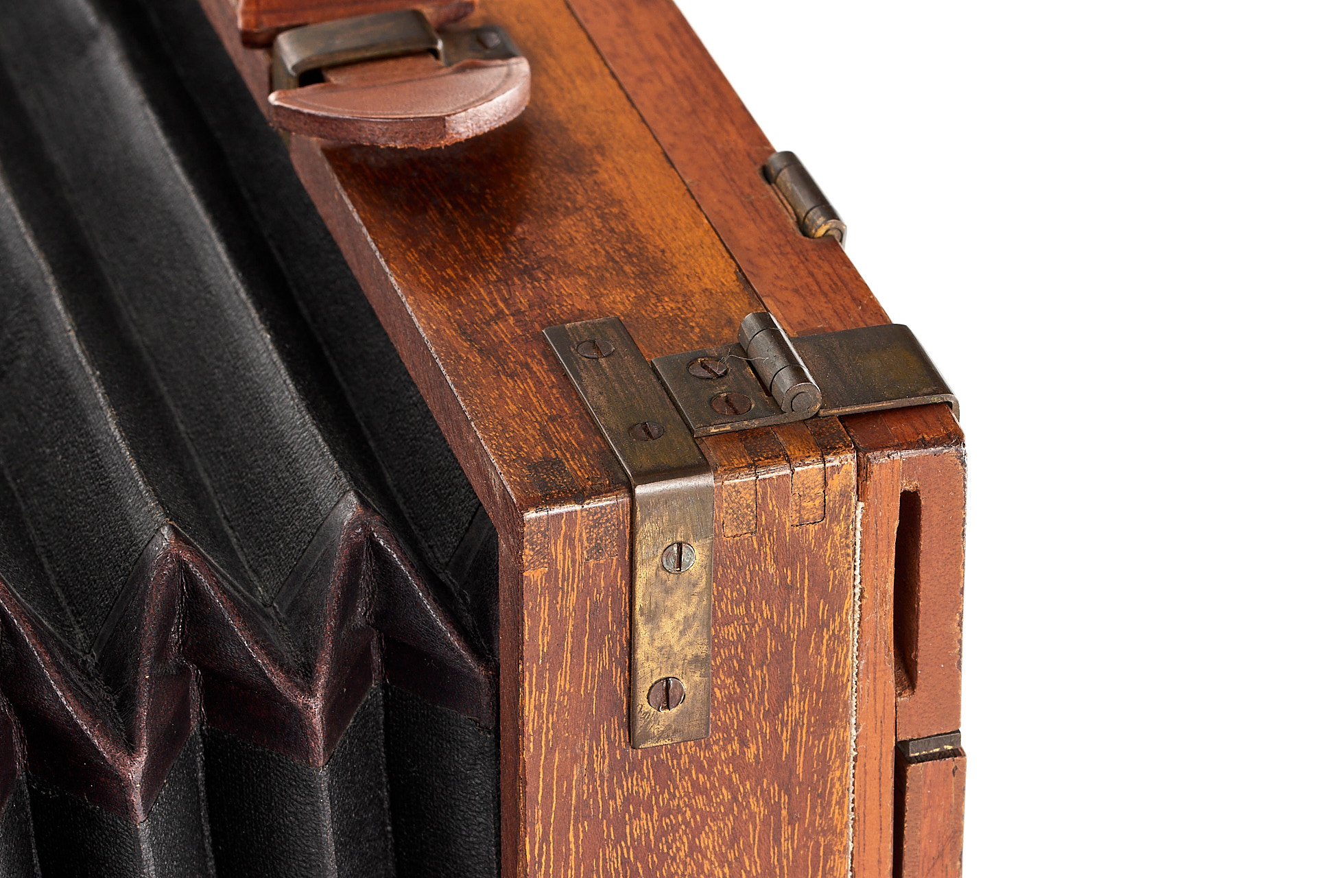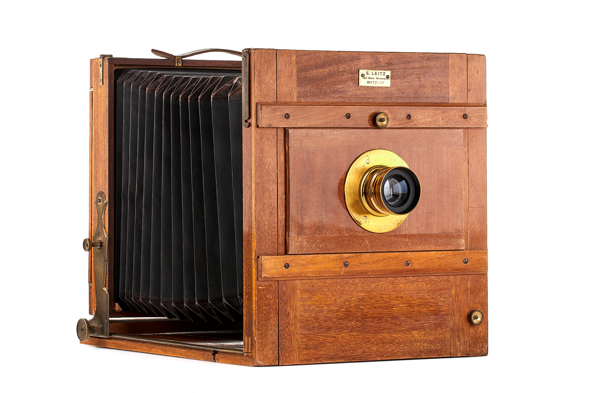 This mahogany large format camera for 18x24cm exposures on plates represents one of the earliest cameras by Ernst Leitz. Known as the Reise-Kameras, these cameras, along with the more renowned Moment camera, were featured in Leitz catalogues circa 1905 to 1910. This is, however, the first time in the history of our auction house that we can offer an example for sale. It shows the features typical for the cameras from this time period, like the folding bed, leather bellows and the focusing screen that can be used in landscape and portrait orientation.