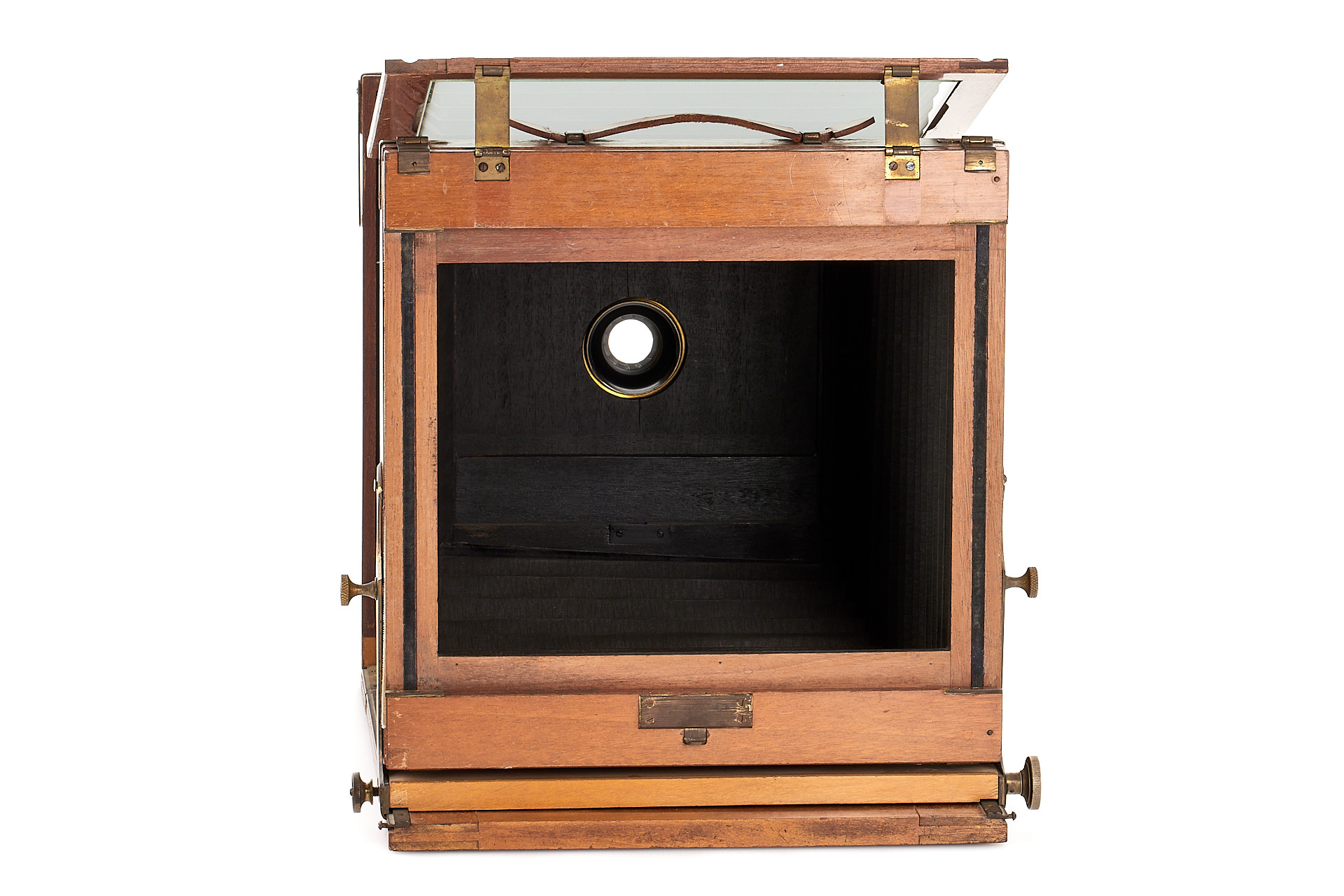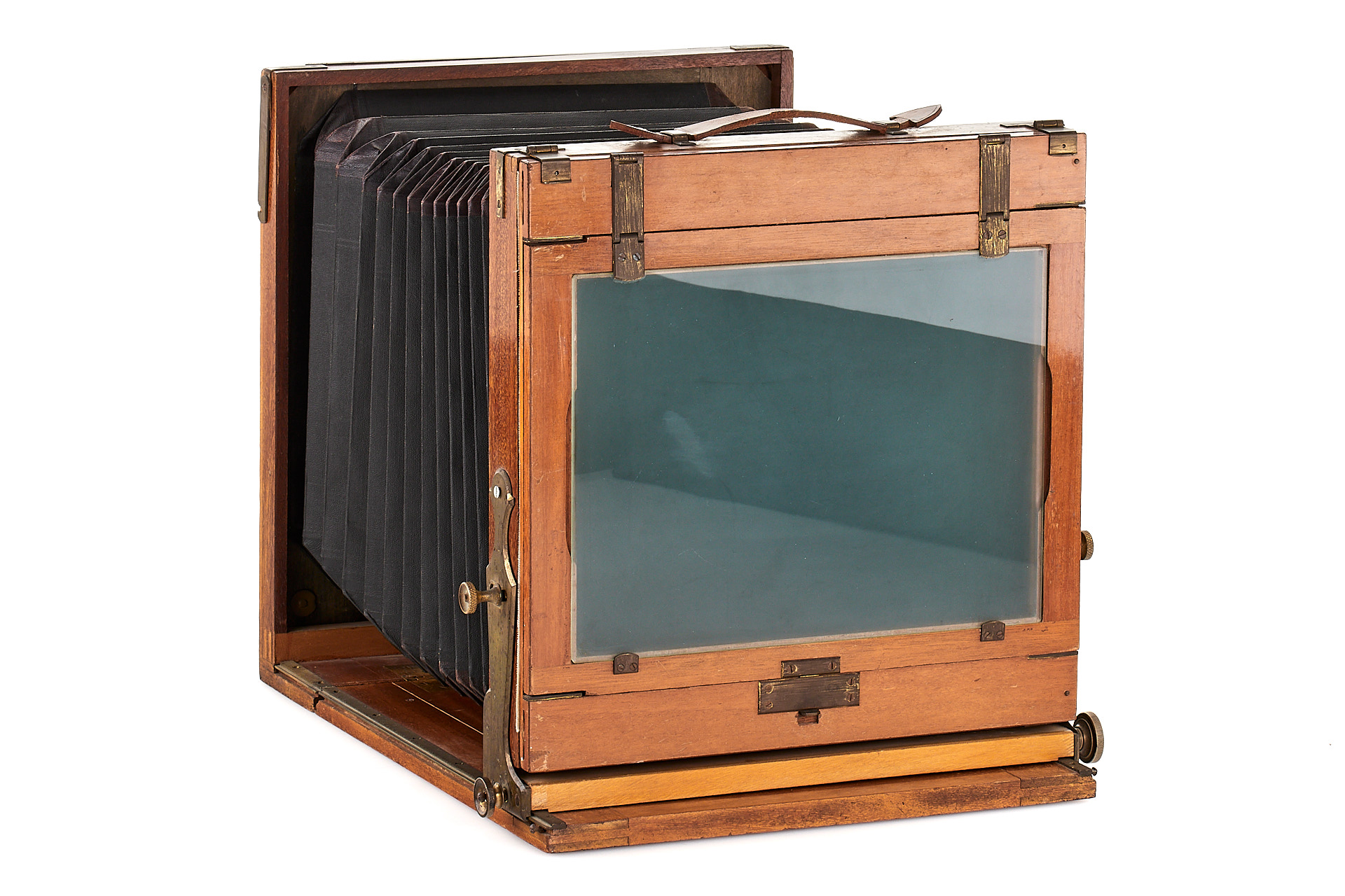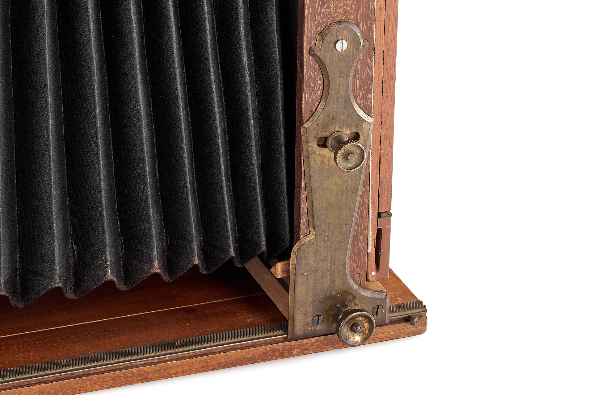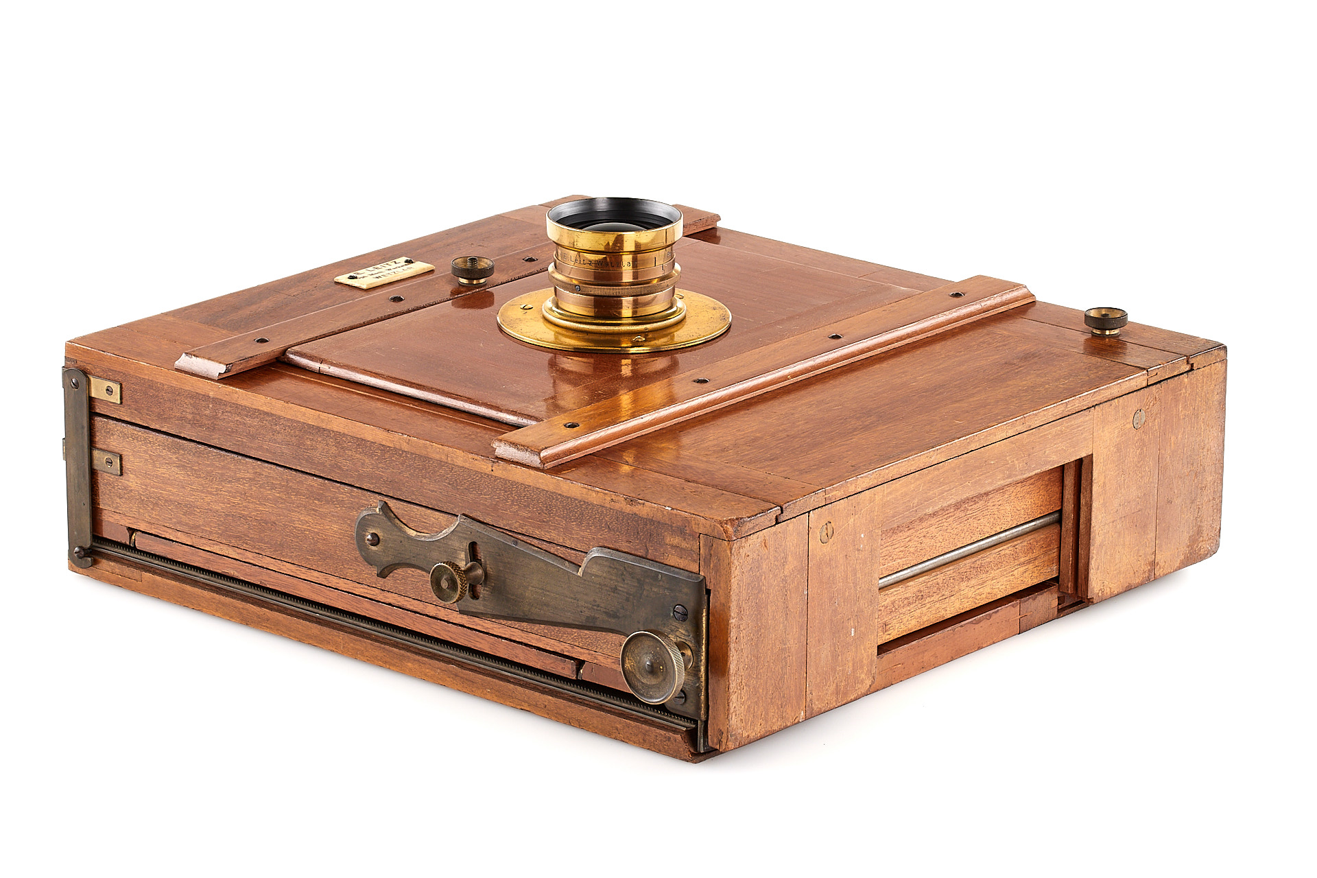 This mahogany large format camera for 18x24cm exposures on plates represents one of the earliest cameras by Ernst Leitz. Known as the Reise-Kameras, these cameras, along with the more renowned Moment camera, were featured in Leitz catalogues circa 1905 to 1910. This is, however, the first time in the history of our auction house that we can offer an example for sale. It shows the features typical for the cameras from this time period, like the folding bed, leather bellows and the focusing screen that can be used in landscape and portrait orientation.