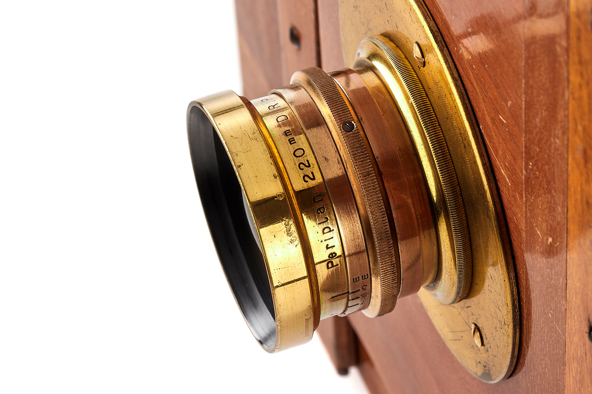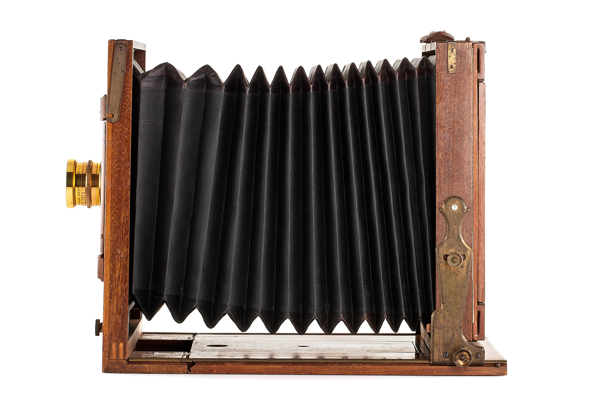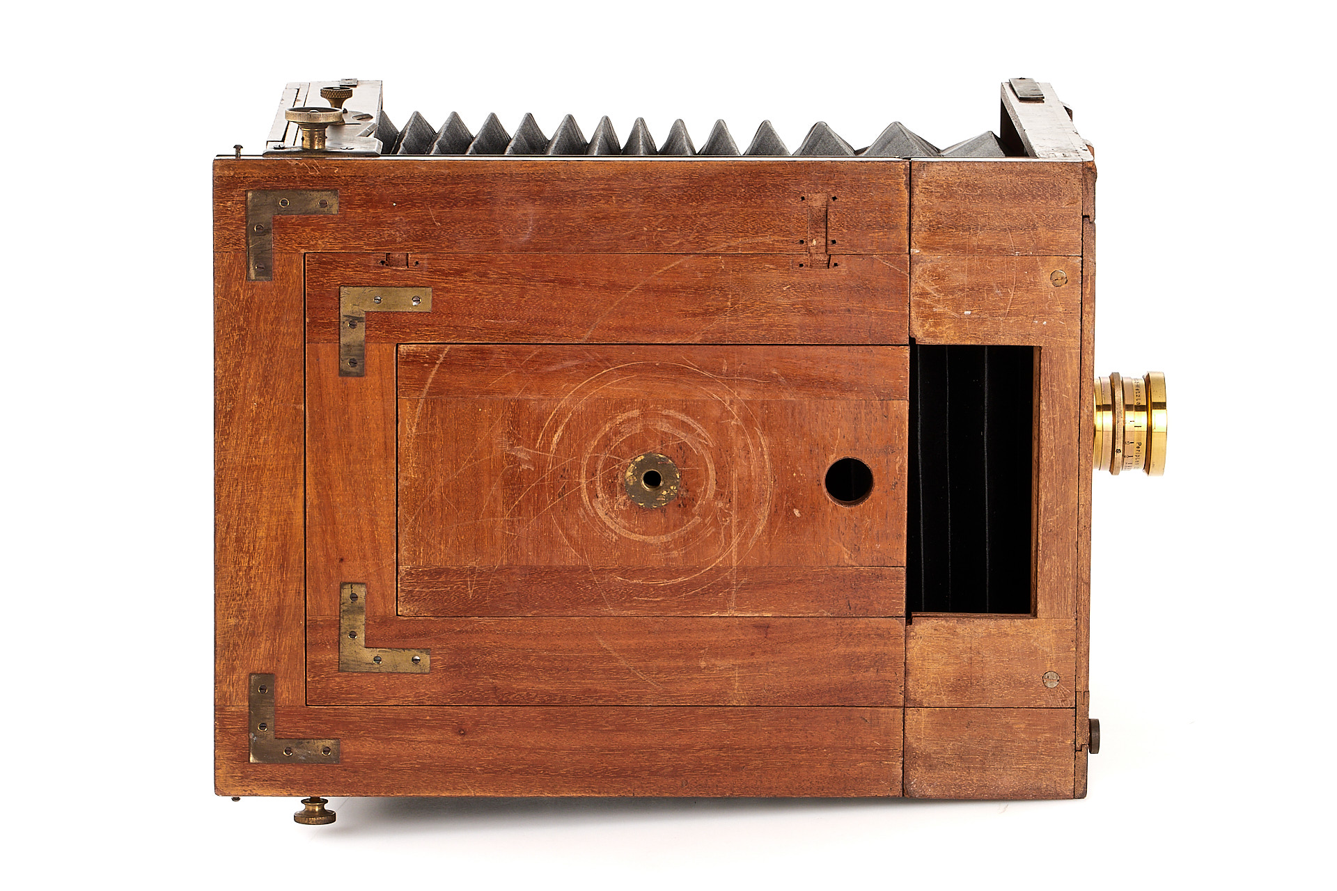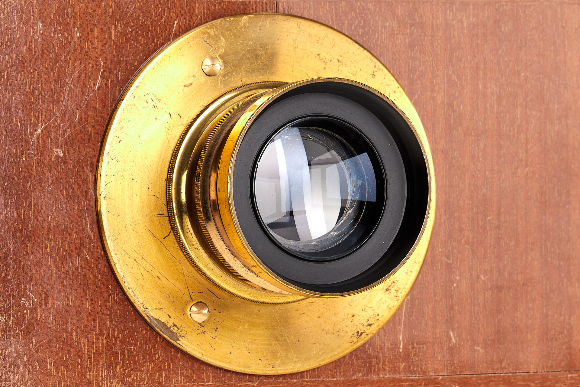 This mahogany large format camera for 18x24cm exposures on plates represents one of the earliest cameras by Ernst Leitz. Known as the Reise-Kameras, these cameras, along with the more renowned Moment camera, were featured in Leitz catalogues circa 1905 to 1910. This is, however, the first time in the history of our auction house that we can offer an example for sale. It shows the features typical for the cameras from this time period, like the folding bed, leather bellows and the focusing screen that can be used in landscape and portrait orientation.